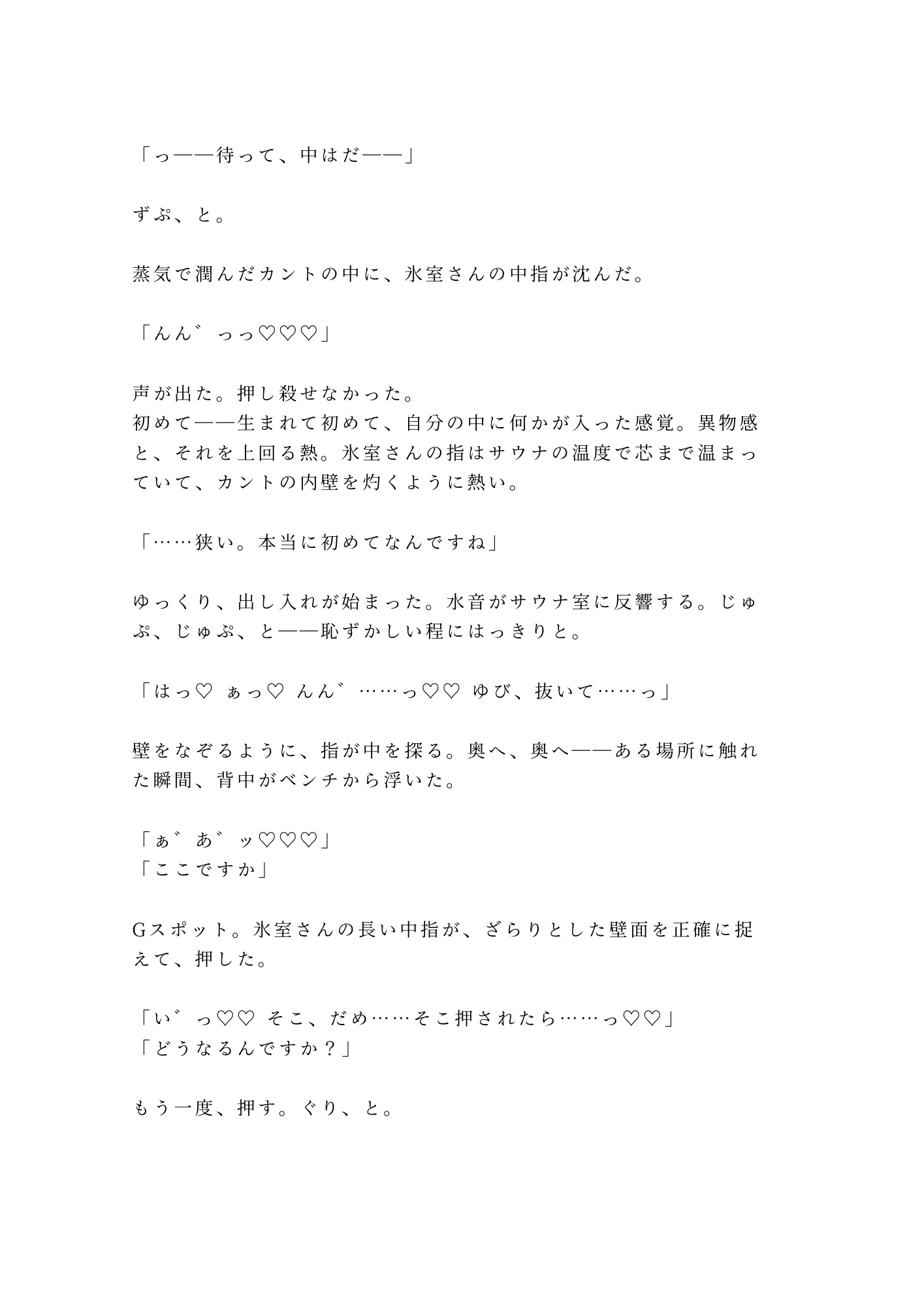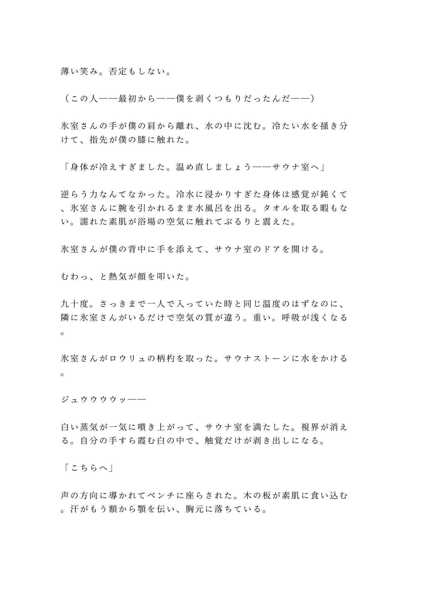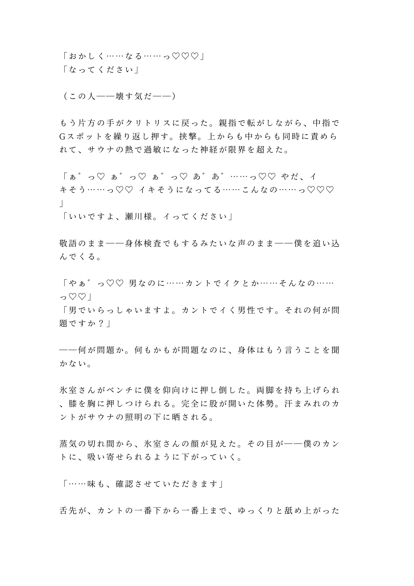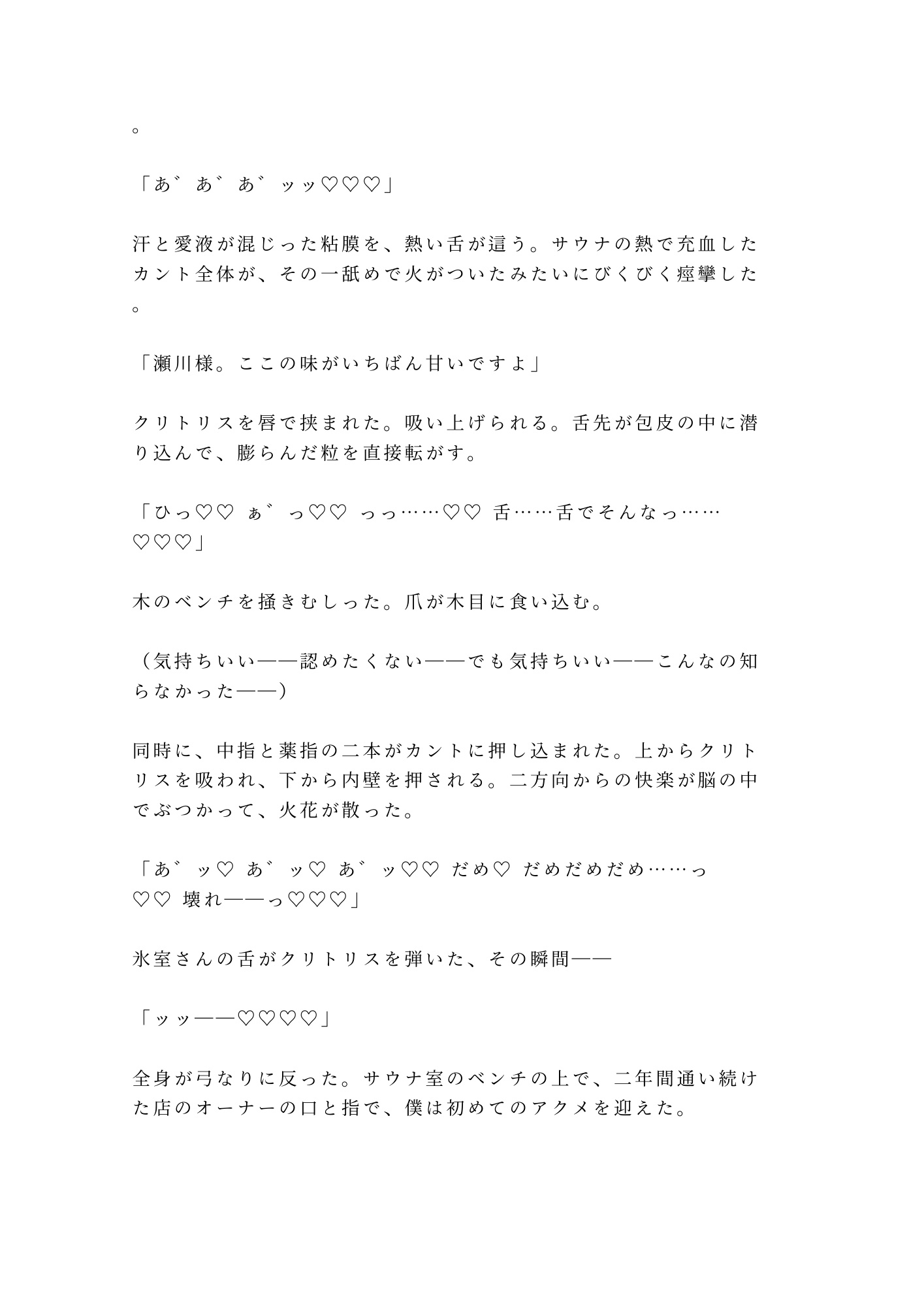 二年間、個室サウナだけを使い続けた常連客。その夜に限って個室は全室メンテナンス中だと告げられた。仕方なく入った大浴場の水風呂で、タオルが浮いた。透明な冷水の底に晒されたカントを、オーナーの氷室が覗き込んでいる。「見えていますよ、瀬川様」――全て仕組まれていた夜に、サウナで蒸され水風呂で締められ犯されるBLカントボーイ官能小説。