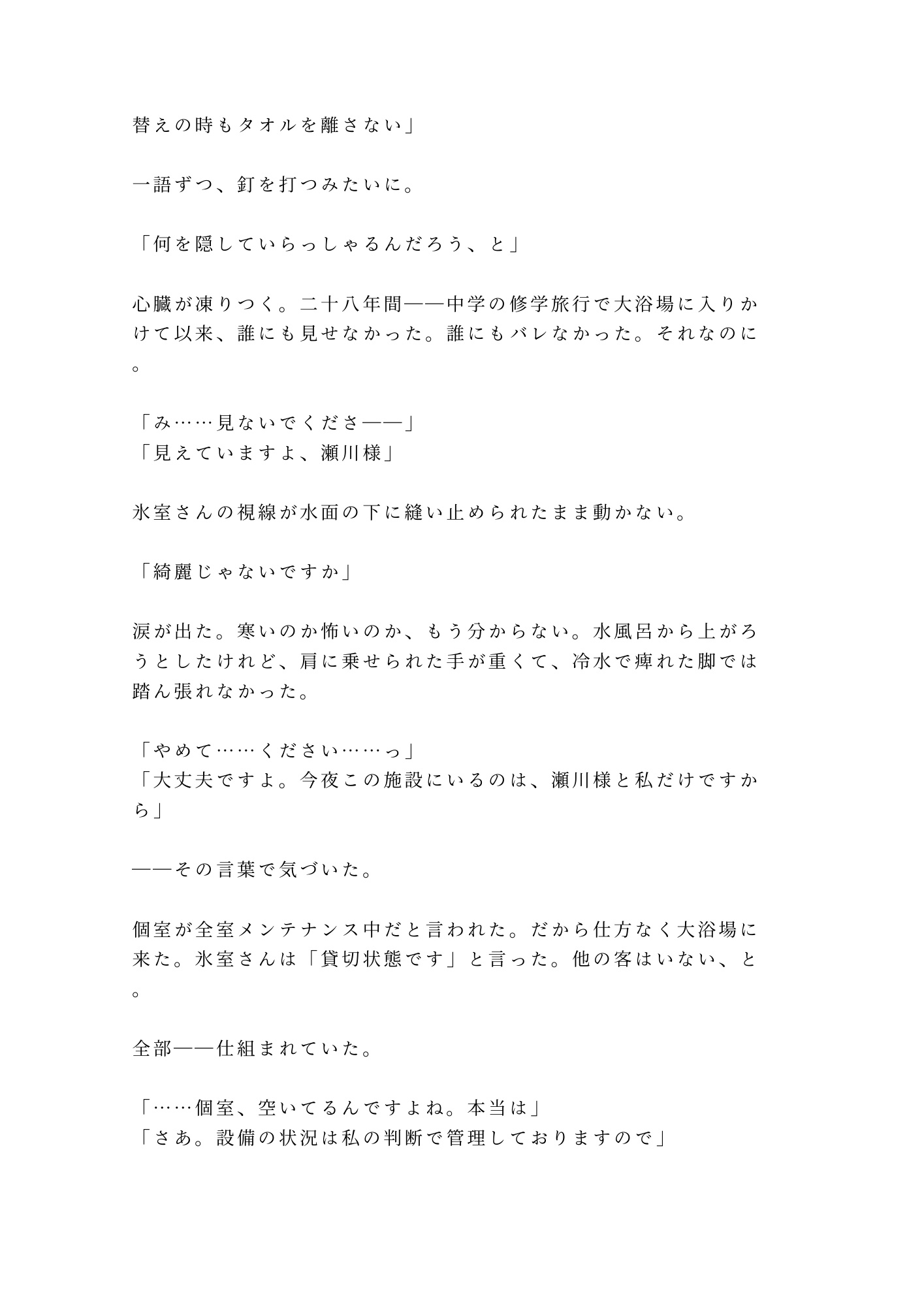 二十八歳の瀬川は、二年間このサウナに通い続けてきた。必ず個室を指定し、大浴場は絶対に使わず、着替えの時もタオルを離さない。隠していたのは、男の身体についたカントだ。