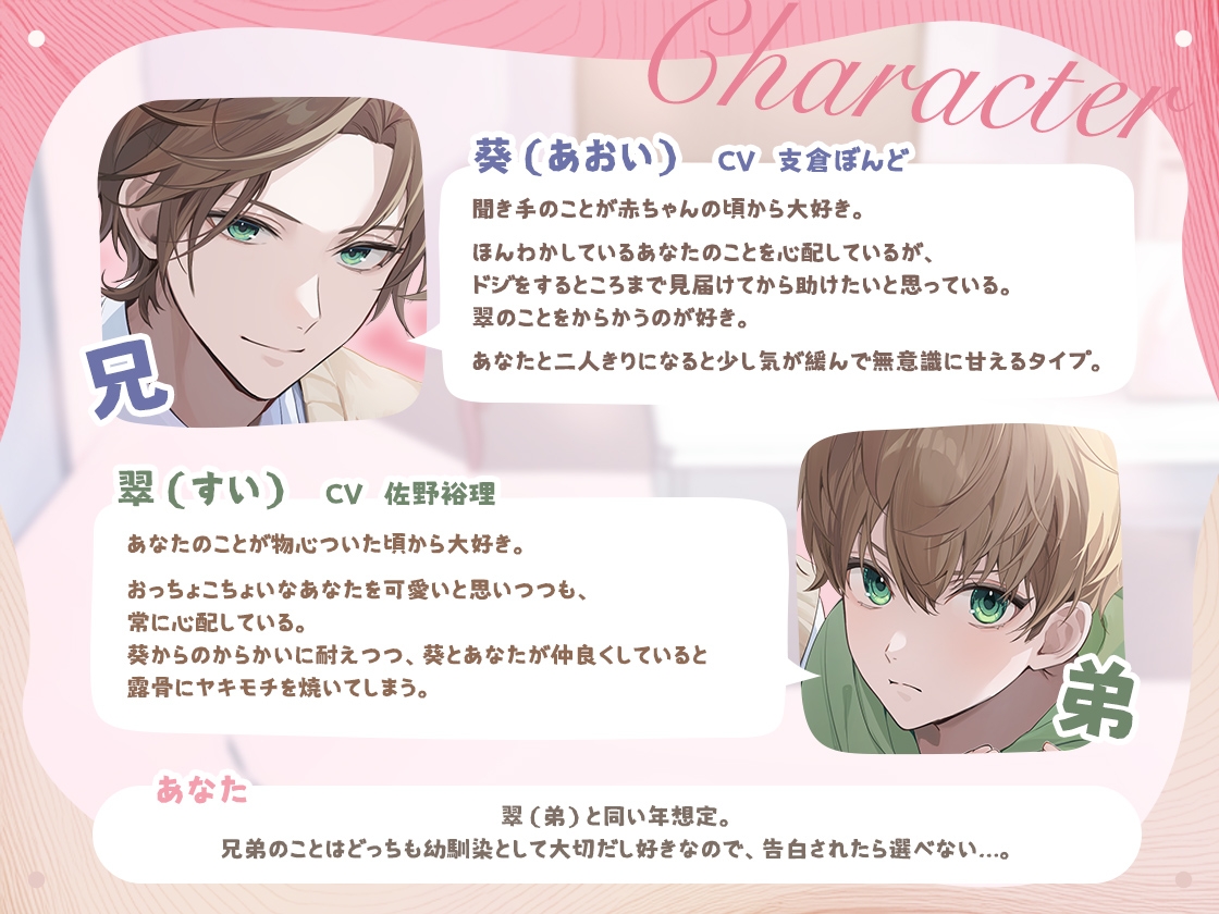 一人暮らしを始めたばかりの聞き手の家に突然訪問してきた幼馴染の兄弟。 兄弟曰く、「心配で見に来た」とのこと。 兄の葵からは妹のように心配されるのがわかるが、同い年の翠にまで心配されるなんて心外だと言う聞き手。「リラックス出来るようにマッサージでもしてあげる」と葵から唐突に癒しの提案をされて……。CV.支倉ぼんど、CV.佐野裕理