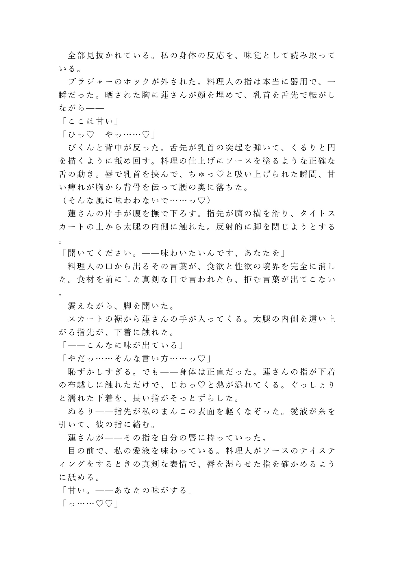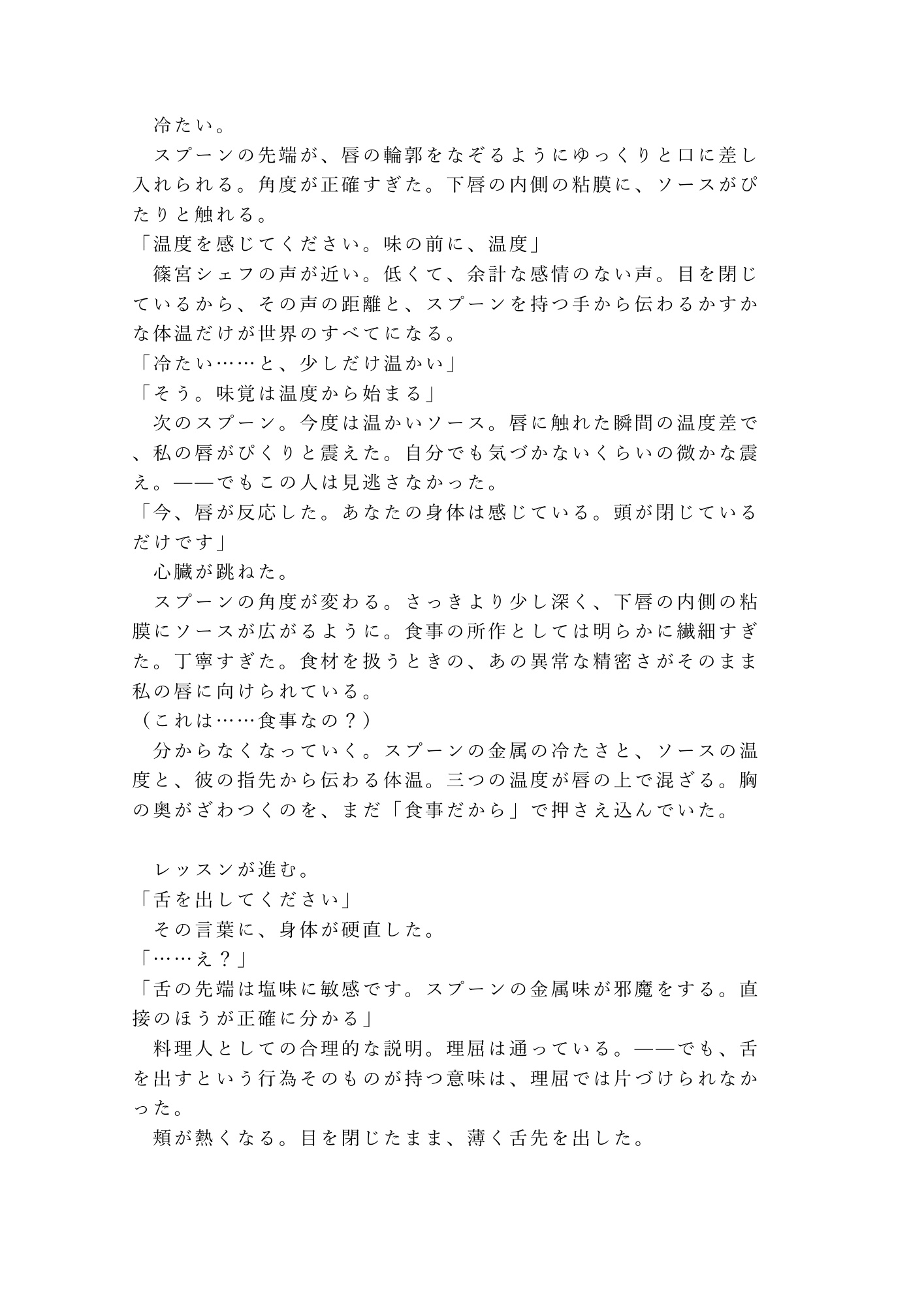 仕事で「美味しい」を失った味覚評価のプロ・莉子。友人に連れ出された完全予約制フレンチで、星付きシェフ・篠宮蓮にたった一口で秘密を見抜かれる。「あなたの身体は感じている。頭が閉じているだけです」——コースを中止し始まった味覚のレッスンは、スプーンから指先へ、唇から舌へと距離を詰め、やがて味覚ごと身体の奥を甘く蕩かしていく。食×官能の完全予約制トリップ。