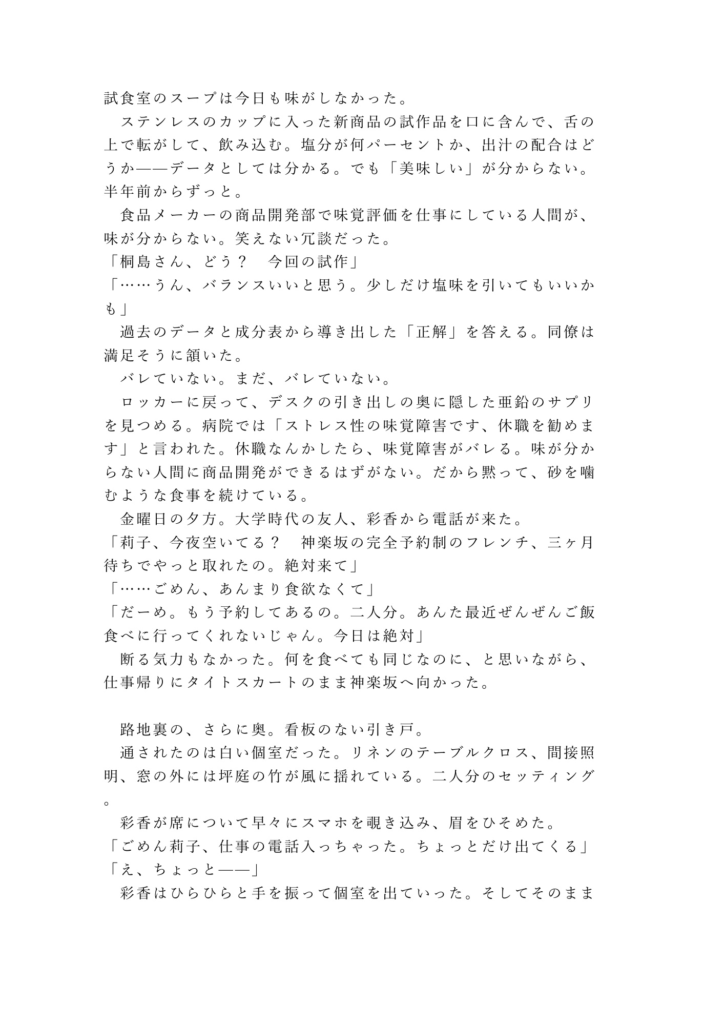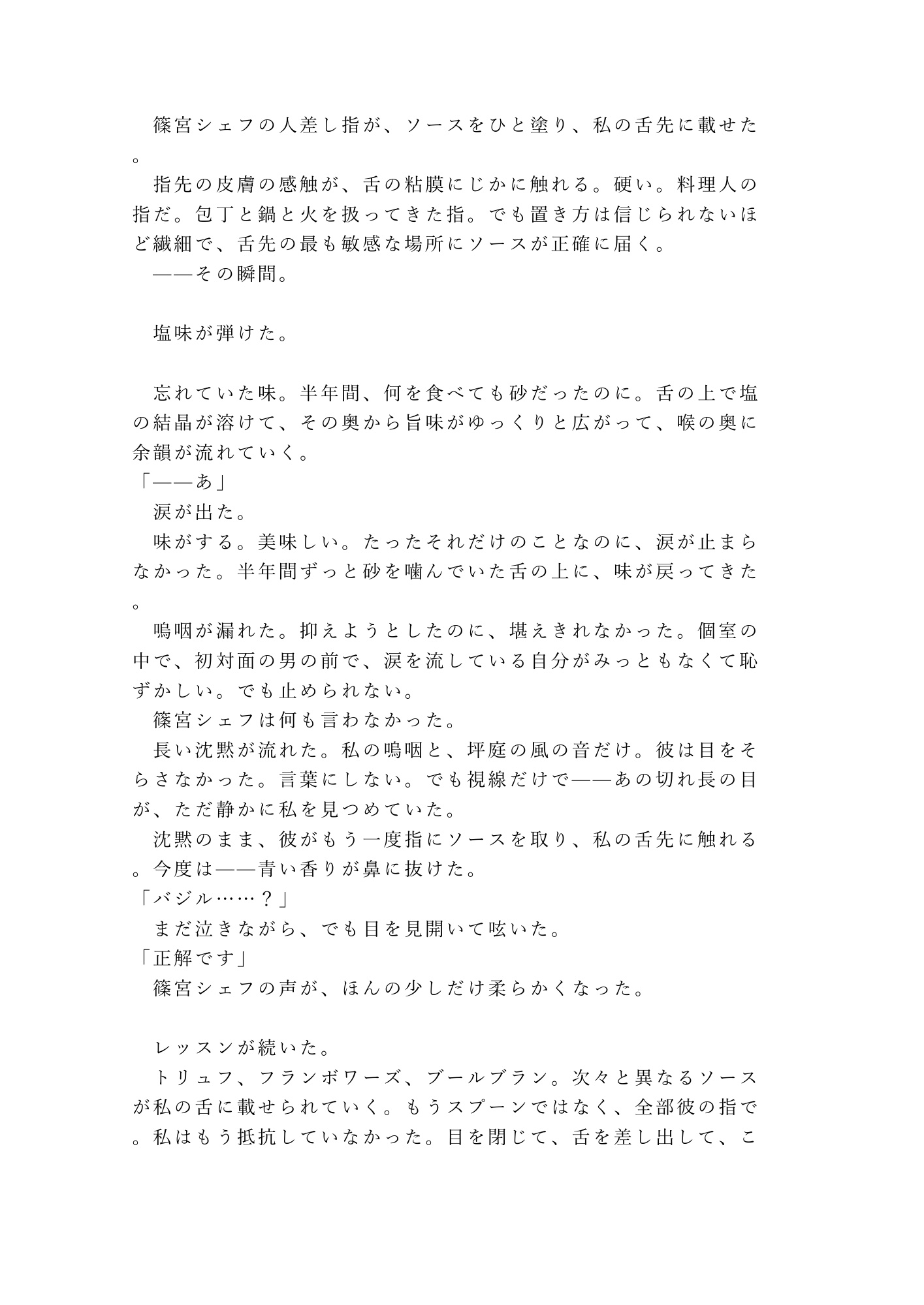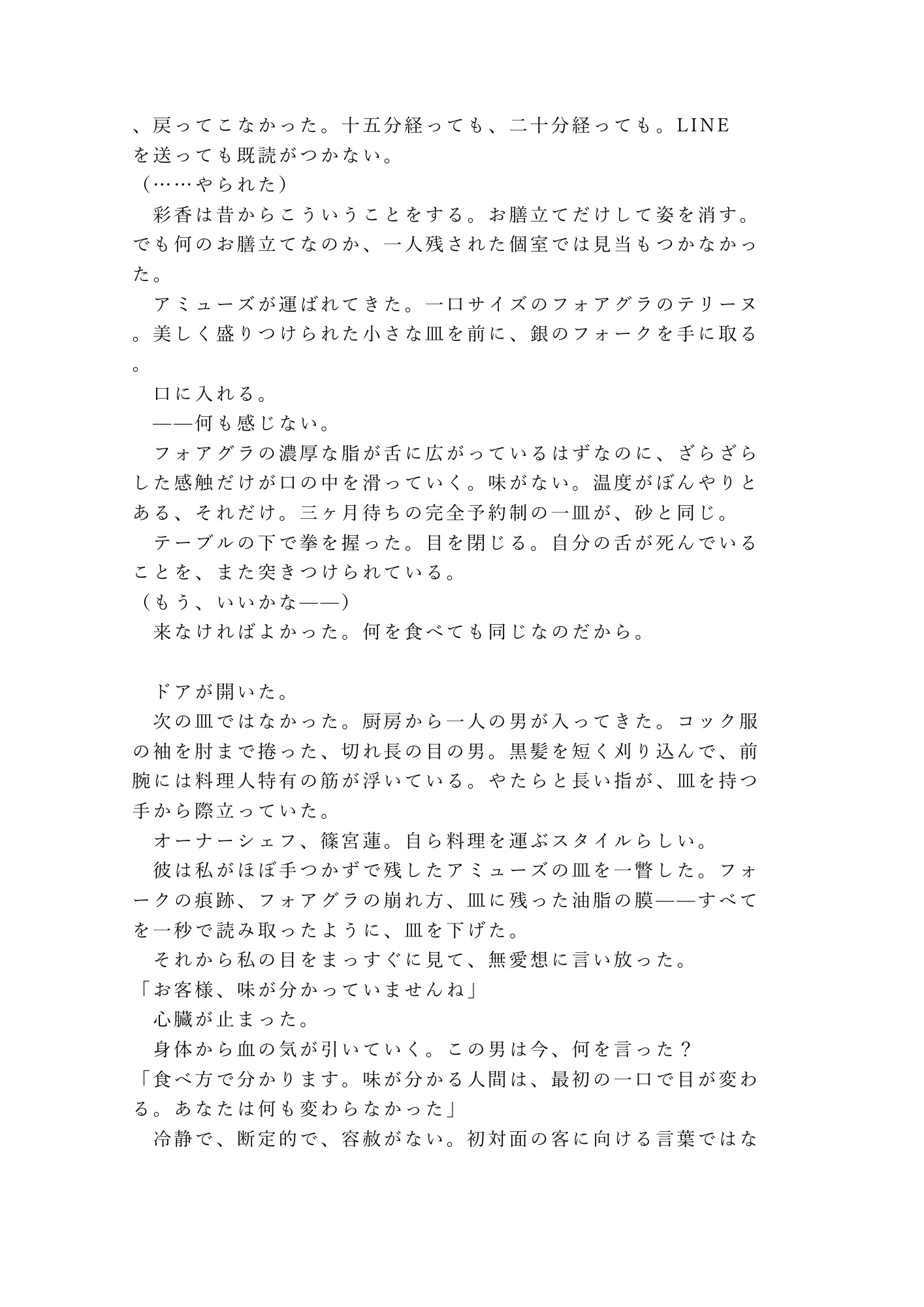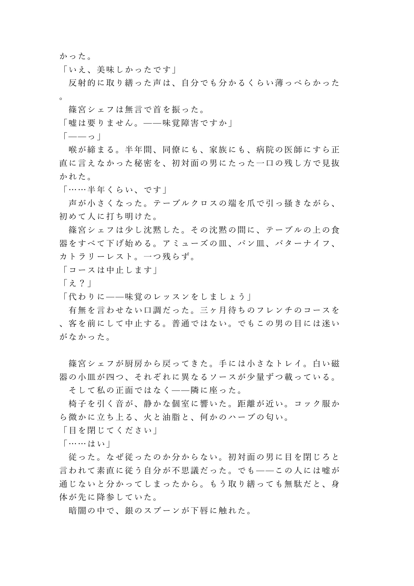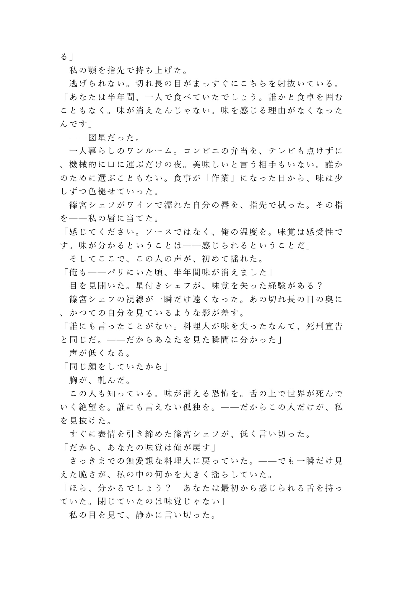 仕事のせいで「美味しい」を失った食品メーカーの開発担当・莉子。味覚障害を誰にも打ち明けられないまま、砂を噛むような日々を送っていた彼女は、友人に半ば強引に連れ出された神楽坂の完全予約制フレンチで、星付きオーナーシェフ・篠宮蓮と出会う。
