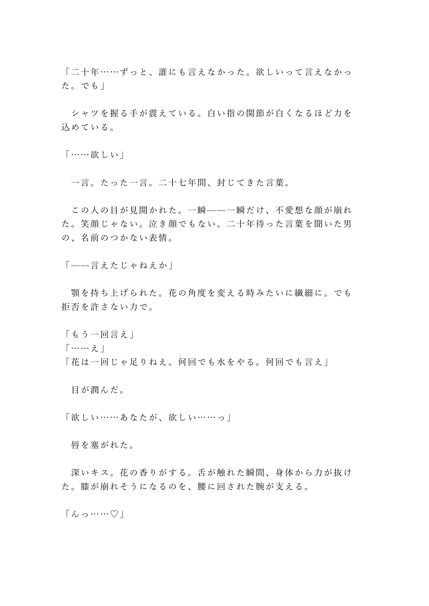 花に触れる時だけ別人のように繊細になる、あの大きな手。その指先が鎖骨をなぞり、涙を拭い、二十年間封じてきた「欲しい」という言葉を、一枚ずつ花びらを開くように暴いていく。