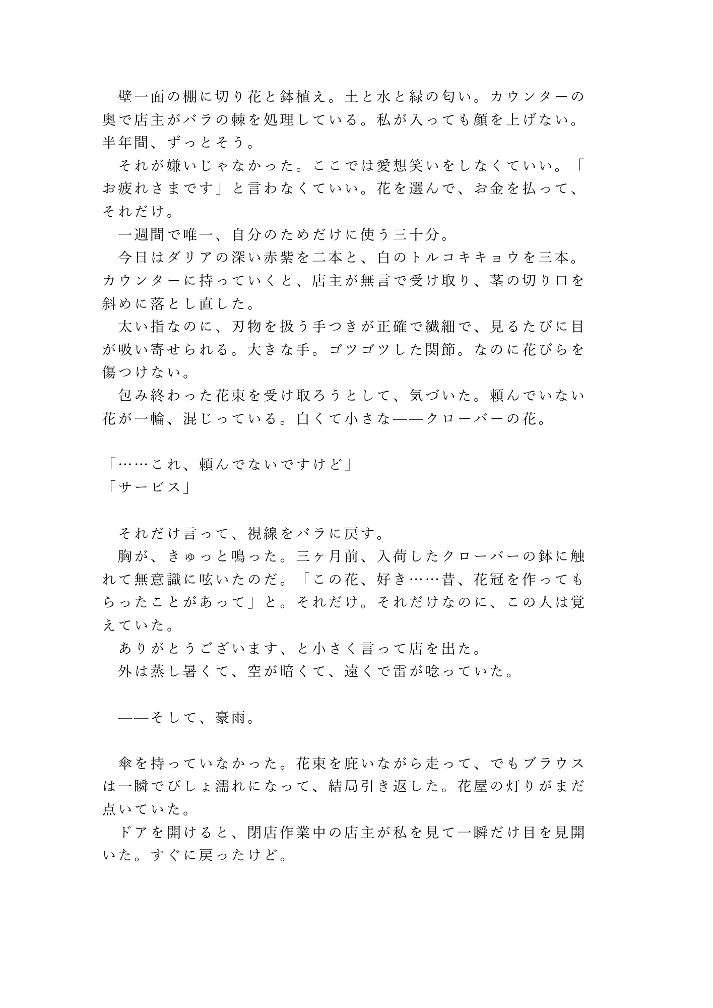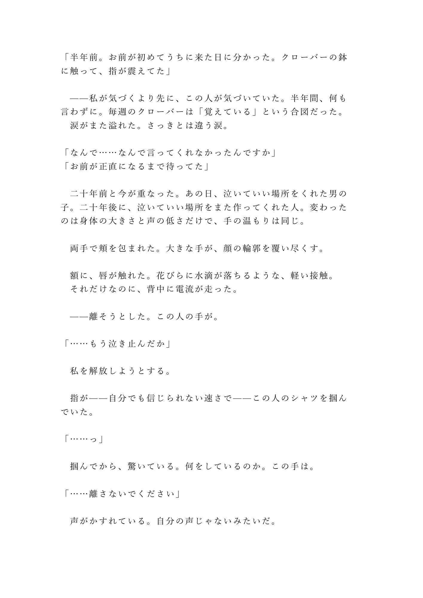 彼女が選ぶ花の色で、心の浮き沈みを読み取りながら。何も言わず、ただクローバーを一輪添えて。「正直になれよ」と言える日を、ずっと待っていた。