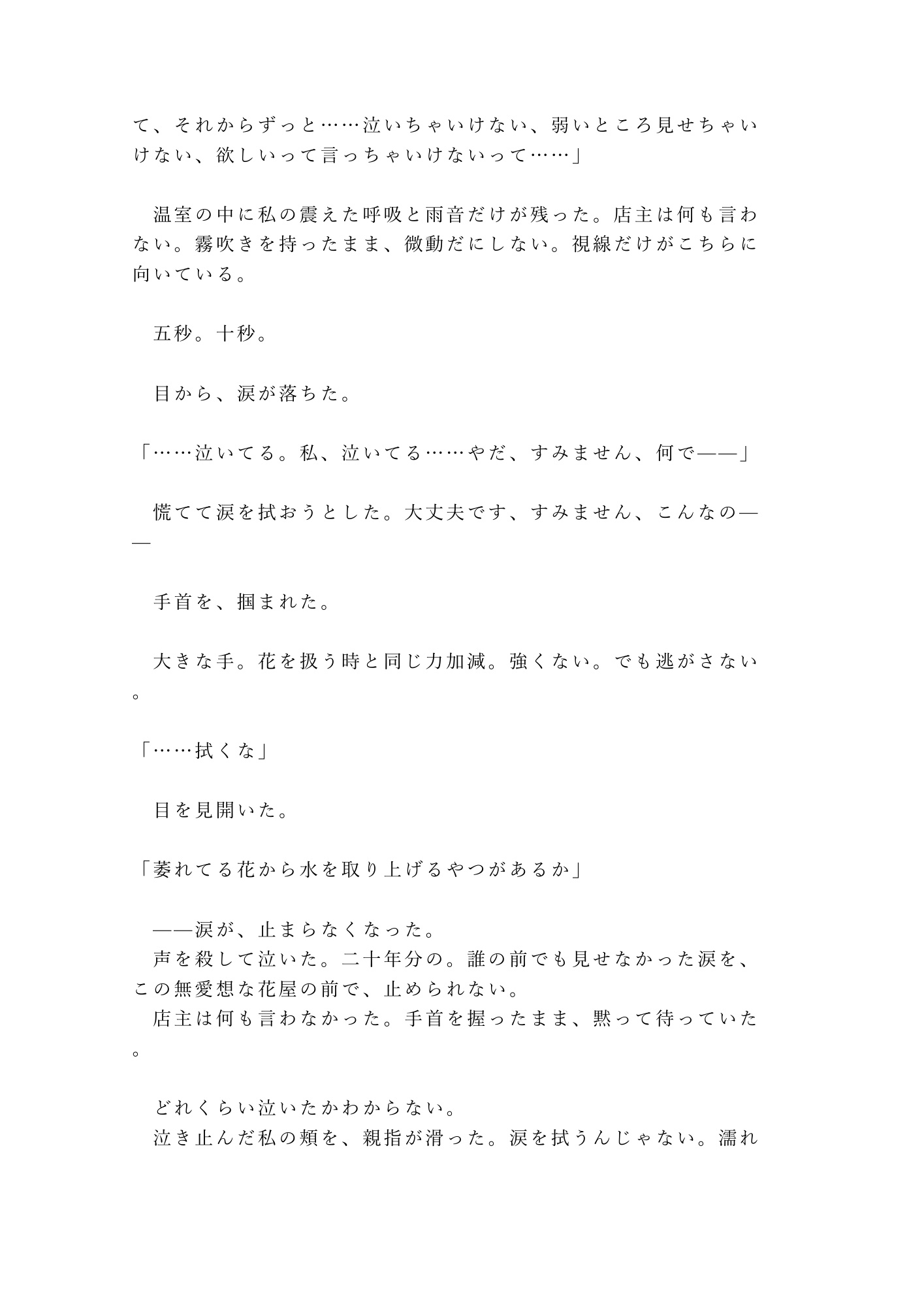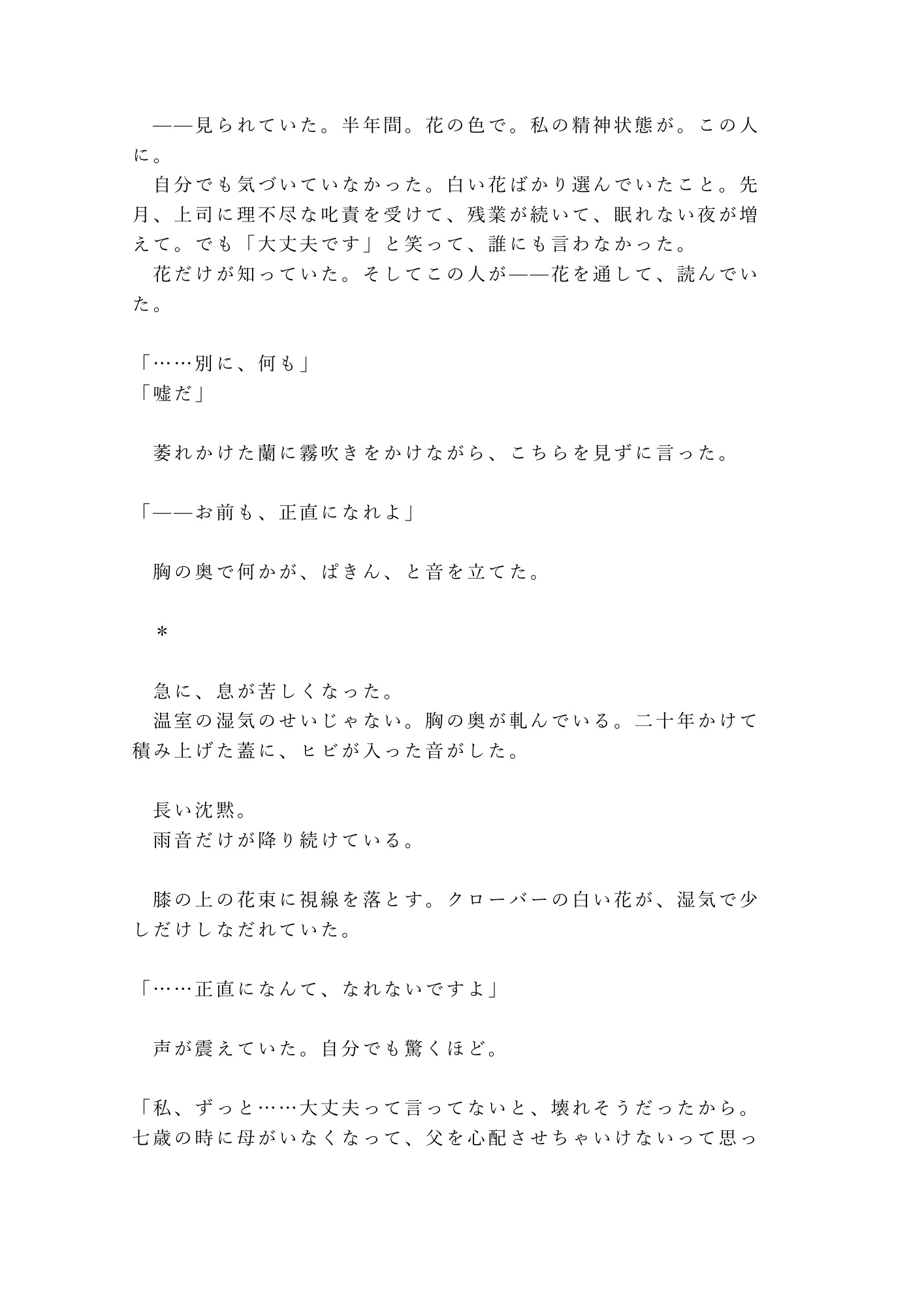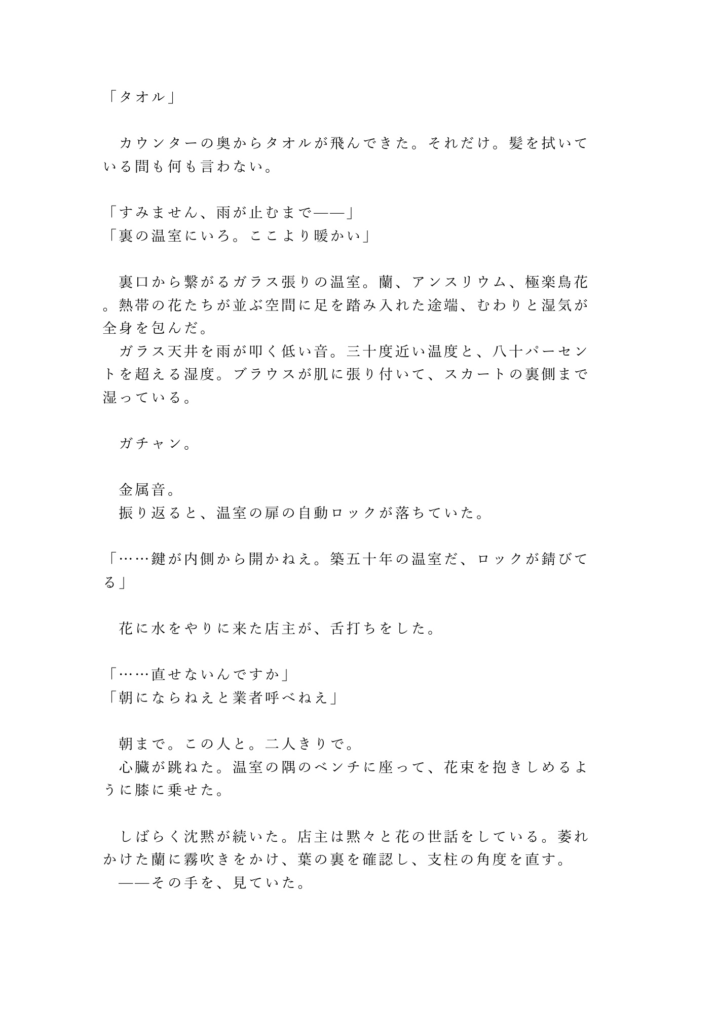 豪雨の夜、錆びた自動ロックが落ちた温室に閉じ込められた二人。三十度の湿気、蘭の甘い匂い、ガラス天井を叩く雨音──逃げ場のない空間で、「大丈夫です」の仮面がゆっくり剥がされていく。