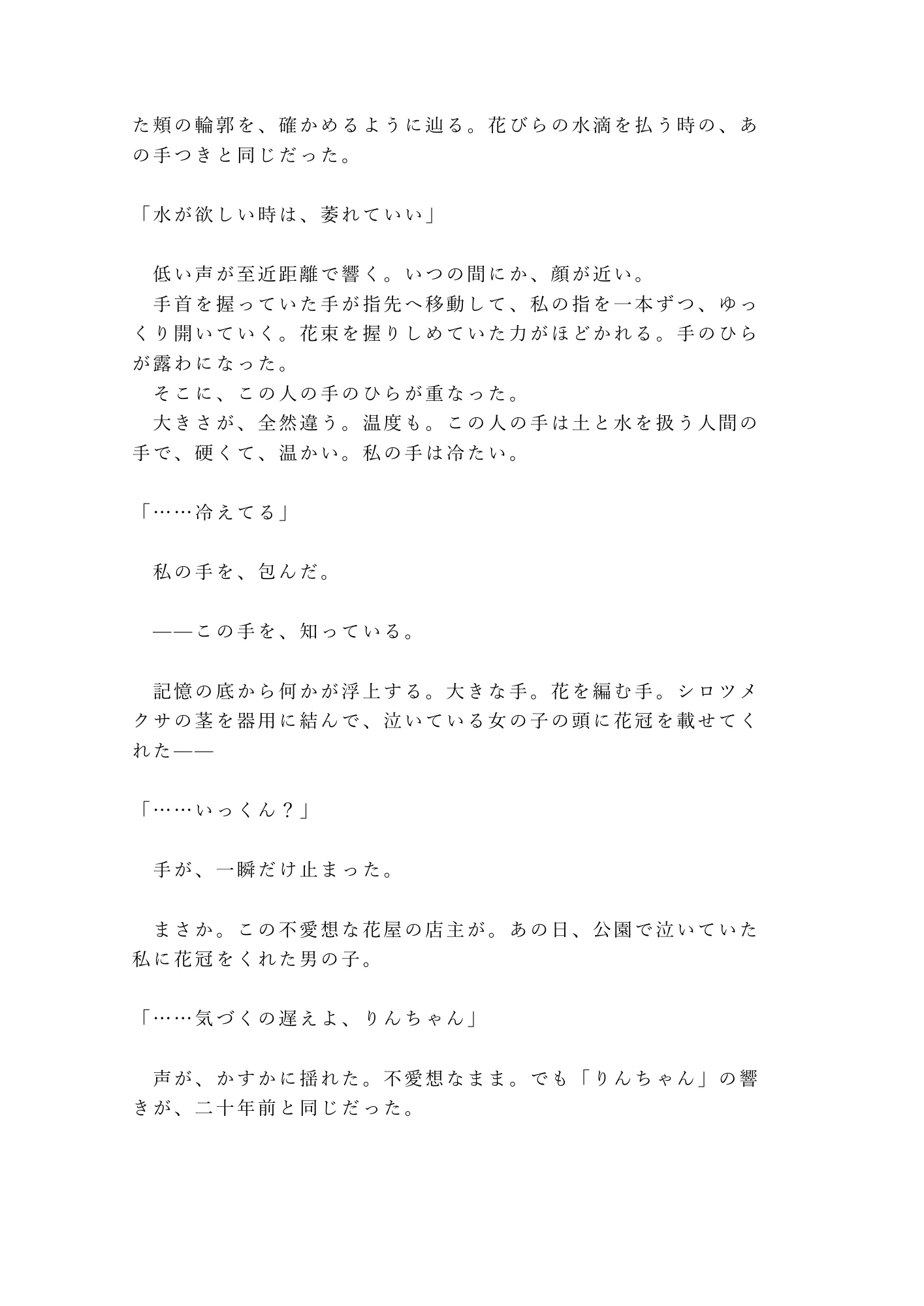 無愛想で「いらっしゃい」すら言わない店主・柊郁人は、毎週金曜に花を買いに来る常連客──二十年前に花冠をくれた幼馴染だと、とっくに気づいていた。