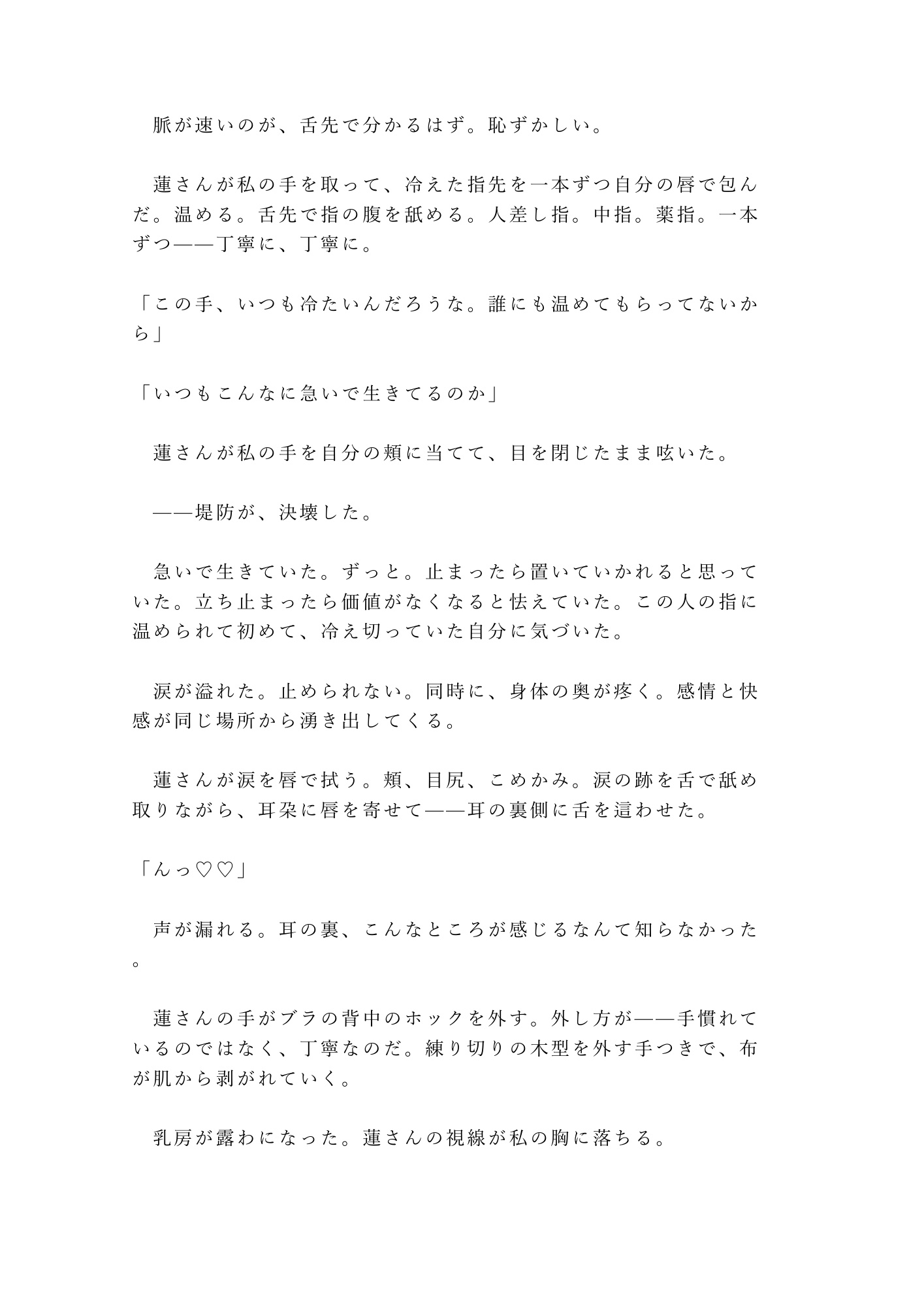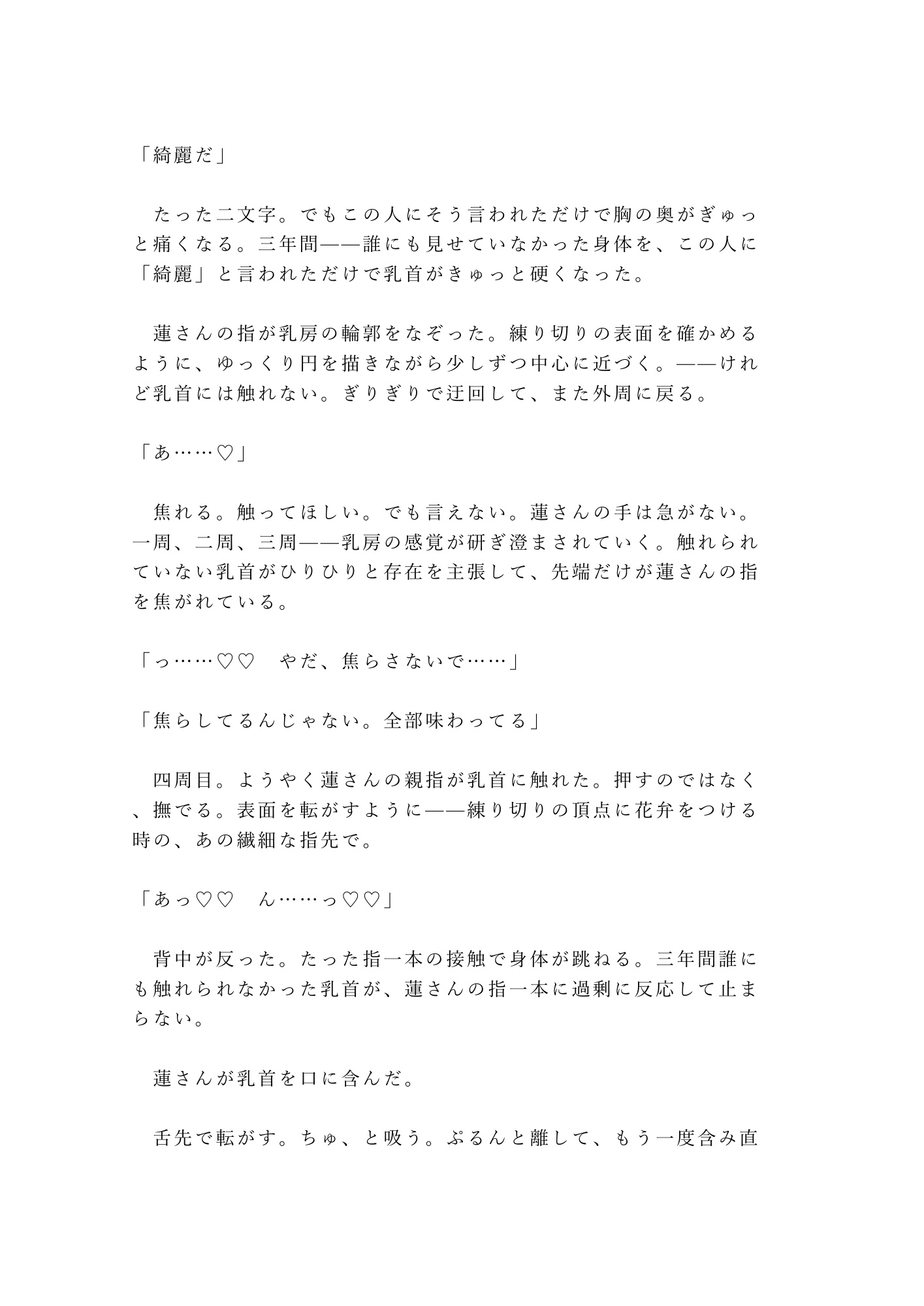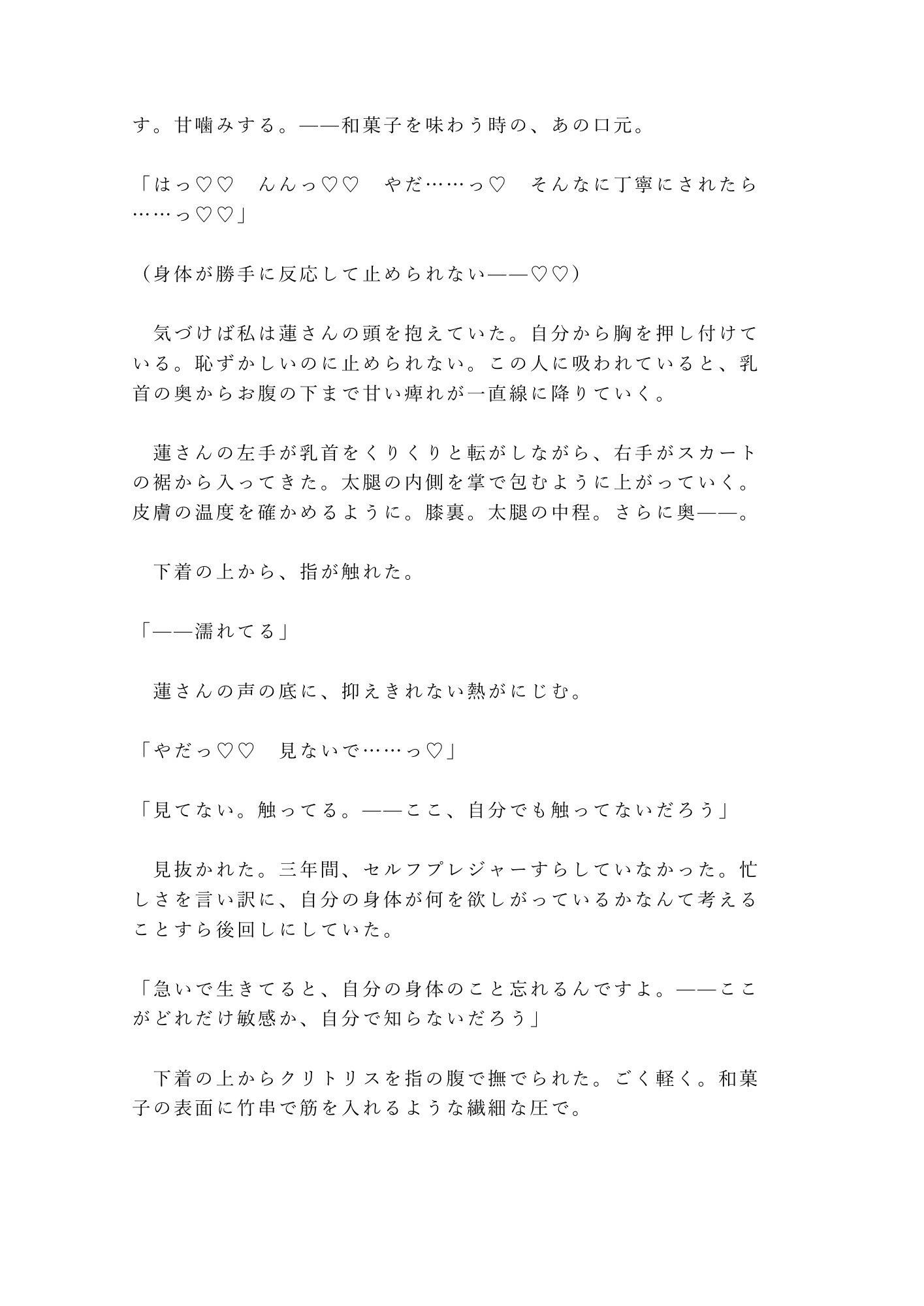 蓮の手は、練り切りを仕上げる時と同じ。壊さないように、傷つけないように、でも確実に望む形へ導いていく。ブラウスのボタンをひとつずつ外す指。乳房の輪郭を何周も焦らす掌。下着越しに秘所をなぞる竹串のような繊細さ——「全部味わってる」と囁くその声に、彩花の理性は甘く蕩けていく。