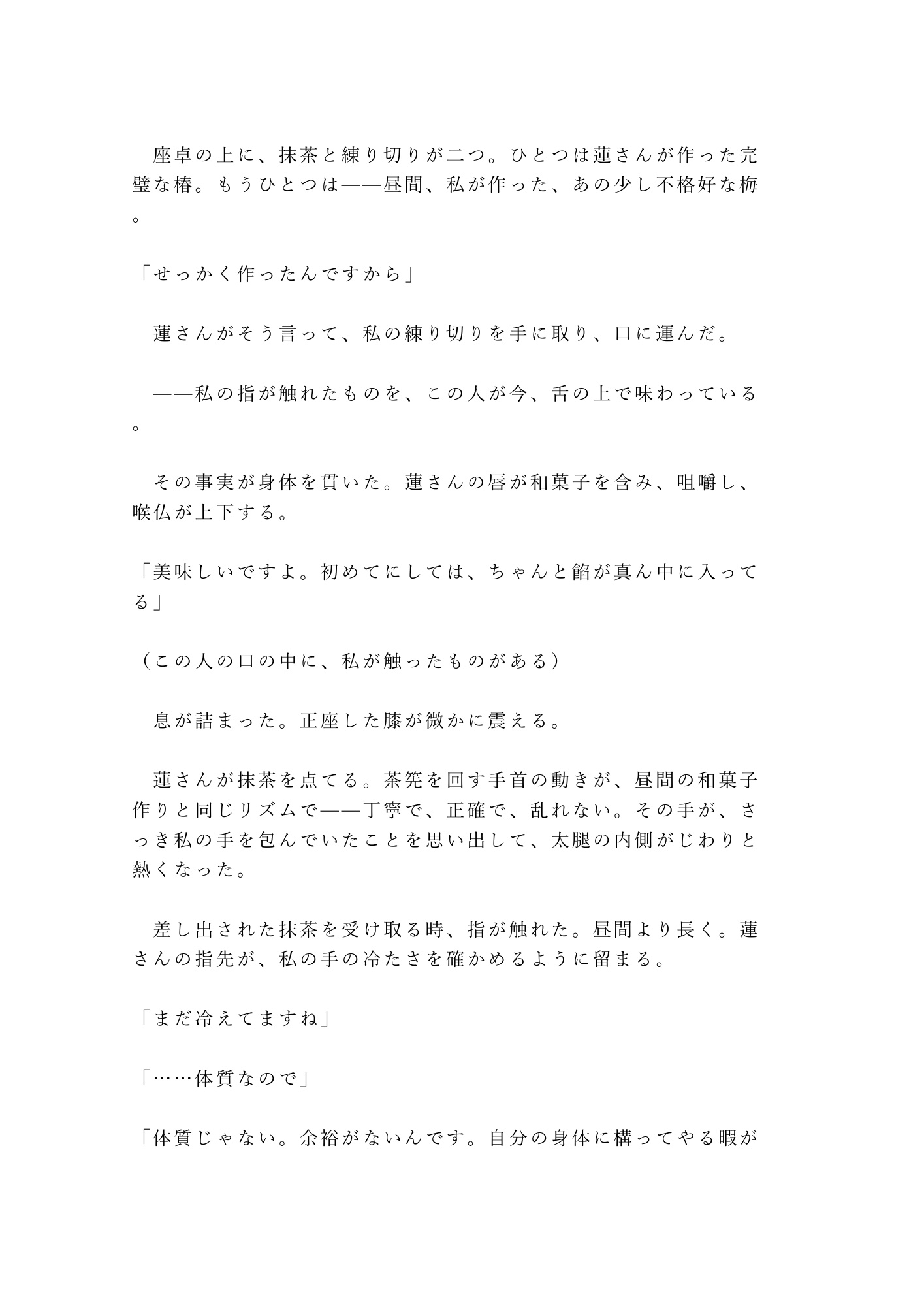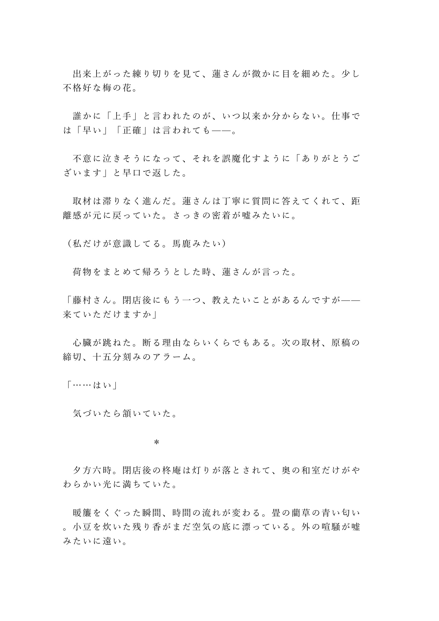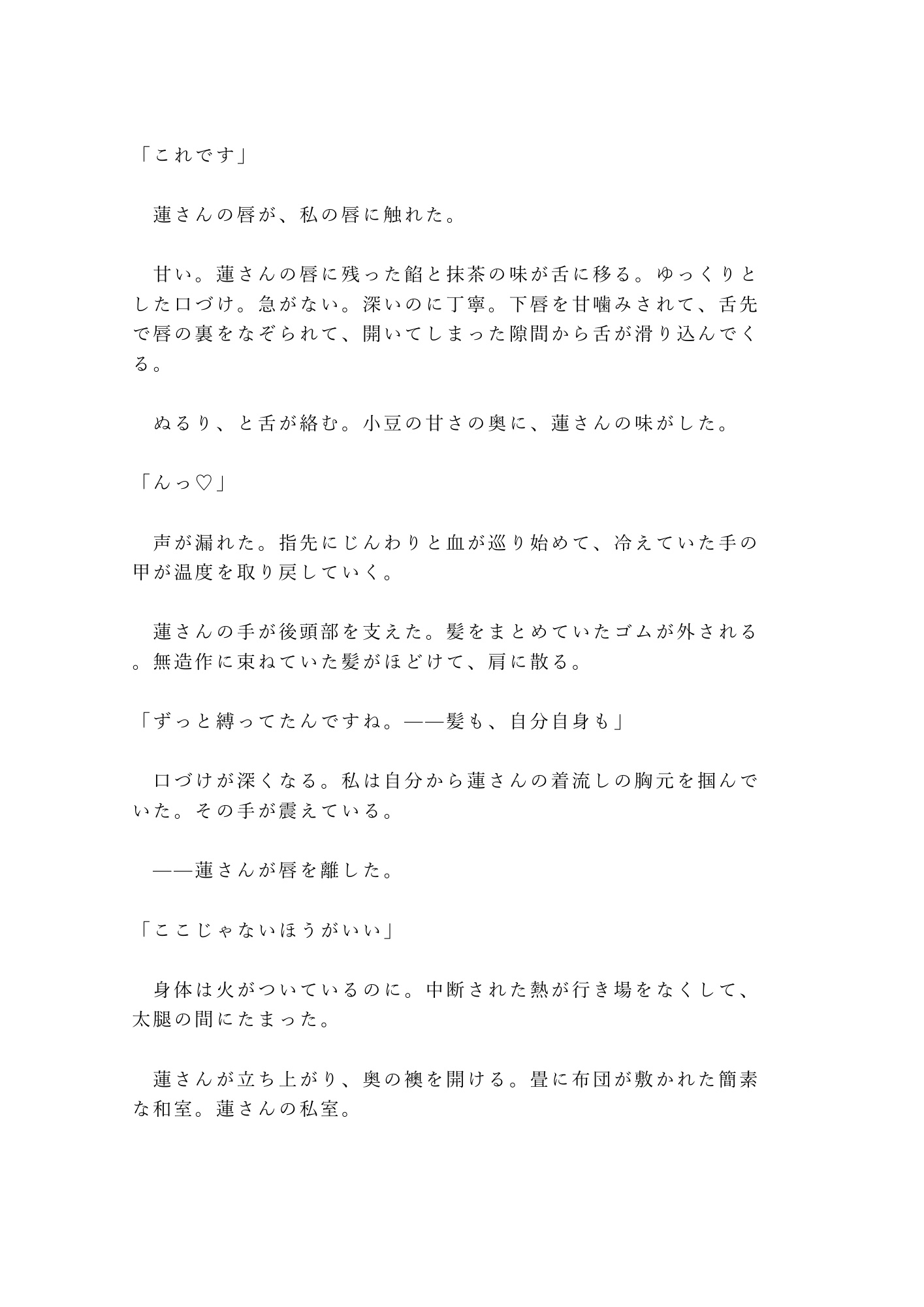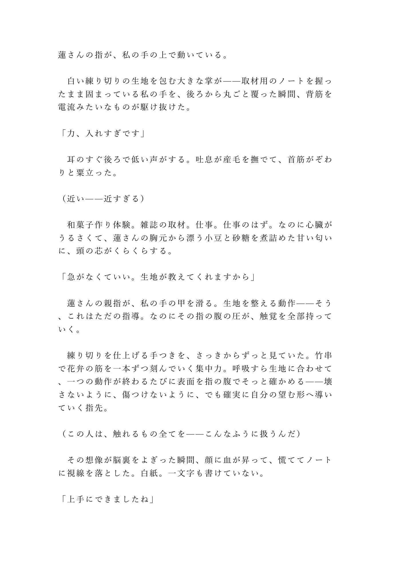 雑誌記者の藤村彩花は、取材先の若旦那・柊蓮に「閉店後に教えたいことがある」と呼び出される。待っていたのは、抹茶と、昼間彩花が作った不格好な練り切り。そして、餡の甘さごと唇を奪う、深い口づけだった。