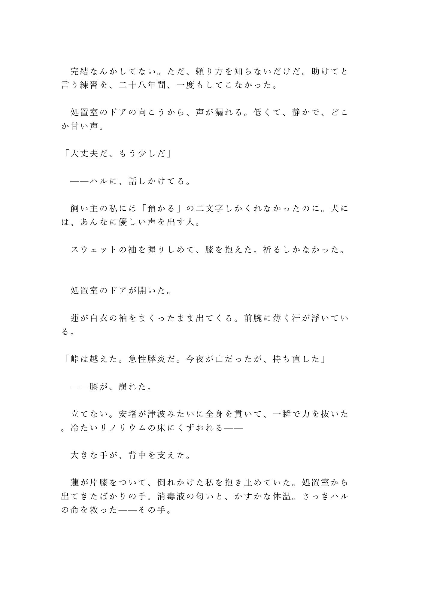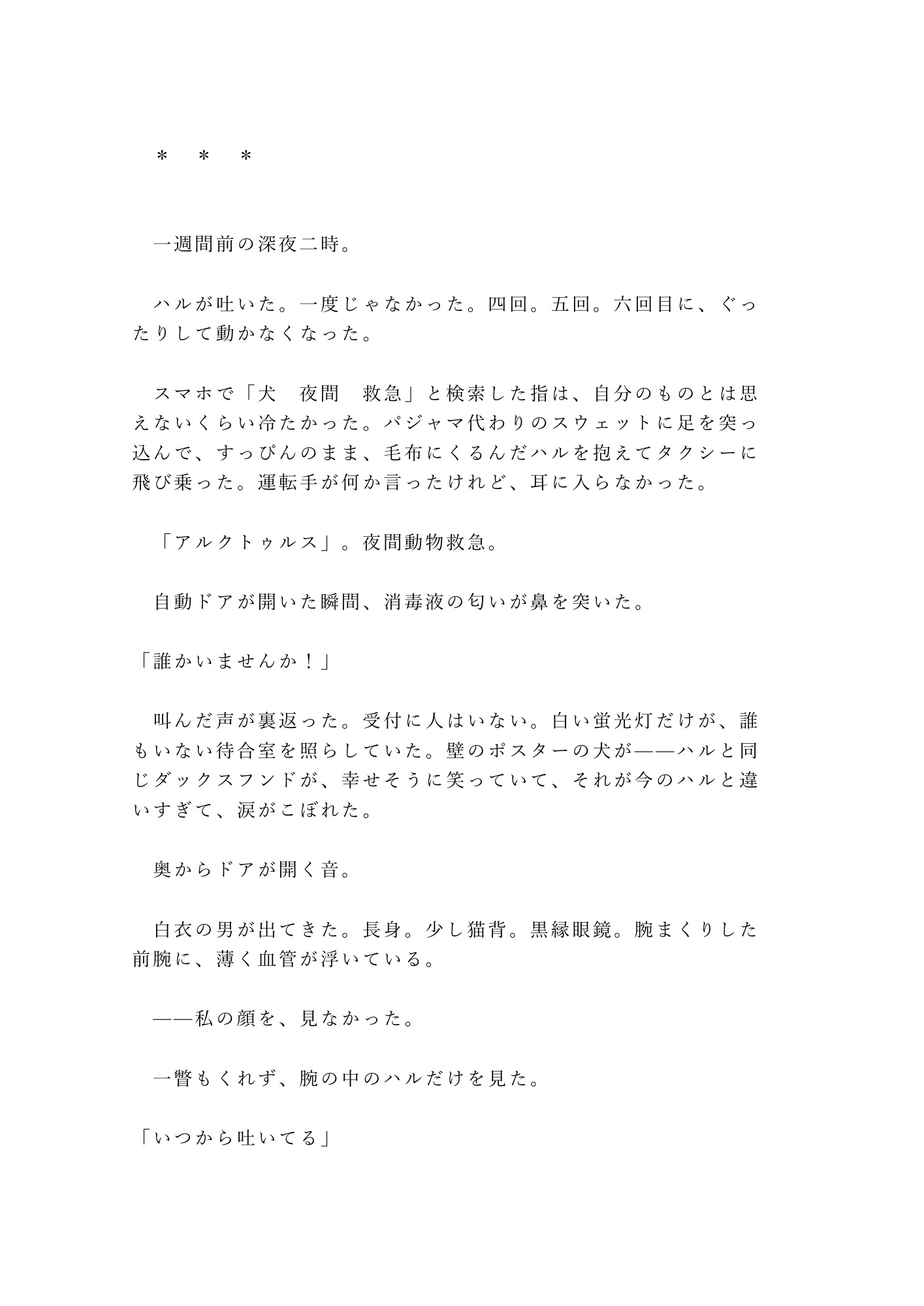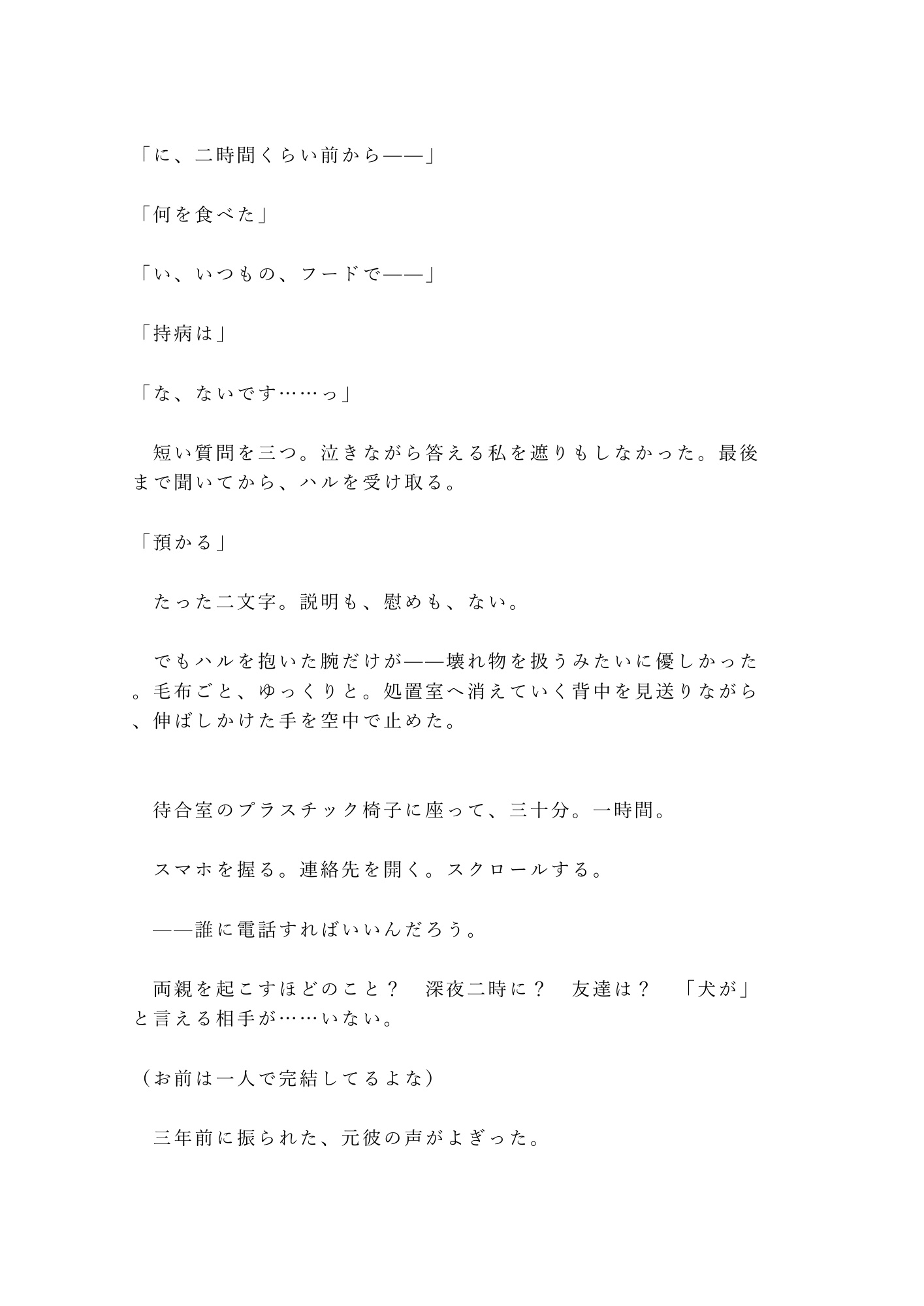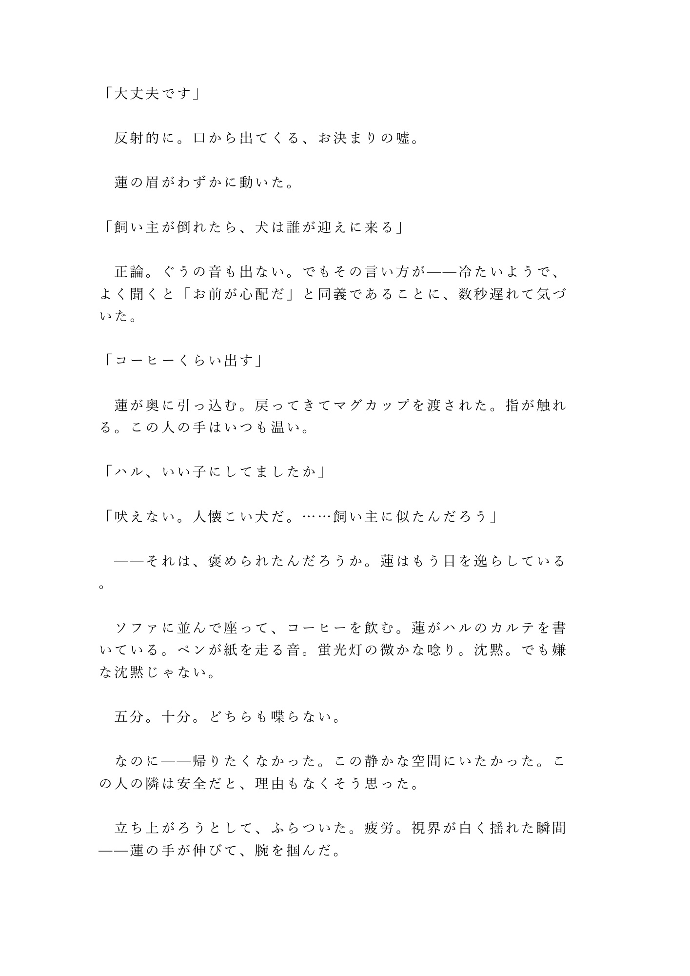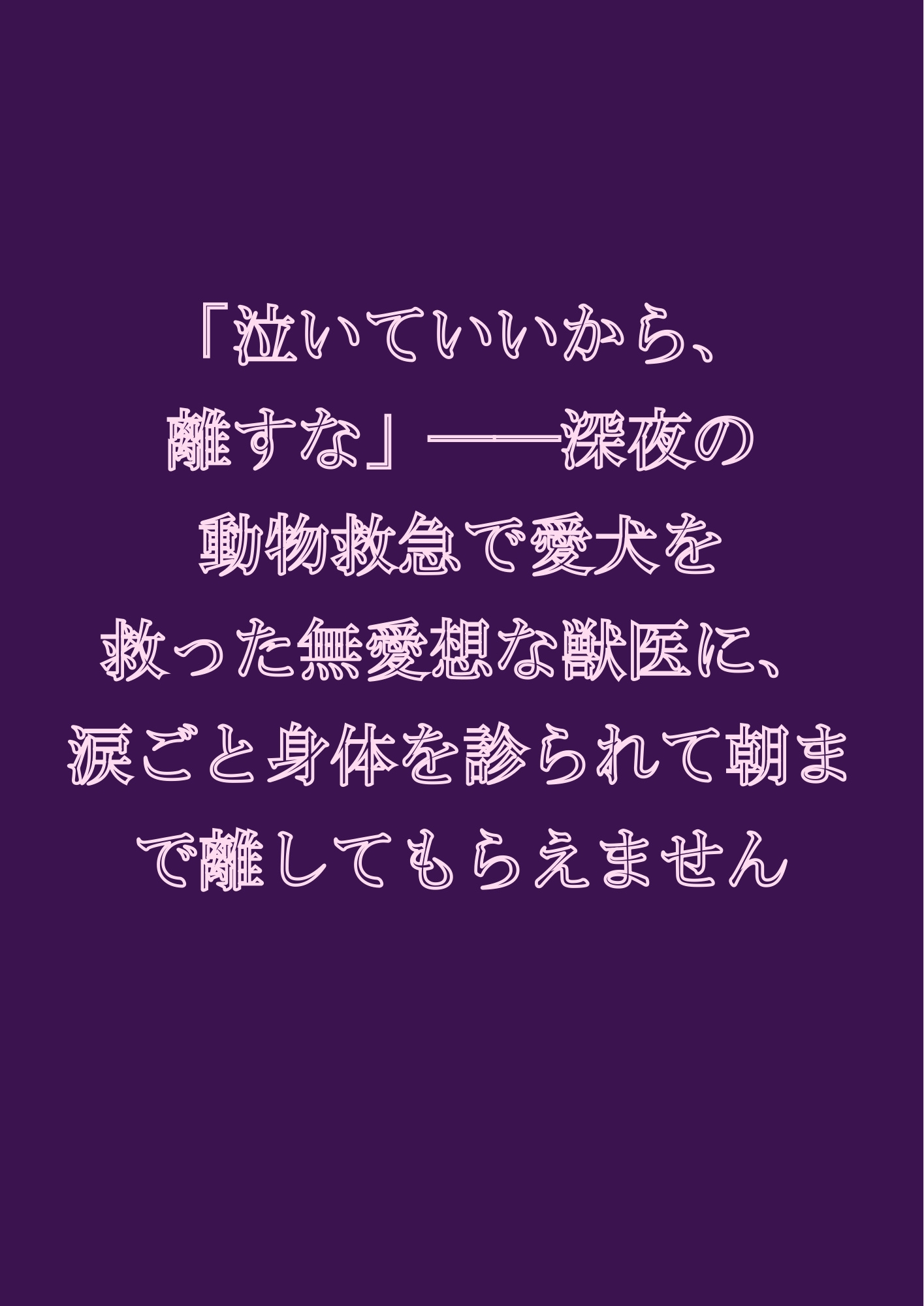 深夜二時、愛犬が動かなくなった。パジャマのまま駆け込んだ夜間動物救急で出会ったのは、飼い主の顔も見ずに犬だけを診る無愛想な獣医・蓮。「預かる」のたった二文字で処置室に消えた彼が、犬には「大丈夫だ、もう少しだ」と甘く囁いていた——。