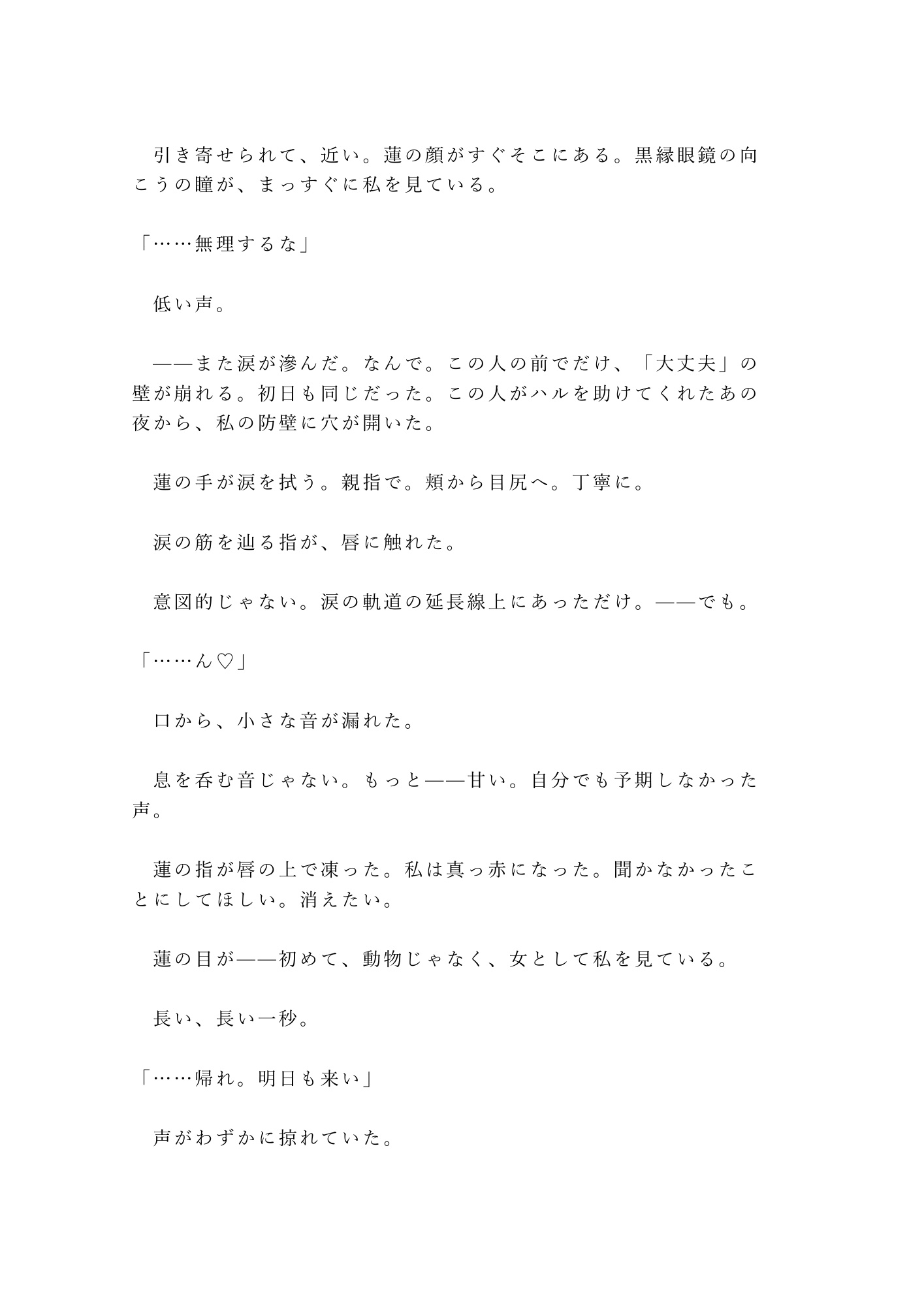 深夜の救急病院で、愛犬の命を救ってくれたのは無愛想な獣医・蓮だった。飼い主の私には目も合わせないのに、動物には甘い声を出す不器用な人。毎晩の面会で距離が縮まるたび、あの大きな手に触れられたいと思う自分が止められなくなって——「ここがお前の一番弱いところだ」触診みたいに正確な指で暴かれる秘密の場所。泣いていいから離すなと囁かれた夜、私の身体は全部この人に診られた。