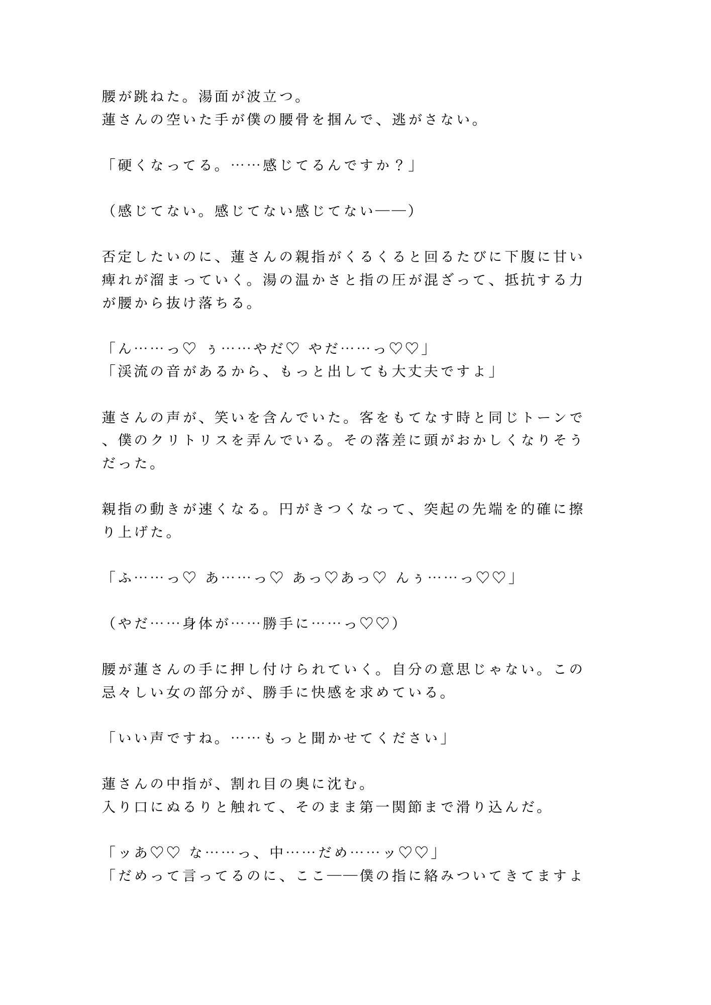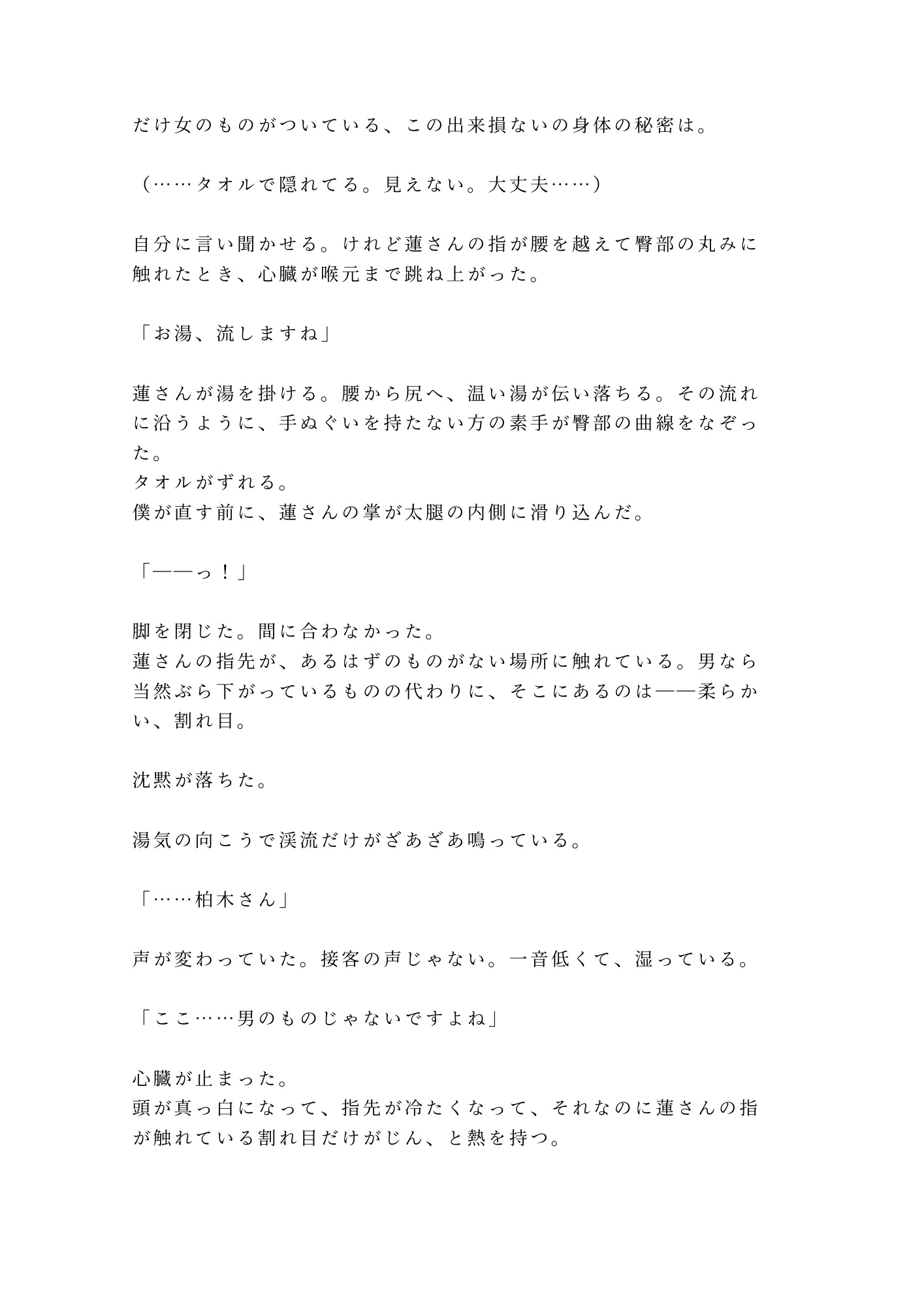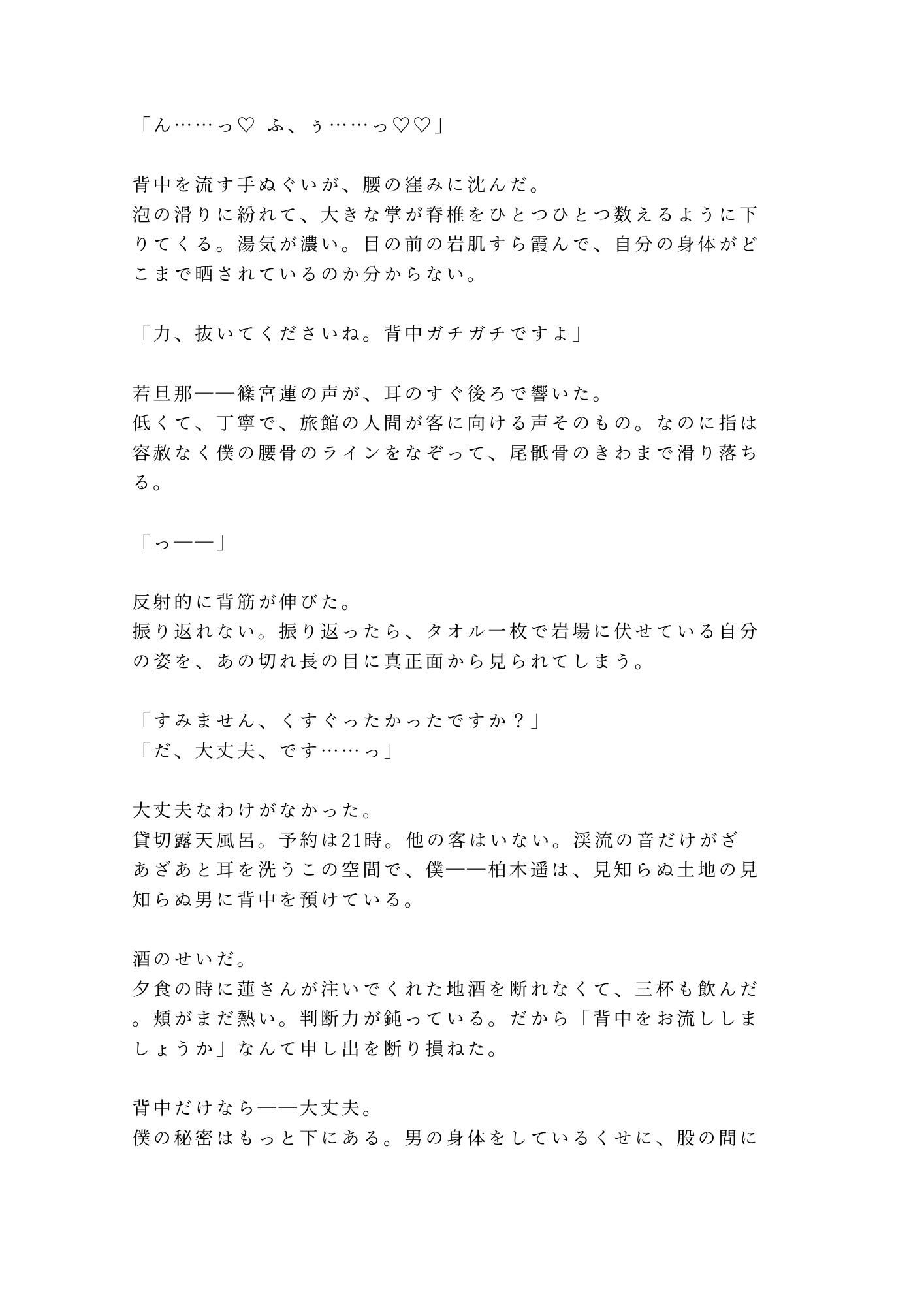 山あいの温泉旅館。貸切露天風呂で「お背中お流ししますね」と微笑んだ若旦那・篠宮蓮。地酒に酔って断り損ねた背中流しの手が、腰から尻へ、尾骶骨のきわを越えて――在るはずのものがない場所に触れた。