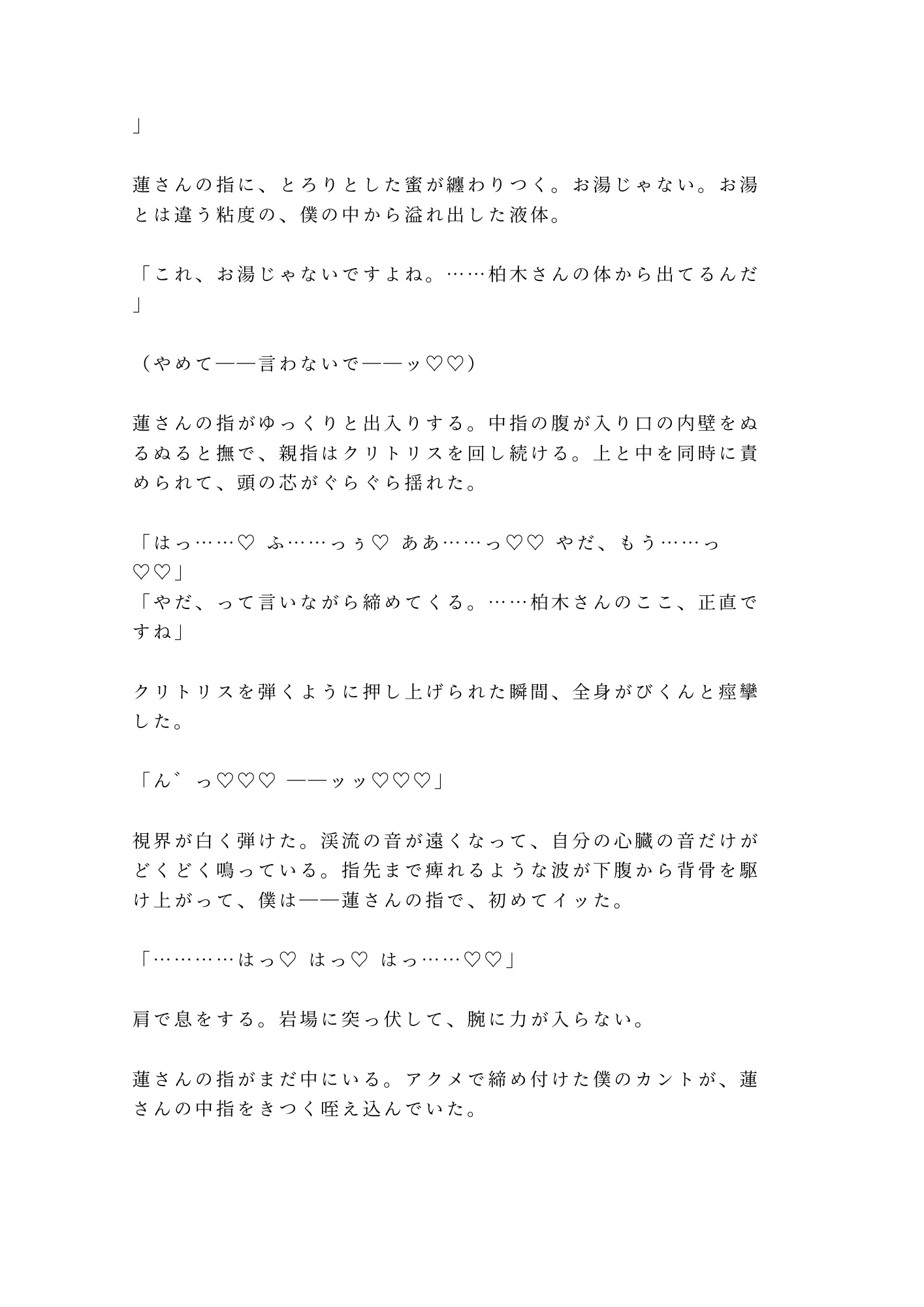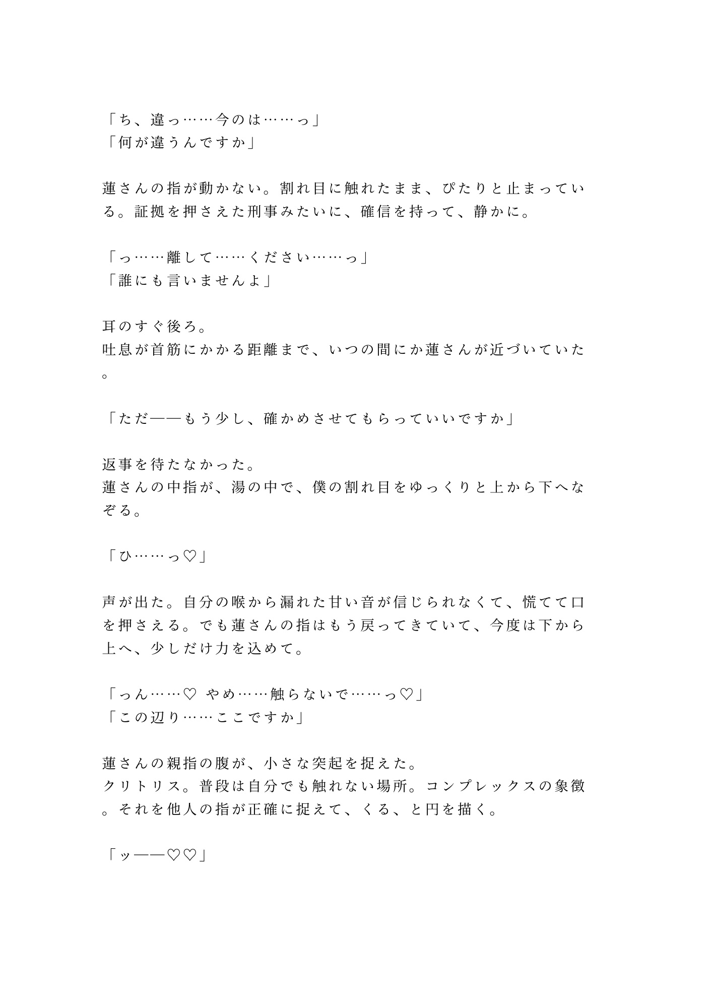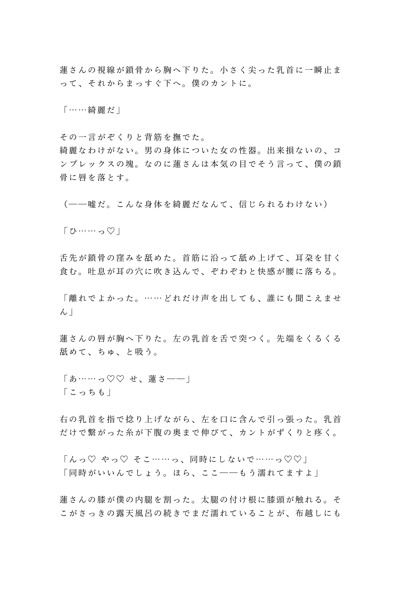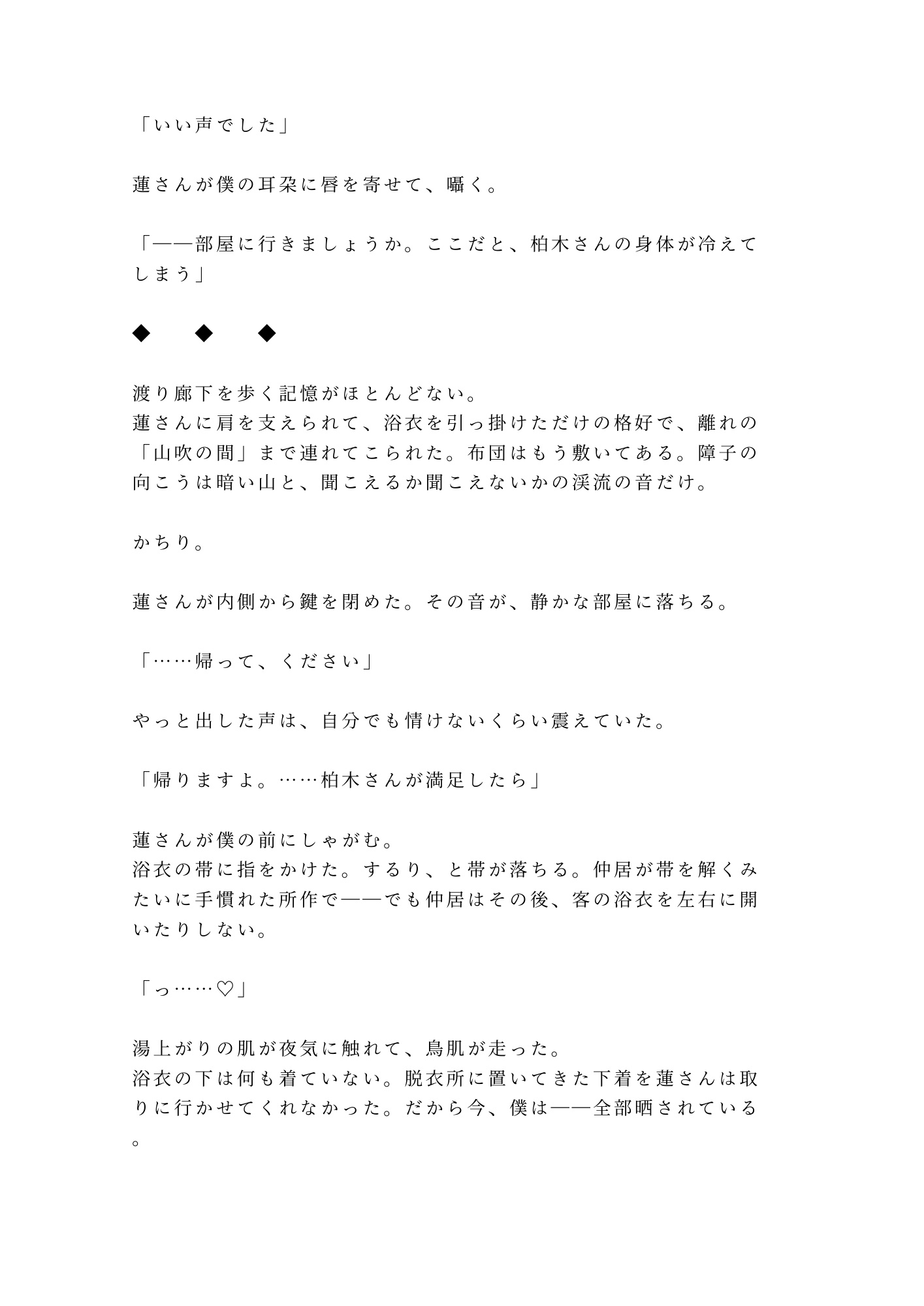 山あいの温泉旅館。貸切露天風呂で「お背中お流ししますね」と微笑んだ若旦那・篠宮蓮。地酒に酔って断り損ねた背中流しの手が、腰から尻へ、尾骶骨のきわを越えて――在るはずのものがない場所に触れた。