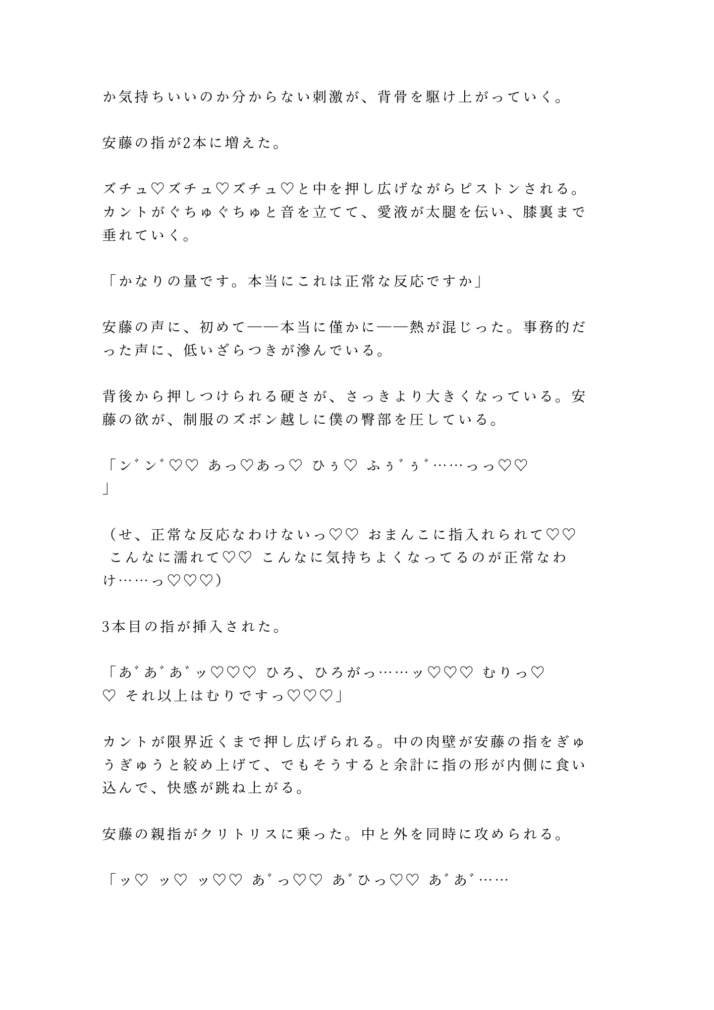抵抗できない状況で、意思に反して反応してしまう身体。「正常な反応ですか」と問う声に滲む、隠しきれない熱。制服の下で膨張していく欲望。職務と欲の境界線が、じわじわと溶けていく。
