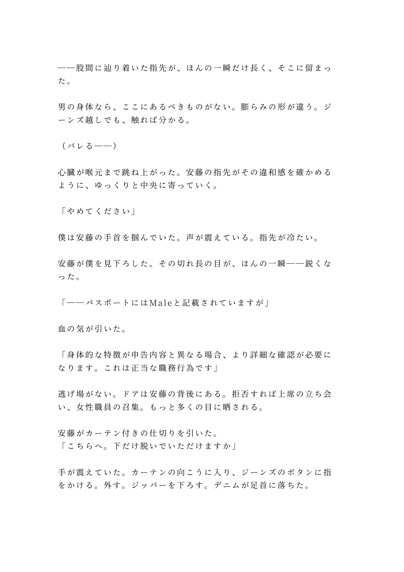カナダでの4年間、誰にも知られずに生きてきた。パスポートには「Male」。戸籍も、見た目も、声も、すべて男。ただひとつ——股の間にある秘密だけを除いて。