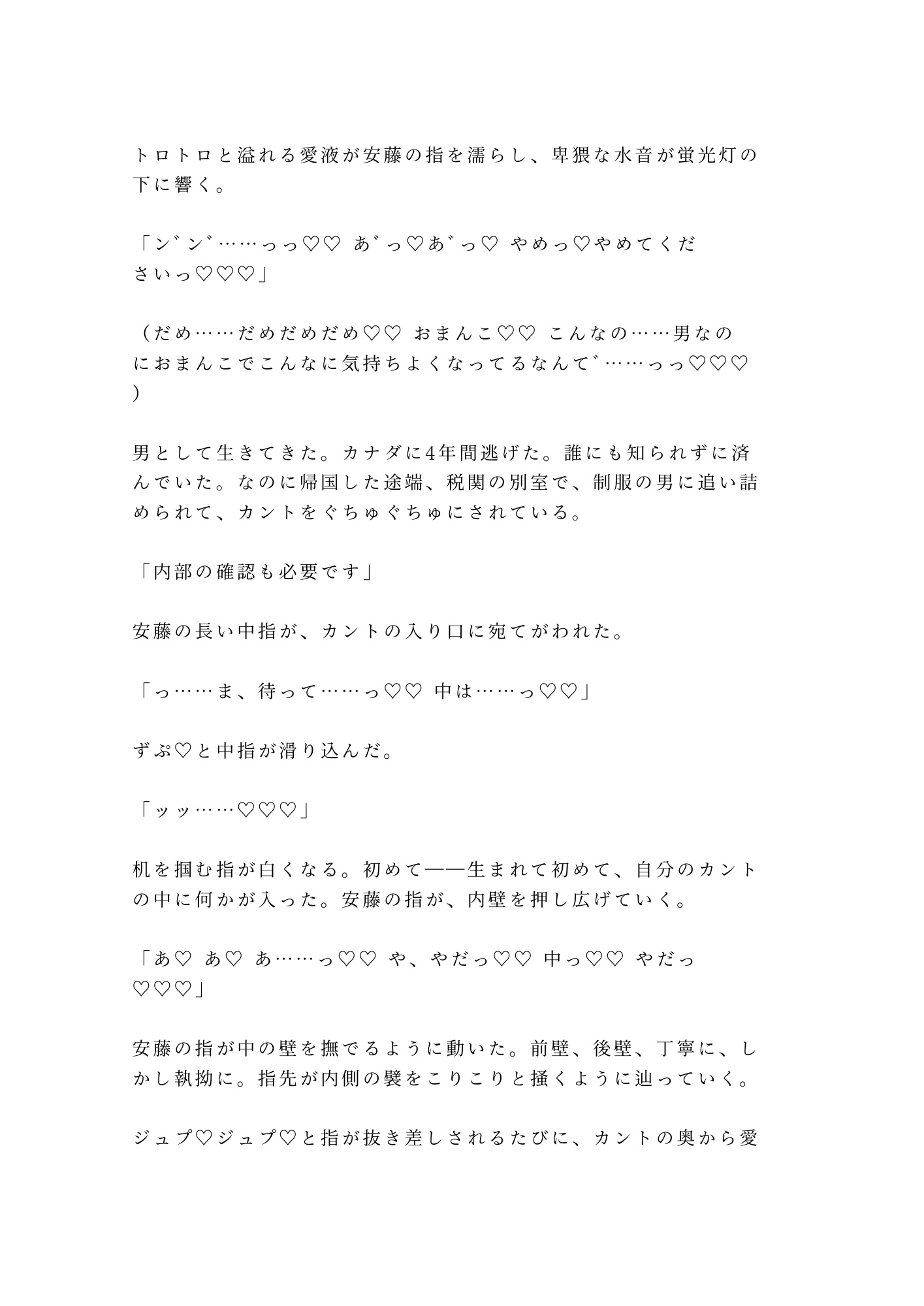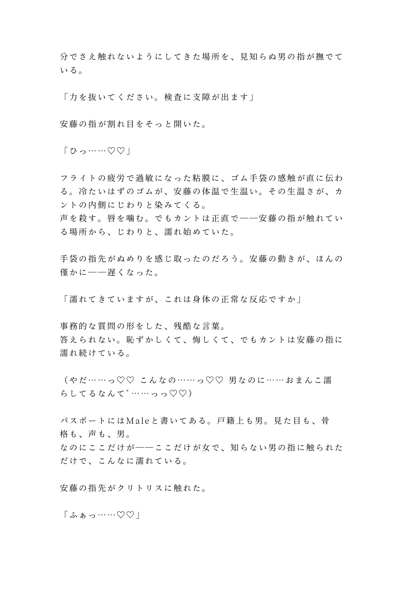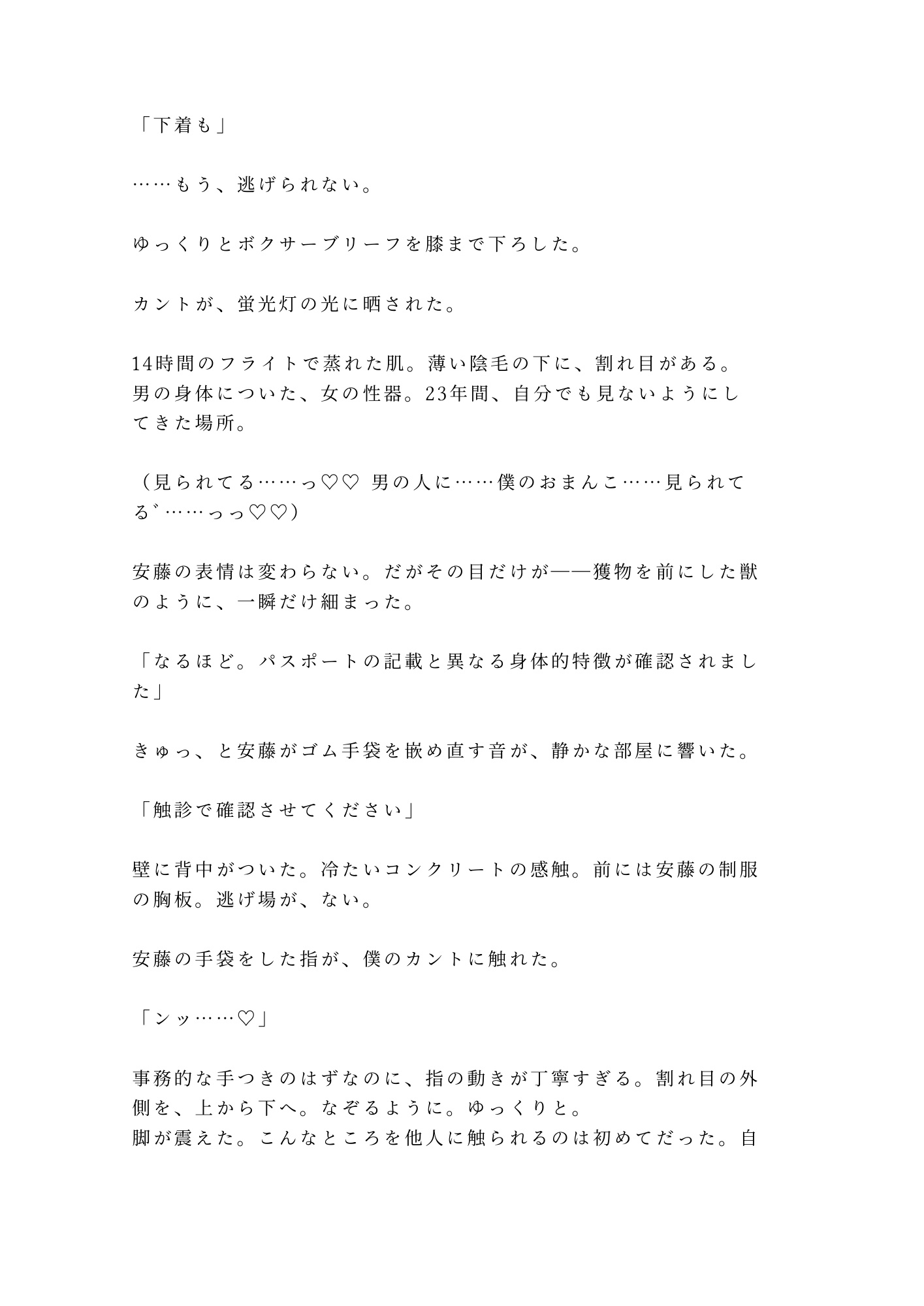 空港税関の別室。パスポートには「Male」——なのに、冷徹な税関職員・安藤の手が股間に触れたとき、そこにあるべきものがなかった。「身体的特徴が申告と異なります」。逃げ場のない密室で始まる”触診”。事務的な指先がカントの秘密を暴き、職務の仮面の下で男の欲望が膨れ上がる。羞恥と快楽に壊される、カントボーイ×税関職員の背徳BL官能。