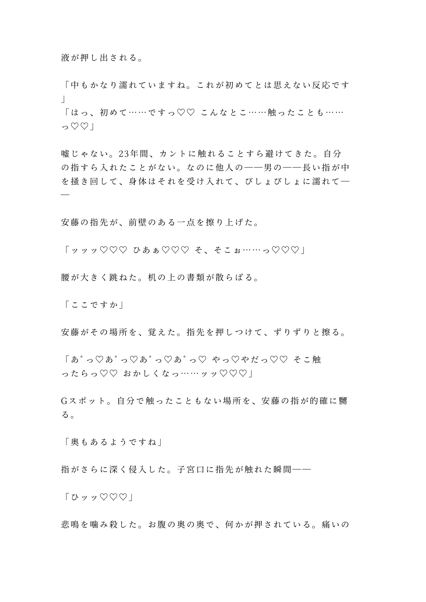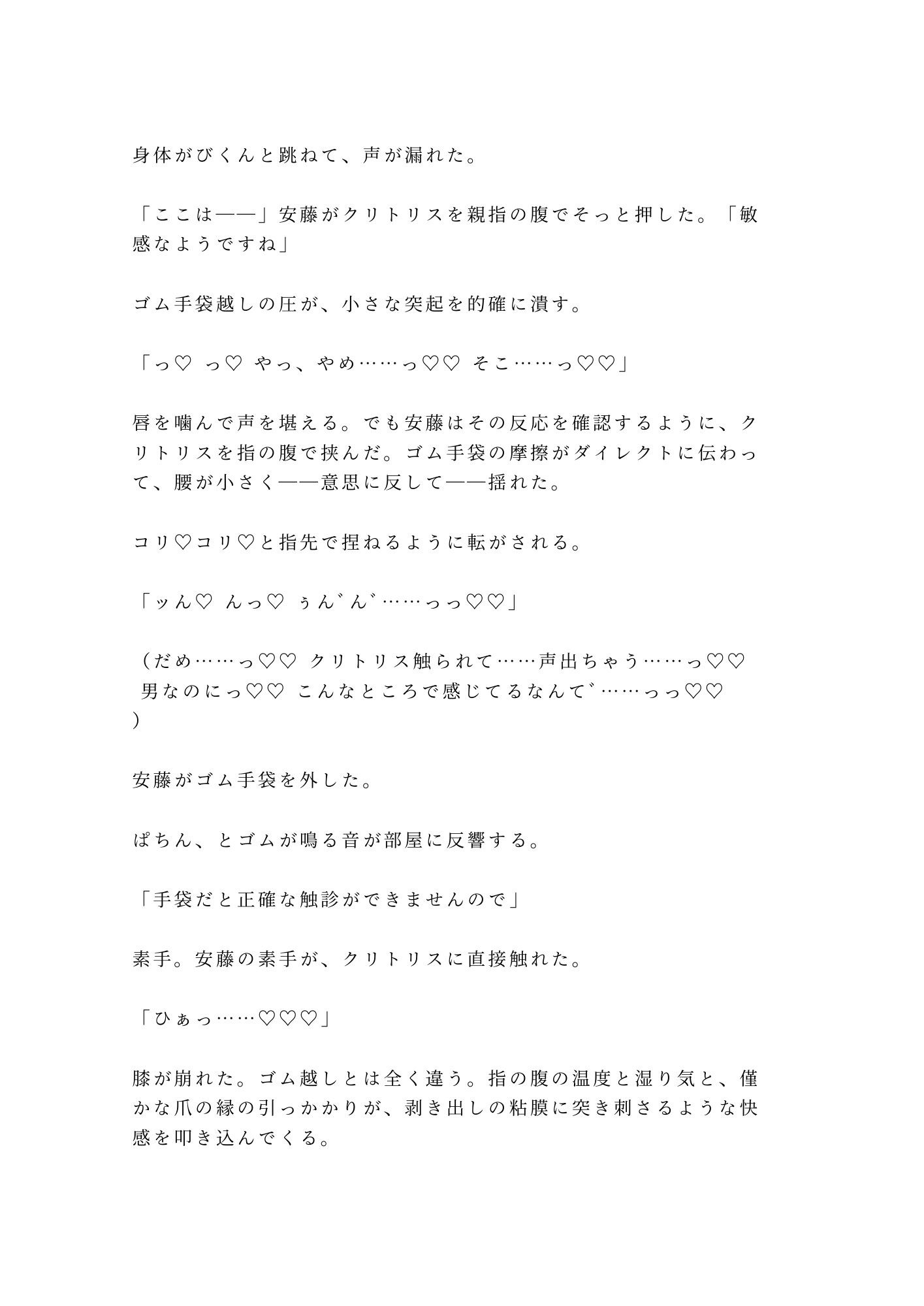 ゴム手袋越しに暴かれる秘密。23年間、自分でさえ触れることを避けてきた場所が、見知らぬ男の指に晒される。逃げ場はない。拒否すれば、もっと多くの目に曝される。