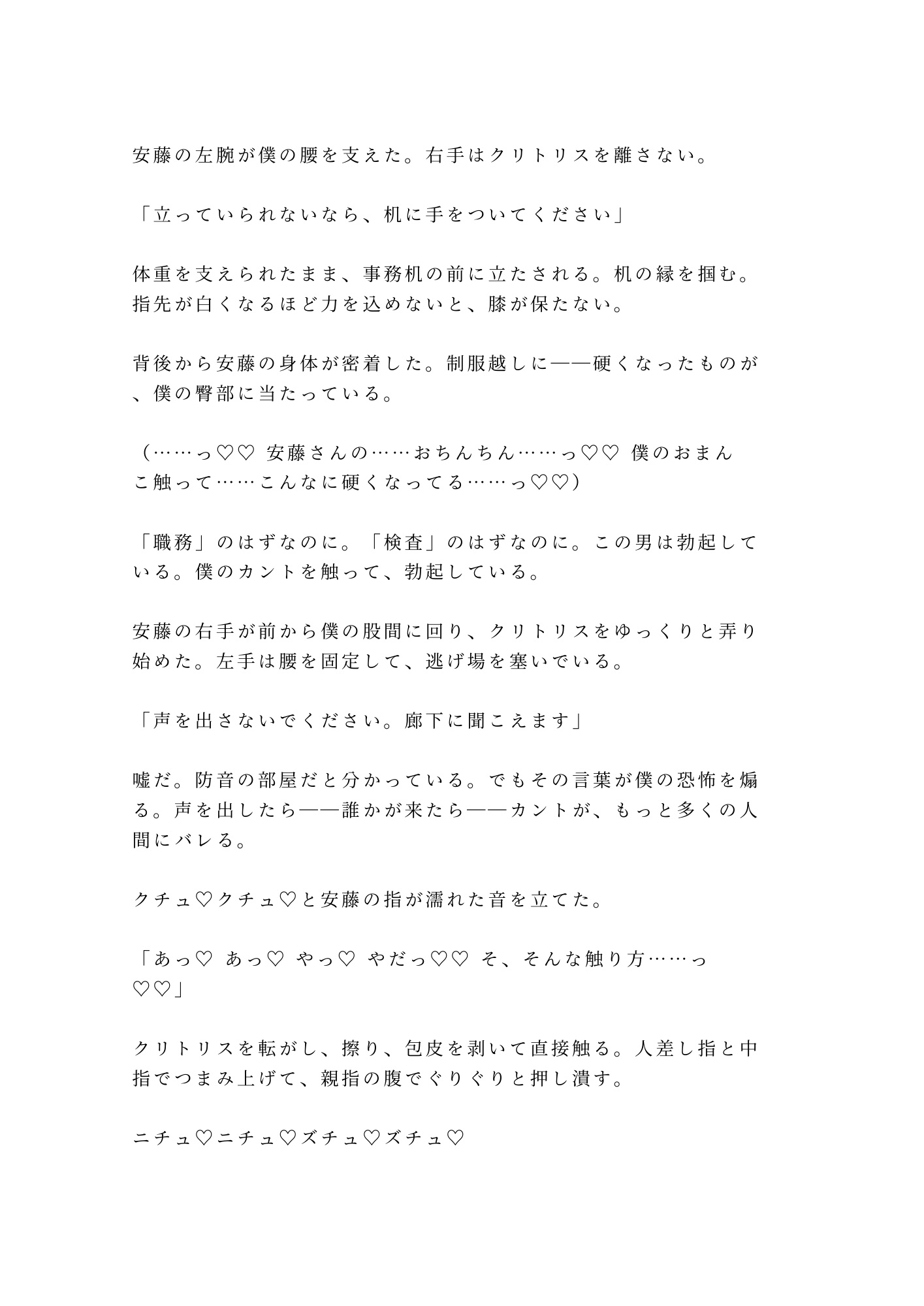 切れ長の目に感情を見せない183センチの職員は、あくまで「職務」として手を伸ばす。事務的な声、事務的な手つき。なのにゴム手袋を外した素手の指先は、どこまでも丁寧で、執拗で——「検査」という名の愛撫は、隠し通してきた身体を容赦なく暴いていく。