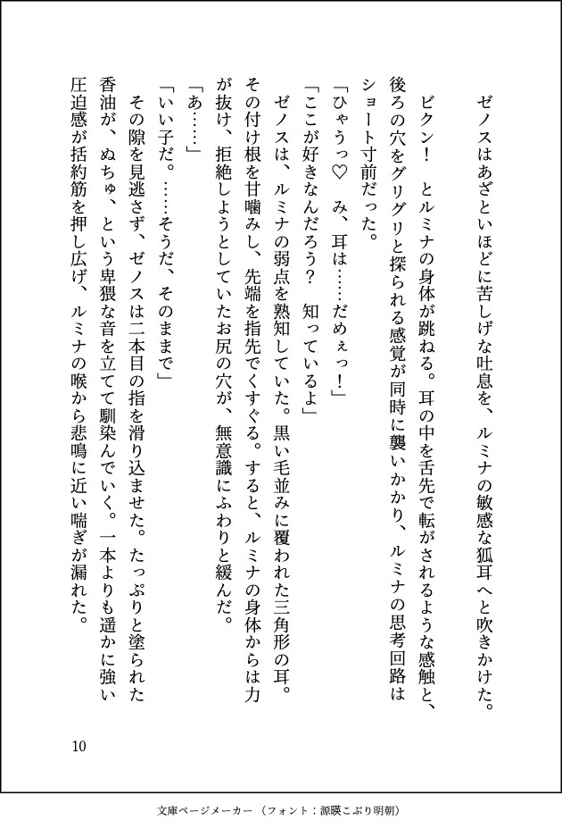 ●ルミナ(受け) 「山神の化身」と呼ばれる稀少な種族の生き残り。黒髪黒目、狐の耳と尻尾を持つ。 過去のトラウマから自己肯定感が低く、ゼノスに救われた恩義と愛から、どんなに恥ずかしい行為も「治療のため」と受け入れてしまう。 開発が進むにつれ、排泄の自由さえも夫に委ねることに安心感を覚え、幸せな被管理家畜へと堕ちていく。