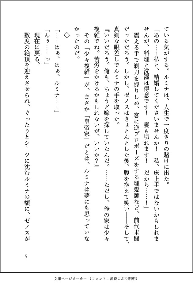 身分を隠して理髪店を営んでいた「山神の化身」ルミナは、ある日客として訪れた若き皇帝・ゼノスに見初められ、求婚される。 しかし、彼には「海神の呪い」がかかっており、夜毎、ルミナの身体でその熱を鎮めなければならないという。