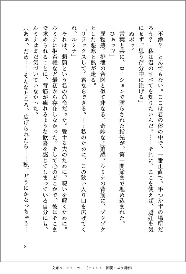 最初は正常な夫婦の営みだったはずが、ゼノスの要求は次第にエスカレート。 「呪いの毒は深い場所に溜まる」と甘く囁かれ、未開発のアナルを指で、楔で、玩具で蹂躙されていく。