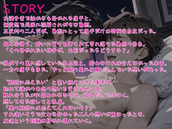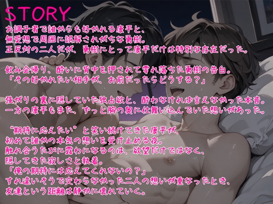 お調子者で誰からも好かれる康平と、 無愛想で周囲に誤解されがちな勇樹。 正反対の二人だが、勇樹にとって康平だけは特別な存在だった。 飲み会帰り、酔いに背中を押されて零れ落ちた勇樹の告白。 「その好かれたい相手が、お前だったらどうする?」 酔わなければ言えなかった本音。 一方康平もずっと胸の奥に仕舞い込んでいた想いがあった。 すれ違いそうで交わらなかった二人の想いが重なったとき、 友達という距離は静かに壊れていく。