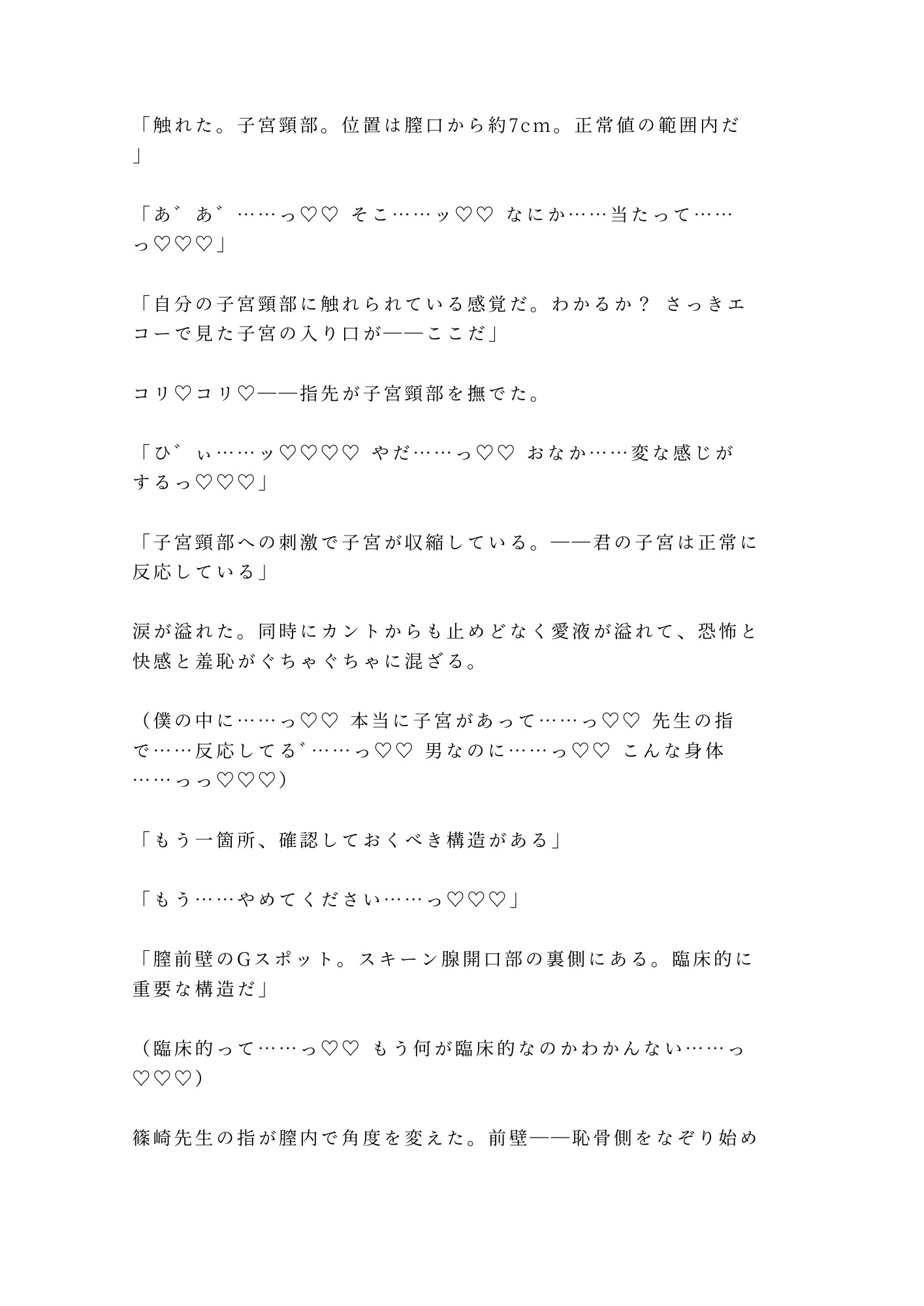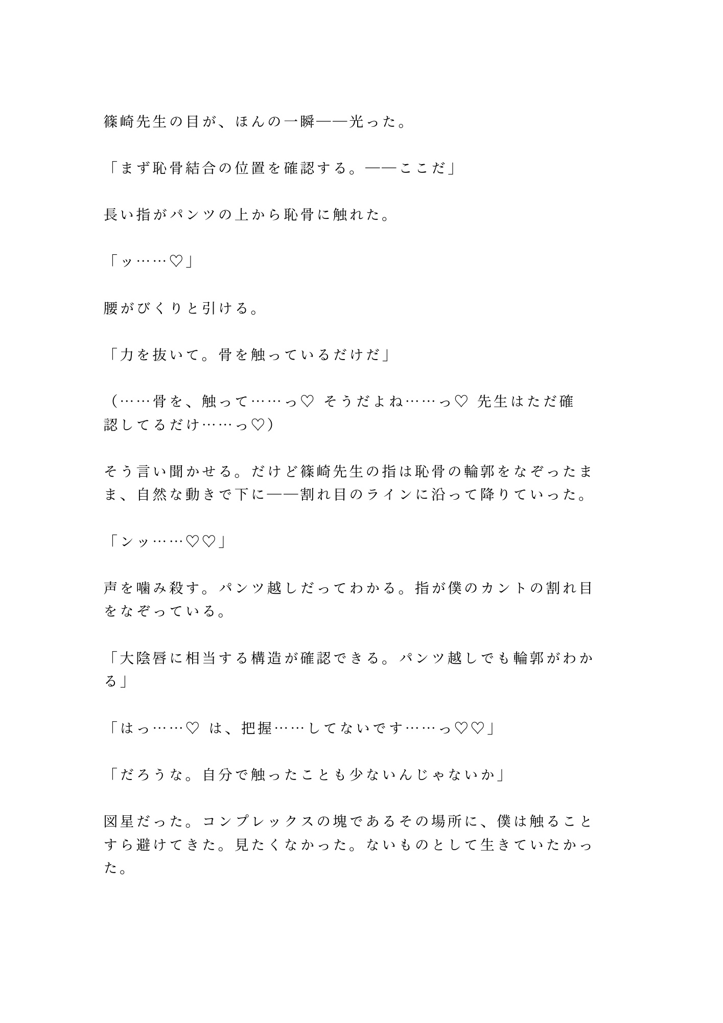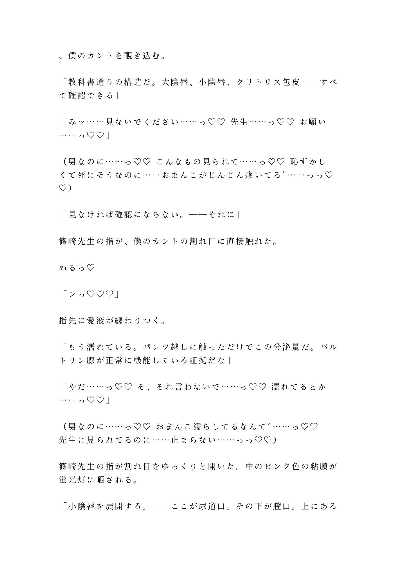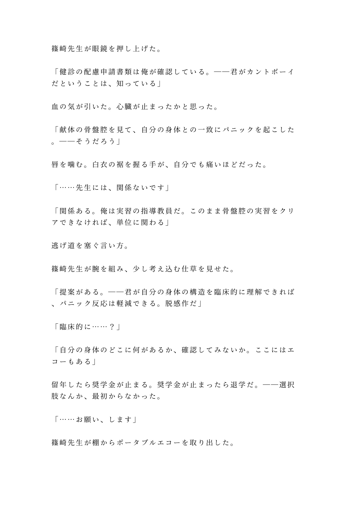医学部のカントボーイは、解剖実習で自分と同じ臓器を見てパニックを起こした。秘密を知る指導教員・篠崎に標本準備室へ連れ出され、「脱感作」と称した身体確認が始まる。エコーで映し出される自分の子宮、恥骨から割れ目へ降りていく長い指——臨床用語で暴かれるたび、触れられたくなかった場所が蜜を溢れさせていく。逃げ場のない密室で、医学生の理性と身体が壊れる。
