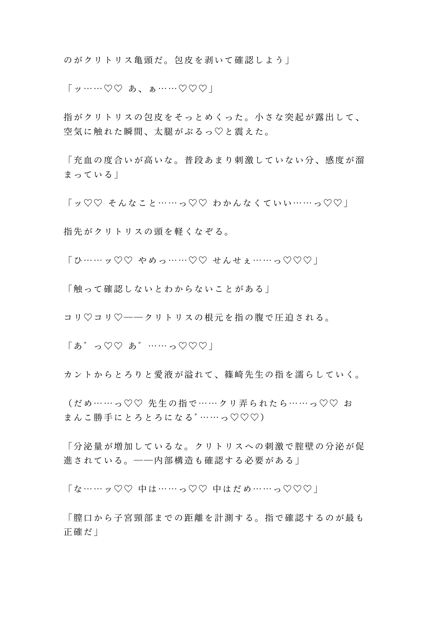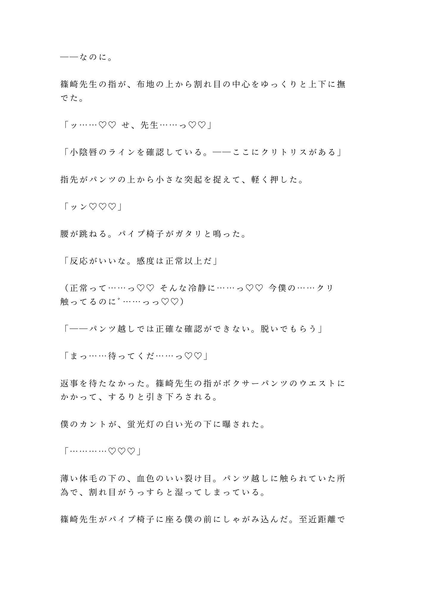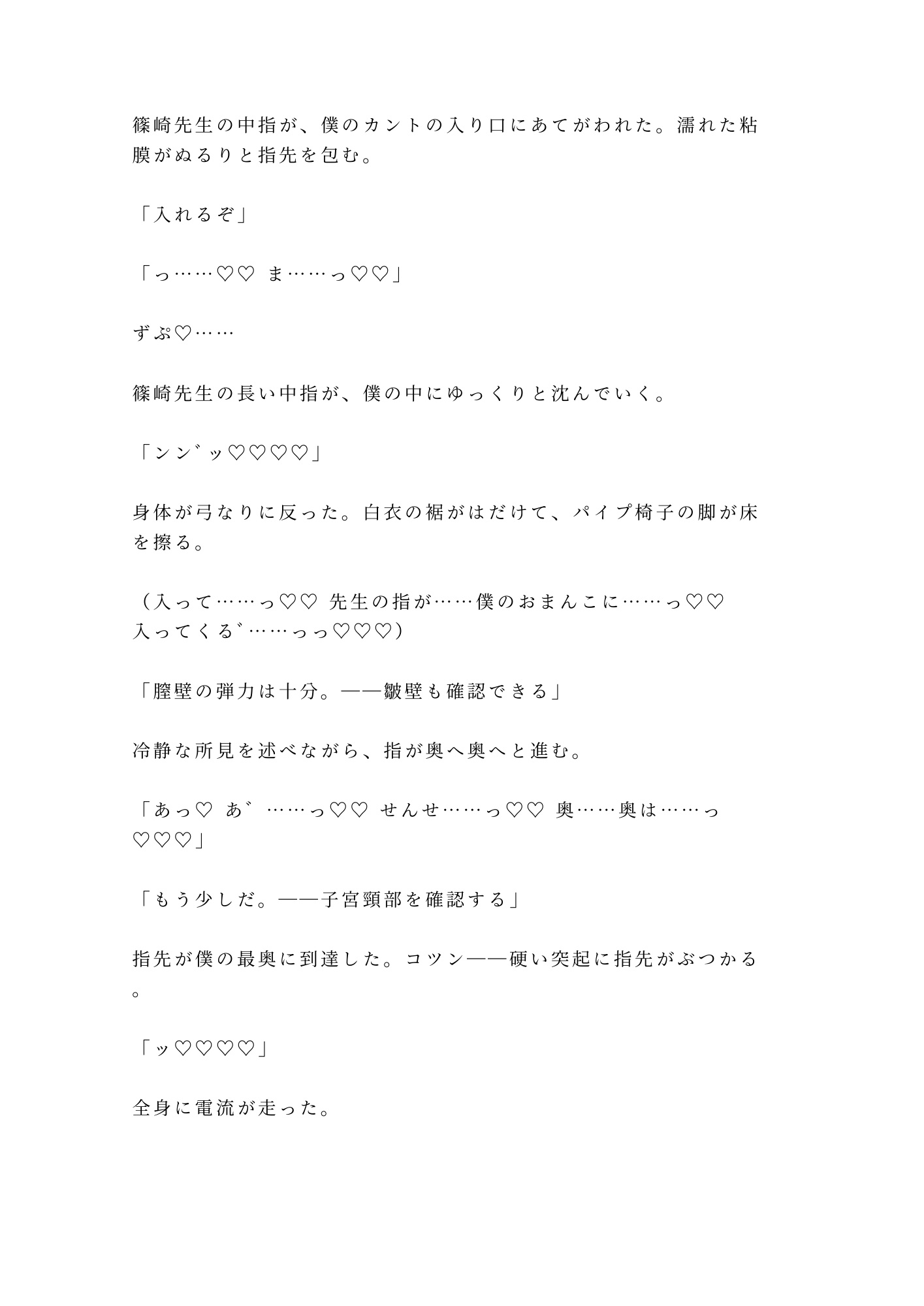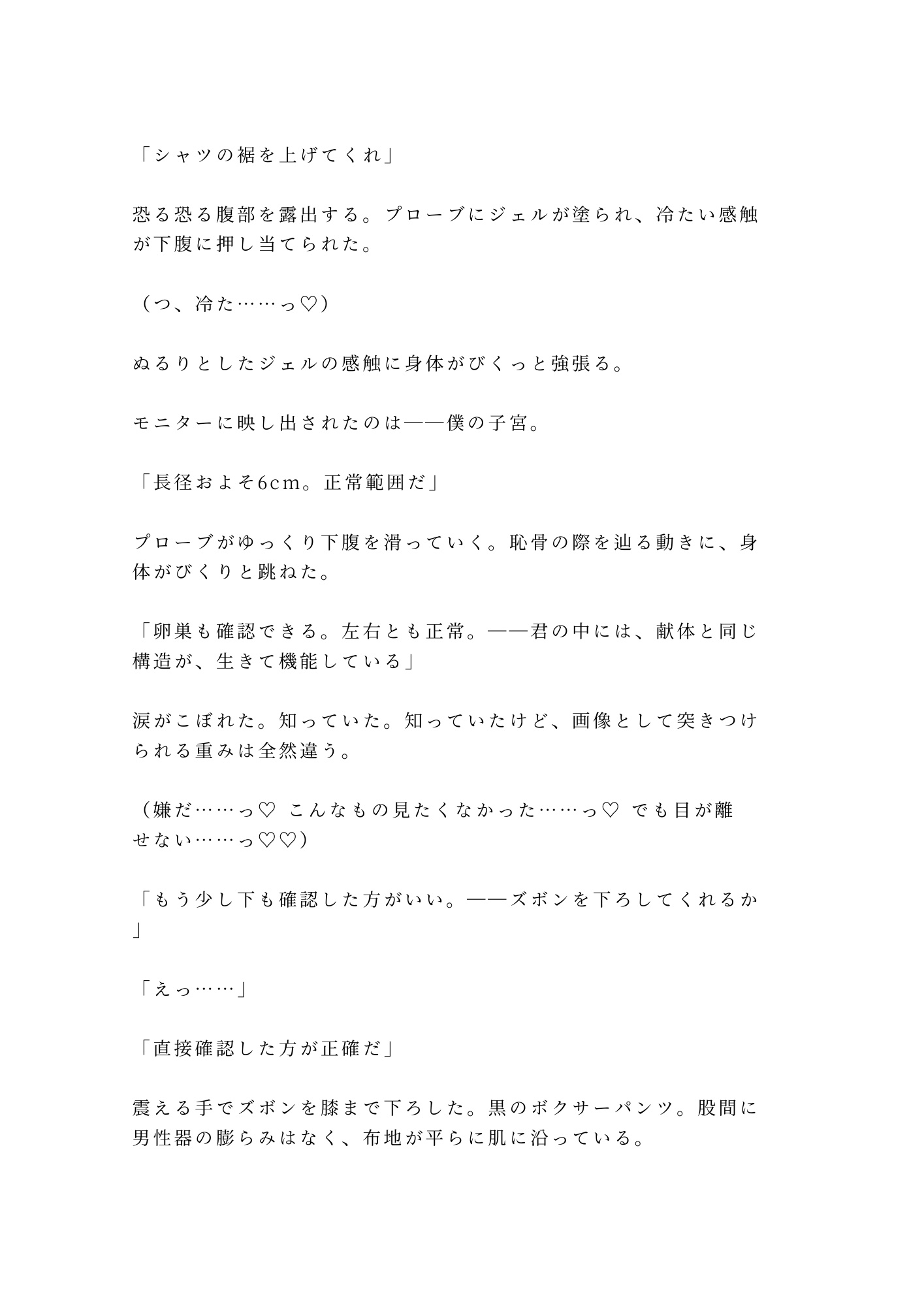 医学部のカントボーイは、解剖実習で自分と同じ臓器を見てパニックを起こした。秘密を知る指導教員・篠崎に標本準備室へ連れ出され、「脱感作」と称した身体確認が始まる。エコーで映し出される自分の子宮、恥骨から割れ目へ降りていく長い指——臨床用語で暴かれるたび、触れられたくなかった場所が蜜を溢れさせていく。逃げ場のない密室で、医学生の理性と身体が壊れる。