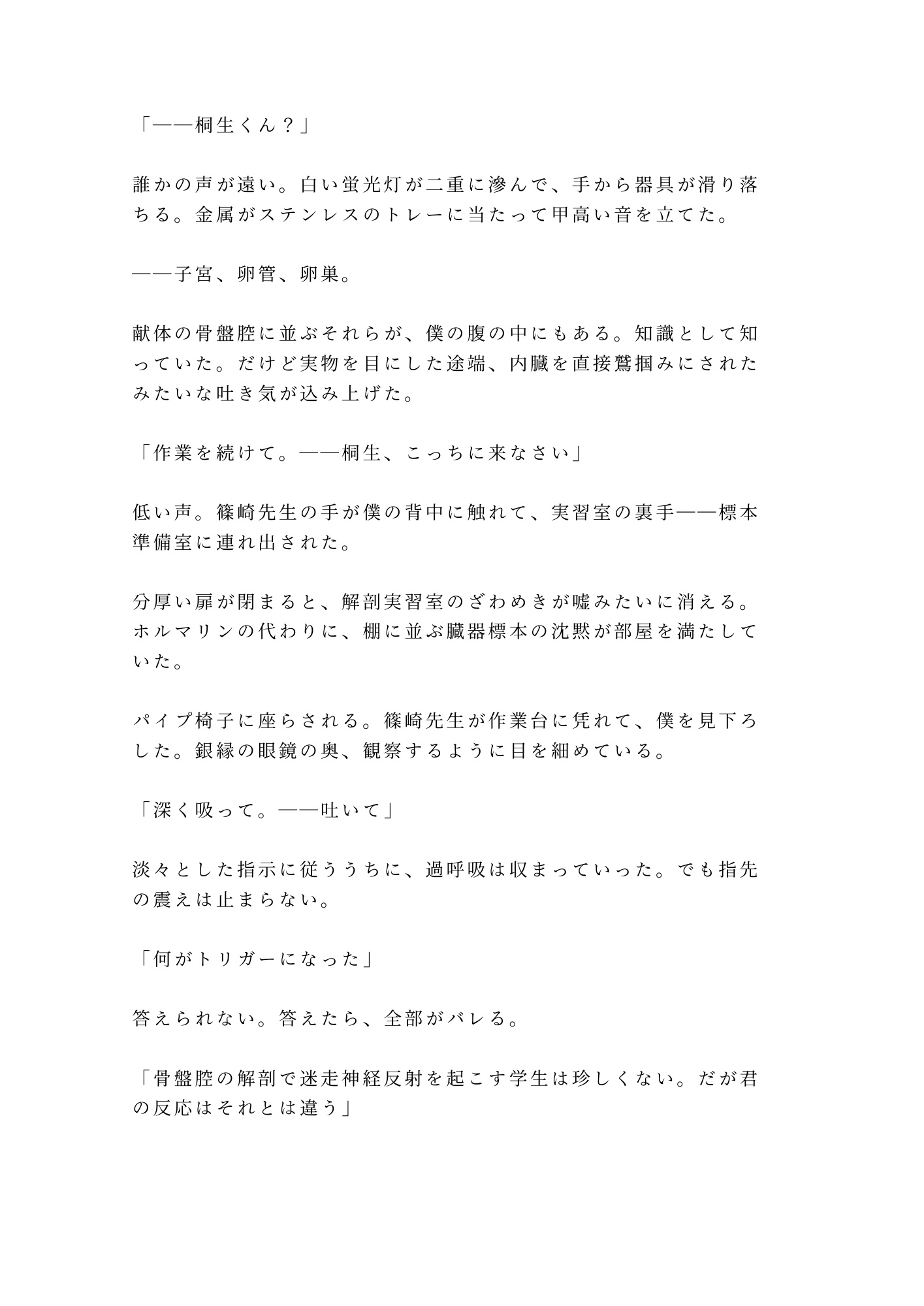 過呼吸を起こした桐生を標本準備室に連れ出したのは、指導教員の篠崎——銀縁眼鏡の奥に冷徹な知性を湛えた、冷静沈着な解剖学者。健診の配慮申請から桐生の秘密をすでに把握していた篠崎は、「脱感作」という名目で桐生の身体を臨床的に確認することを提案する。