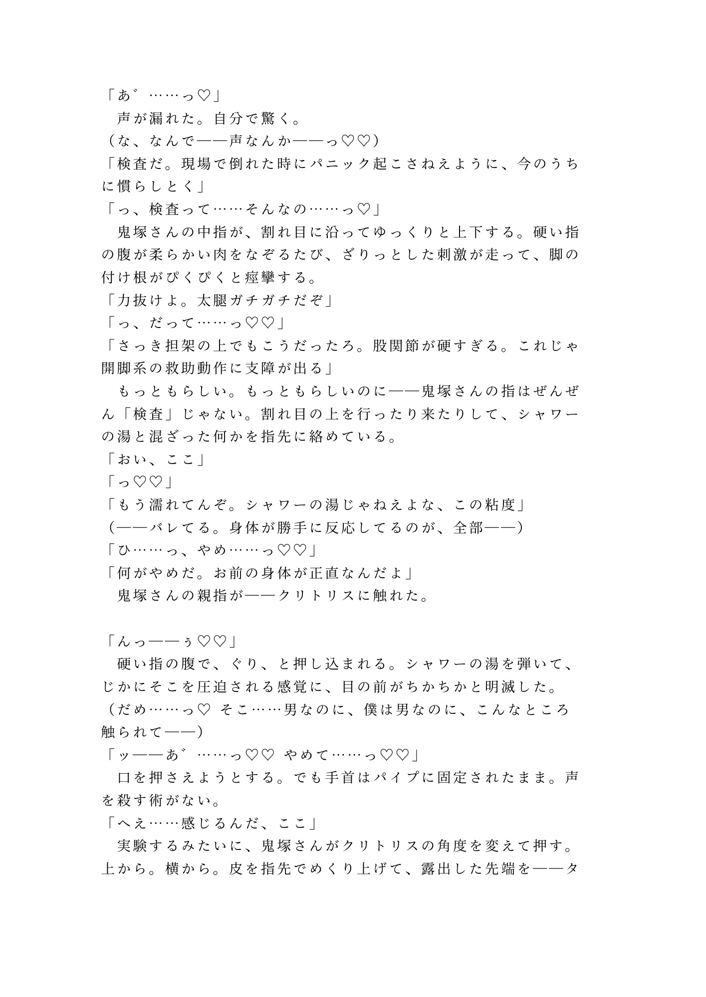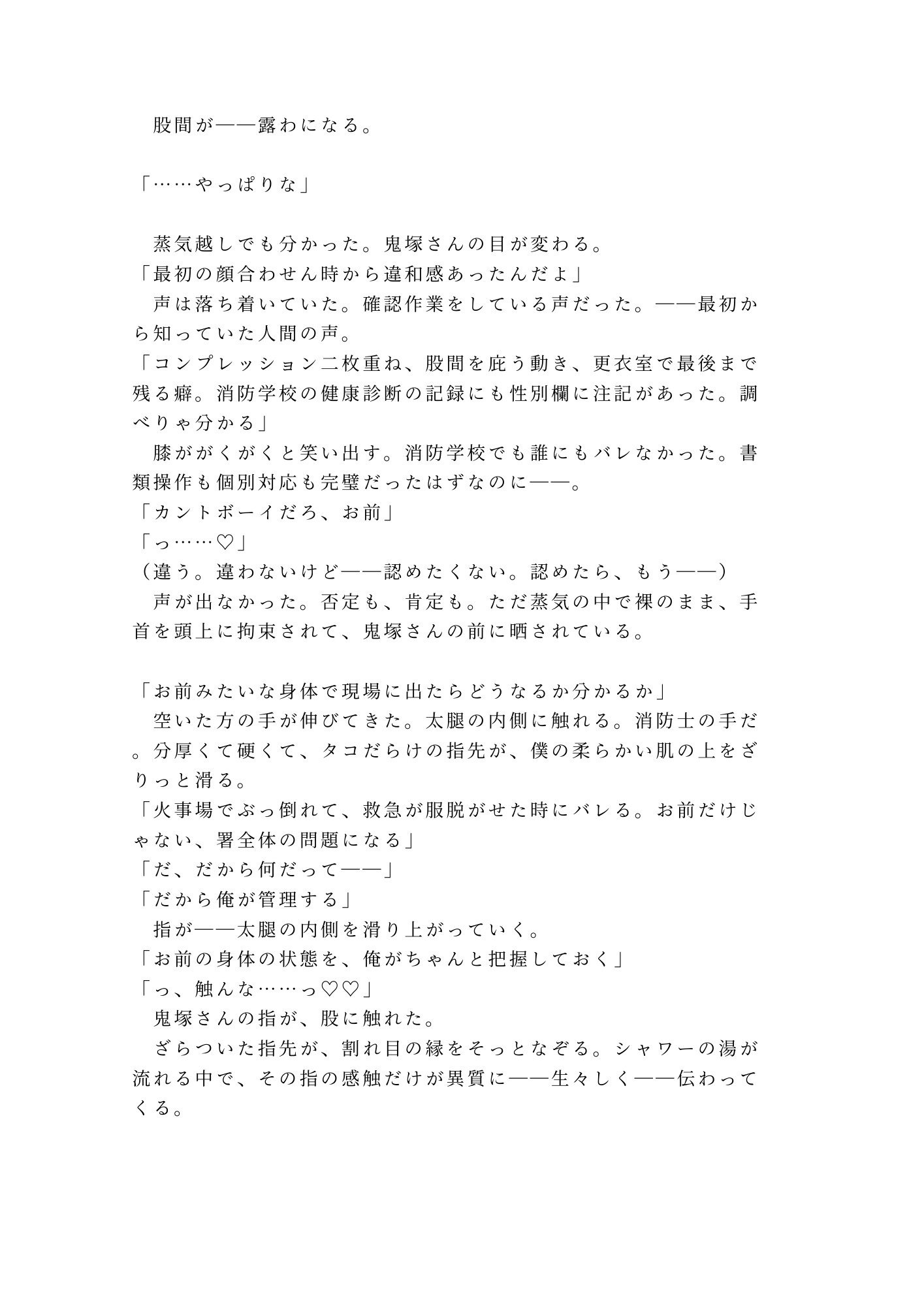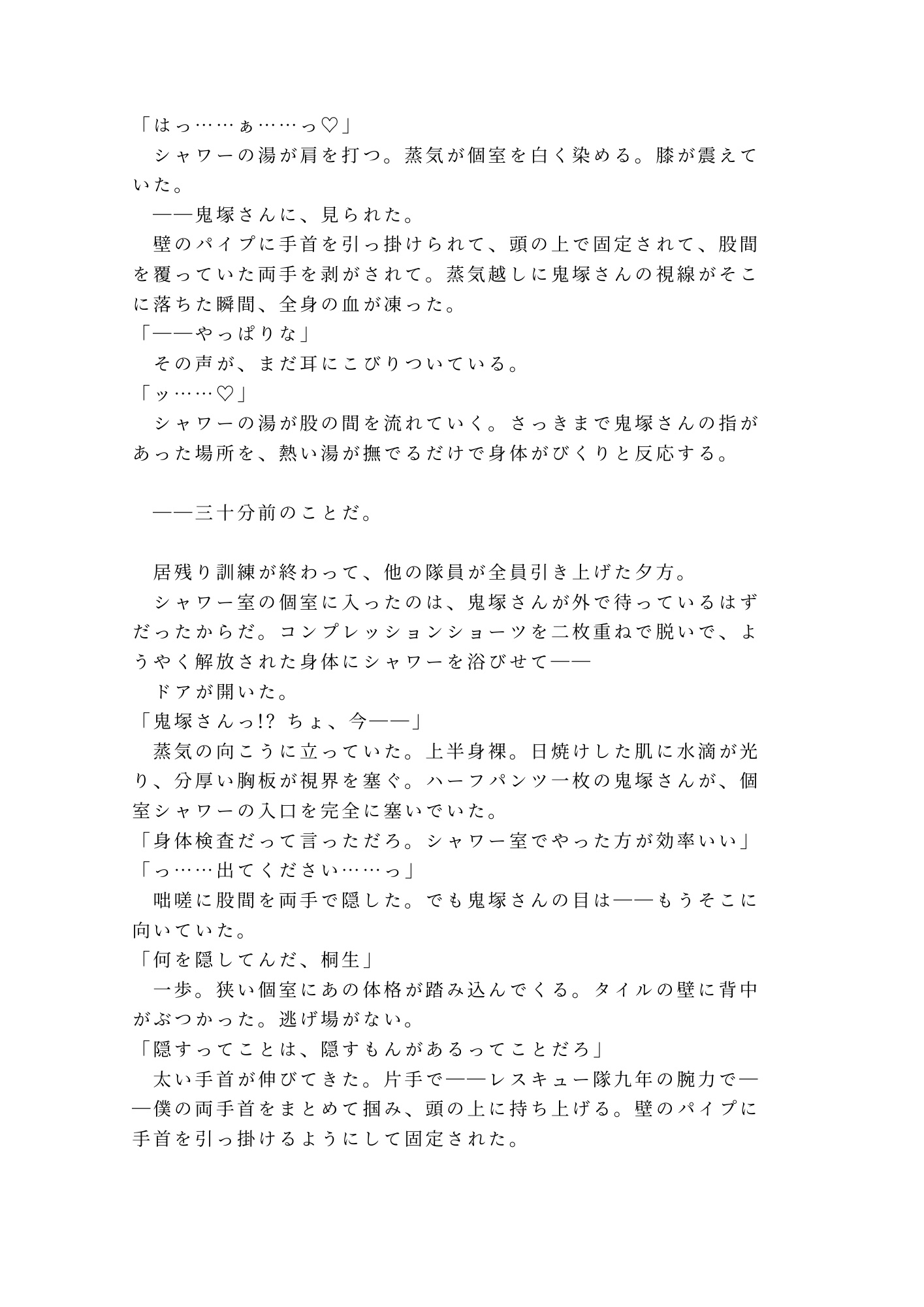 レスキュー隊九年のベテラン・鬼塚先輩だけが、配属初日から全部見抜いていた。健康診断の記録も調べ上げていた。居残り訓練後のシャワー室、蒸気が充満するタイル張りの個室で、ついに鬼塚が動く。