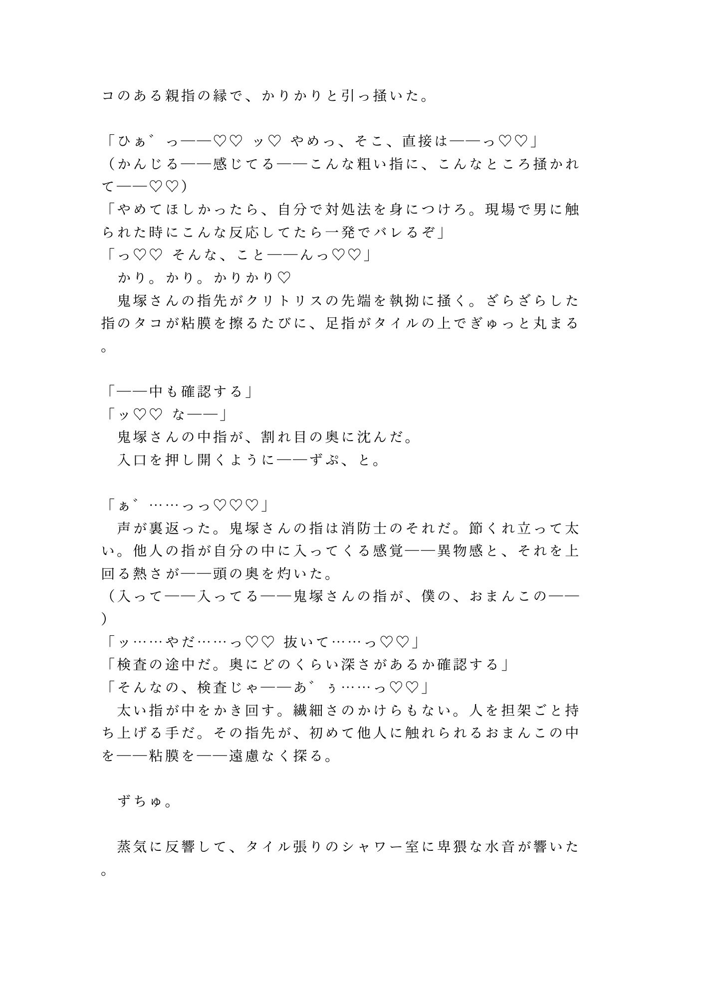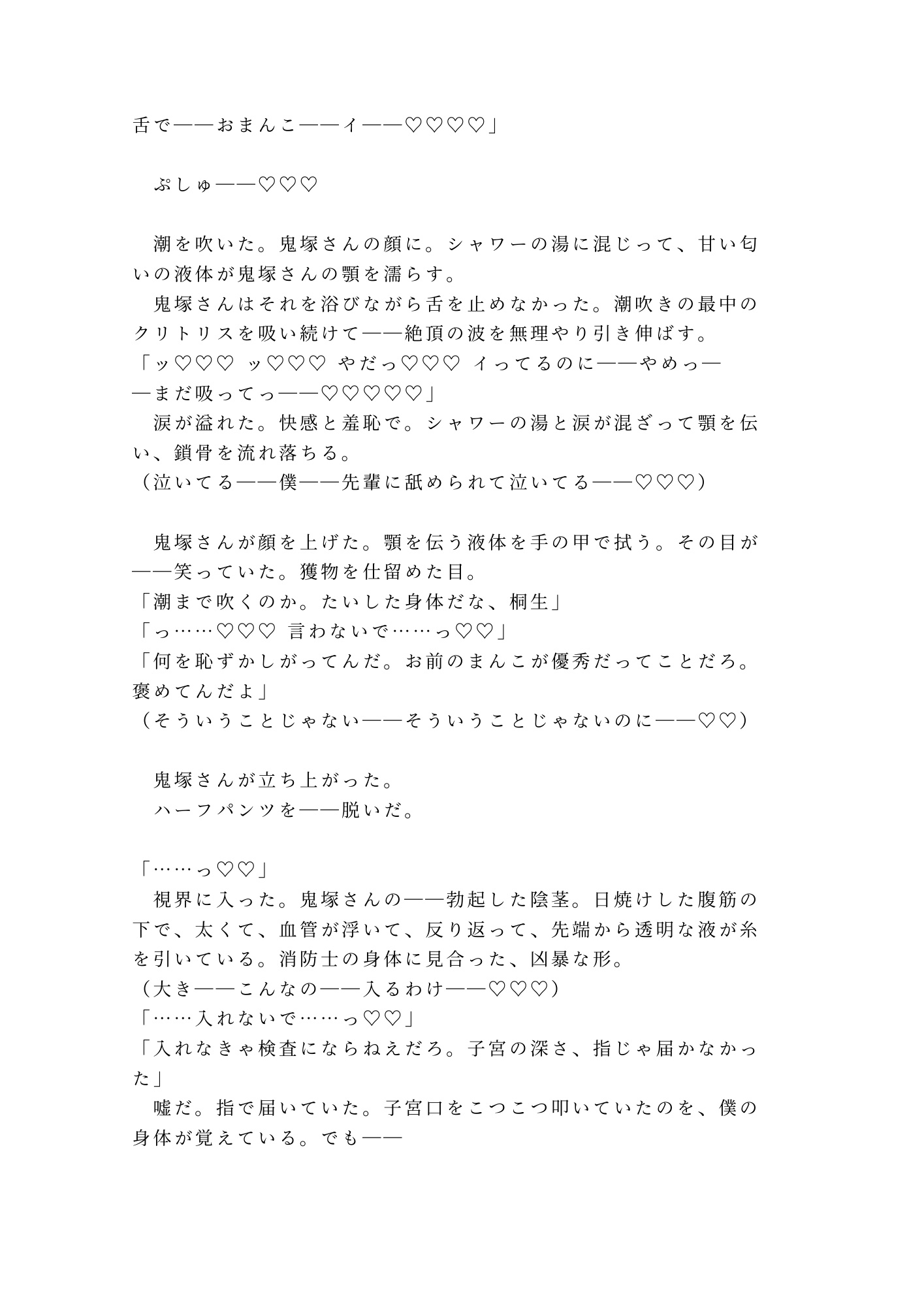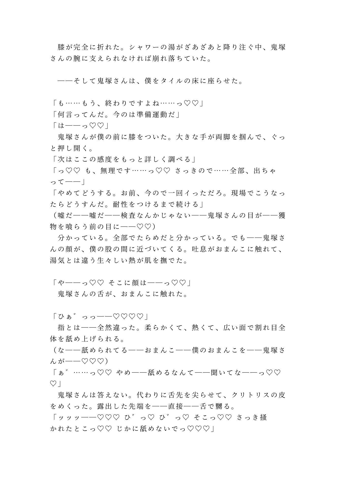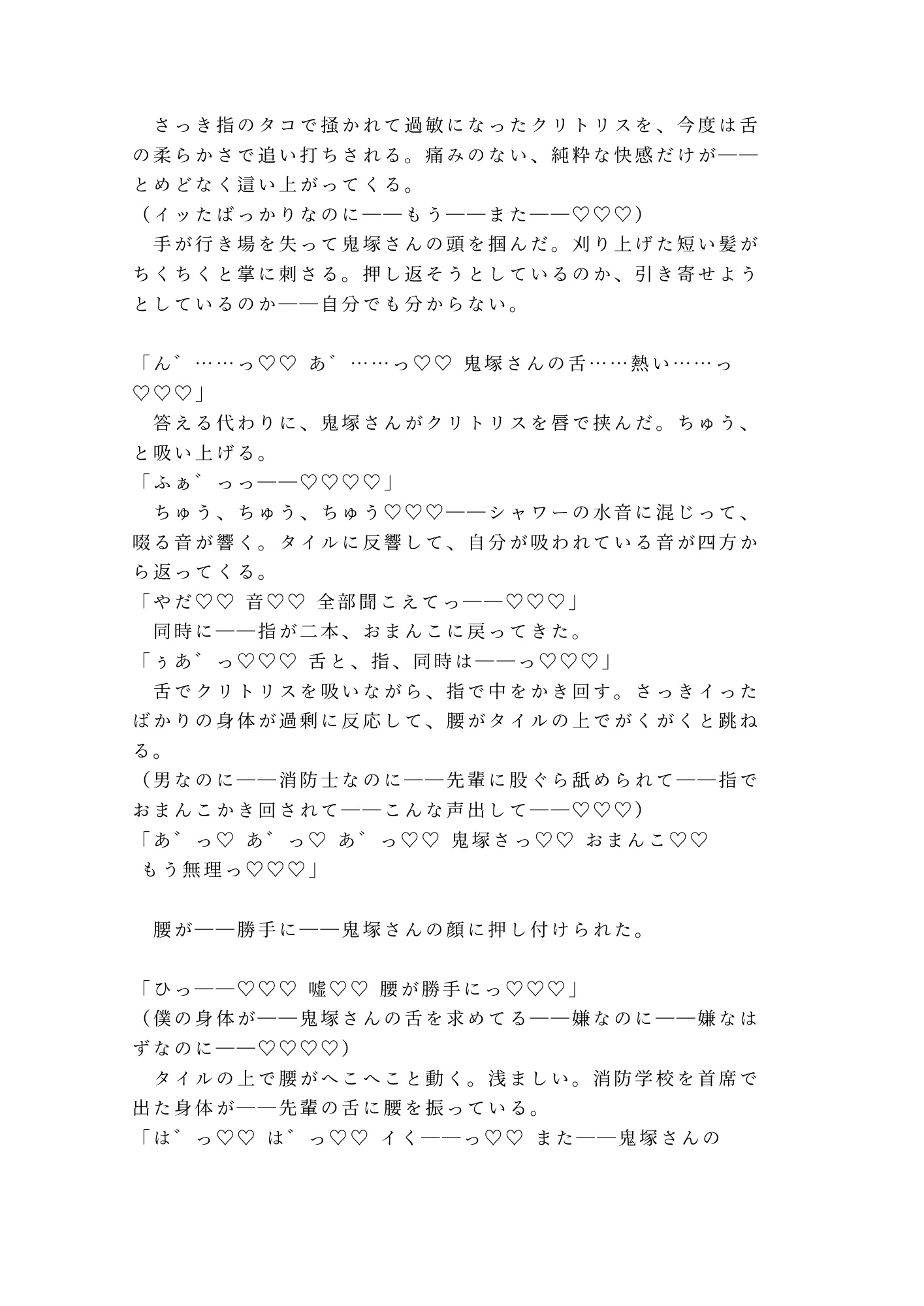レスキュー隊九年のベテラン・鬼塚先輩だけが、配属初日から全部見抜いていた。健康診断の記録も調べ上げていた。居残り訓練後のシャワー室、蒸気が充満するタイル張りの個室で、ついに鬼塚が動く。