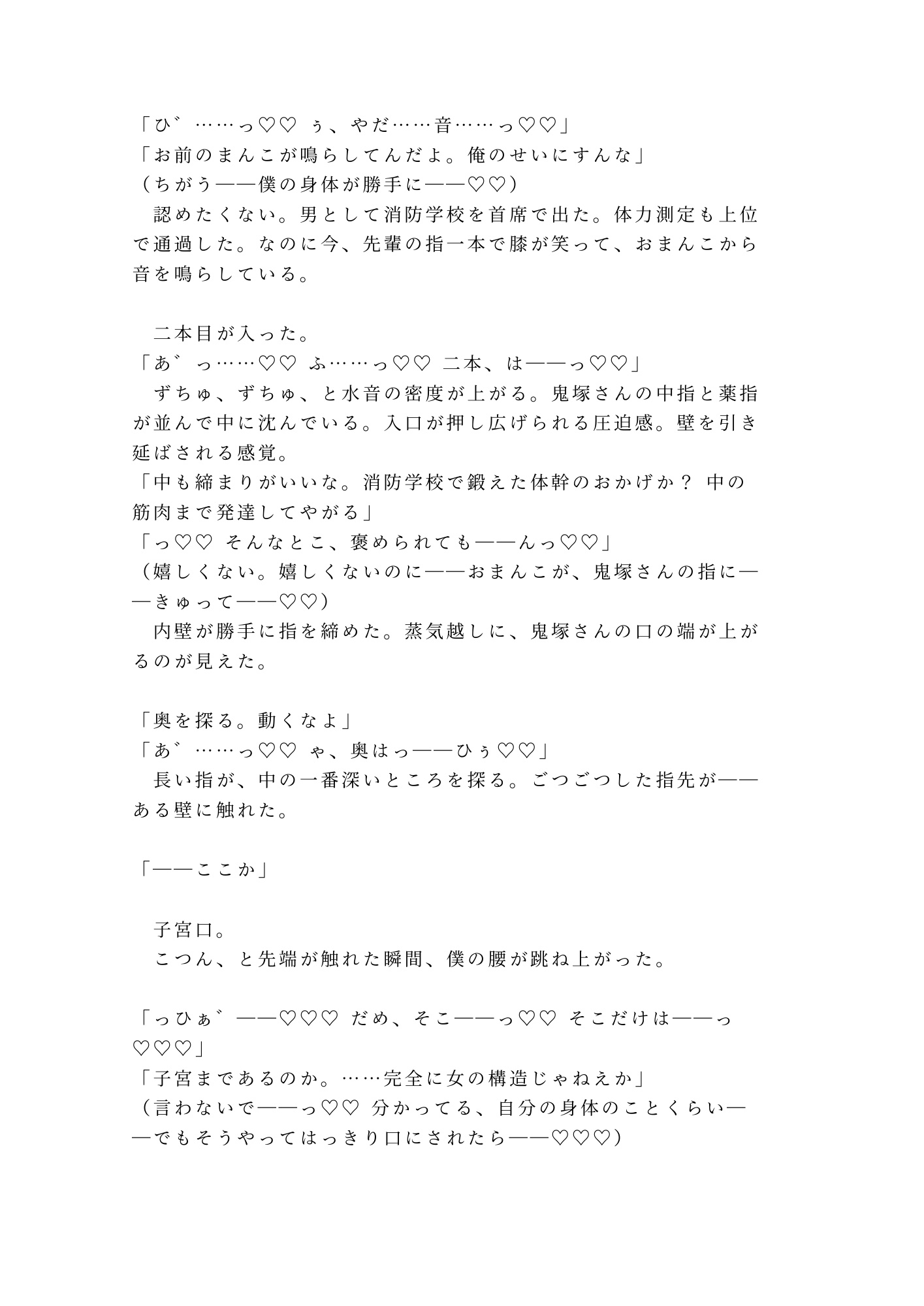 もっともらしい嘘が一番ずるい。検査、効率、耐性訓練――鬼塚の口から出る言葉は全部正論めいていて、だから身体は従ってしまう。舌でクリトリスを吸われ、壁に押しつけられて抱き上げられ、消防士の体力で休みなく子宮を突き上げられる。「おちんぽ」なんて知らないはずの言葉が勝手に口をつく。