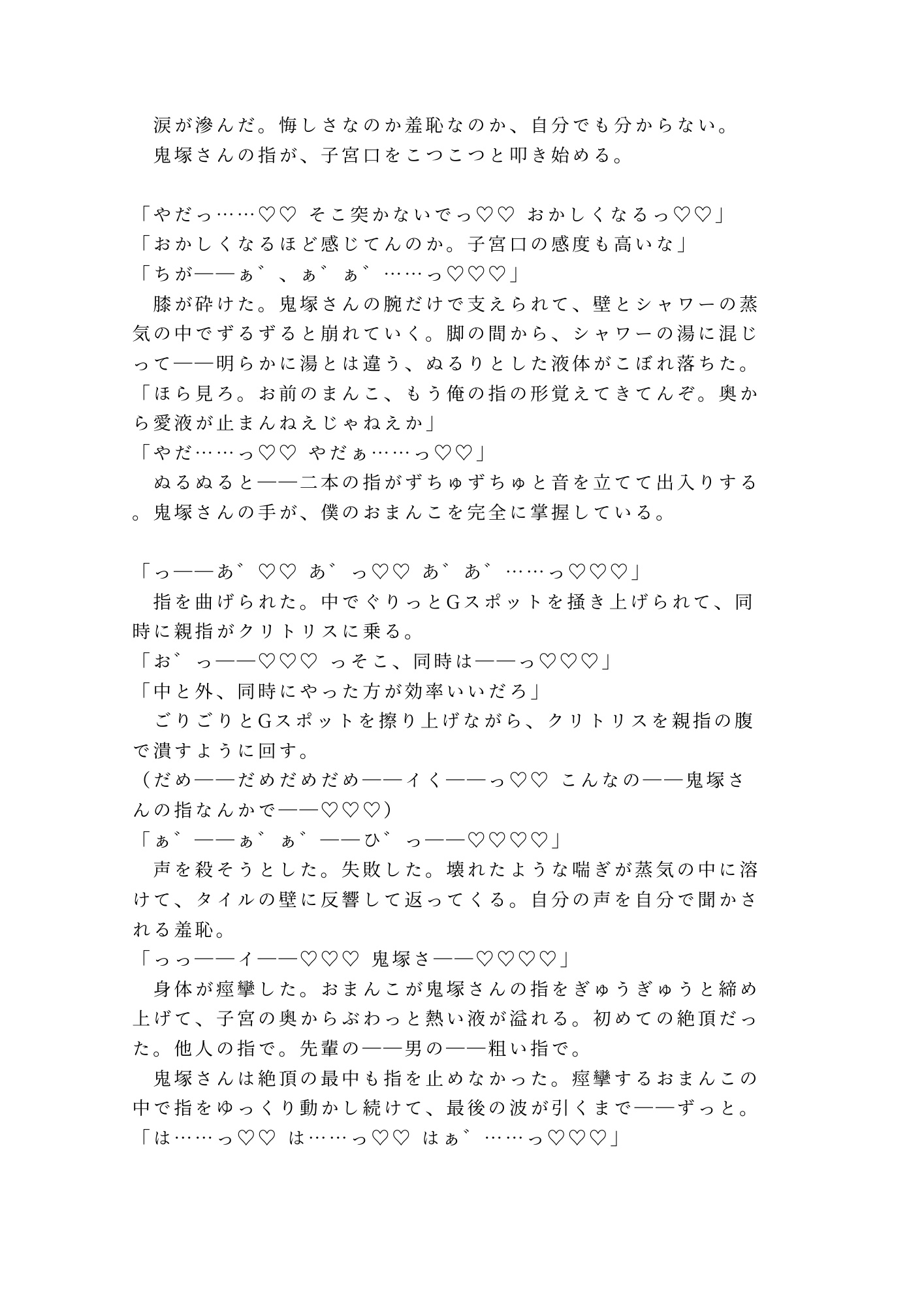 「お前の身体の状態は俺が管理する。他の誰にも触らせるな」中出しされた精液がタイルの排水溝に流れていく。明日も訓練後にここに来なければならない。おまんこが、もう鬼塚の形を覚えてしまったBLカントボーイ官能小説。