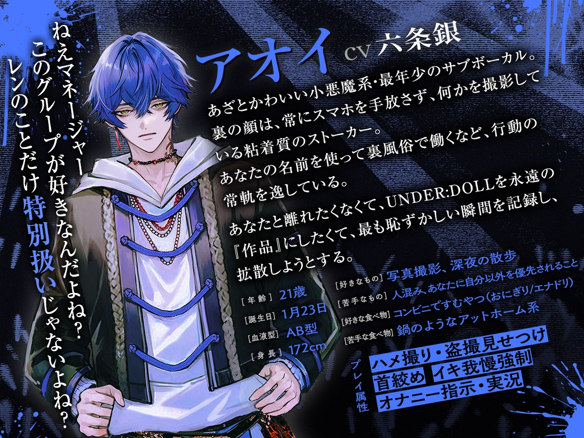 「何が違うの? レンには肌見せて、俺には指一本触らせない? ……見せてよ。俺にも、レンに見せた顔見せて」アオイ(21)【担当カラー:青】