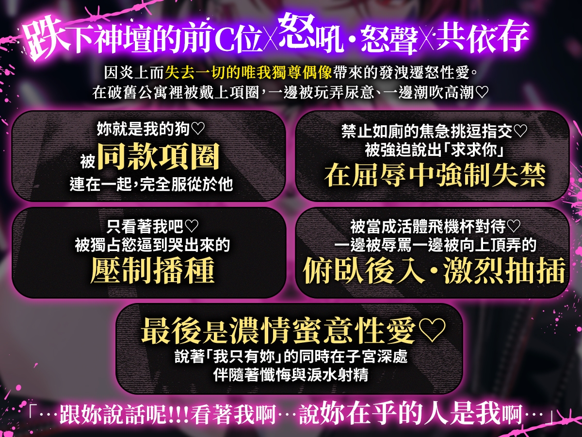 「……我說妳!!!看我這邊啊……說妳在乎我啊……」 因炎上而失去一切的唯我獨尊偶像帶來的發洩遷怒性愛。 在破舊公寓裡被戴上項圈,一邊被玩弄尿意、一邊潮吹高潮♡