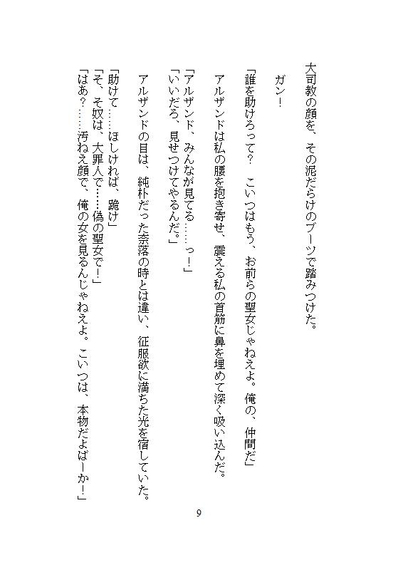 聖職者たちの冷酷な視線とは対照的な、野獣のように熱い眼差し、そして猛々しい肉棒。未開発だった聖女のクリトリスは、飴玉を転がすような執拗なクンニで転がされ、初めての挿入は、猿のようにがっついた猛烈なピストンに白目を剥いて絶頂させられる。魔獣を狩り、アドレナリンを沸騰させたアルザンドに、戦い明けのドロドロの体で何度も、何度も種を注ぎ込まれてしまう。