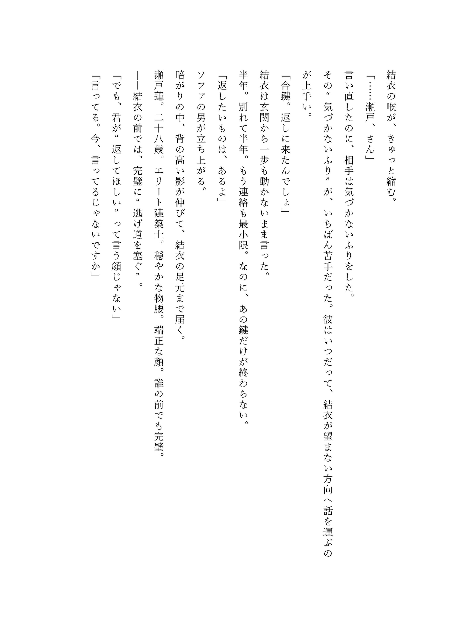 半年前に別れた元カレ・瀬戸蓮が、結衣の合鍵を返してくれない。 「返して」と突き放すたび、彼は穏やかな笑みで距離を詰め、結衣の“嫌いきれない本音”をほどいていく。 身体が覚えてしまった相性と、甘い支配。——鍵の返却は、恋の終わりか、再開か。