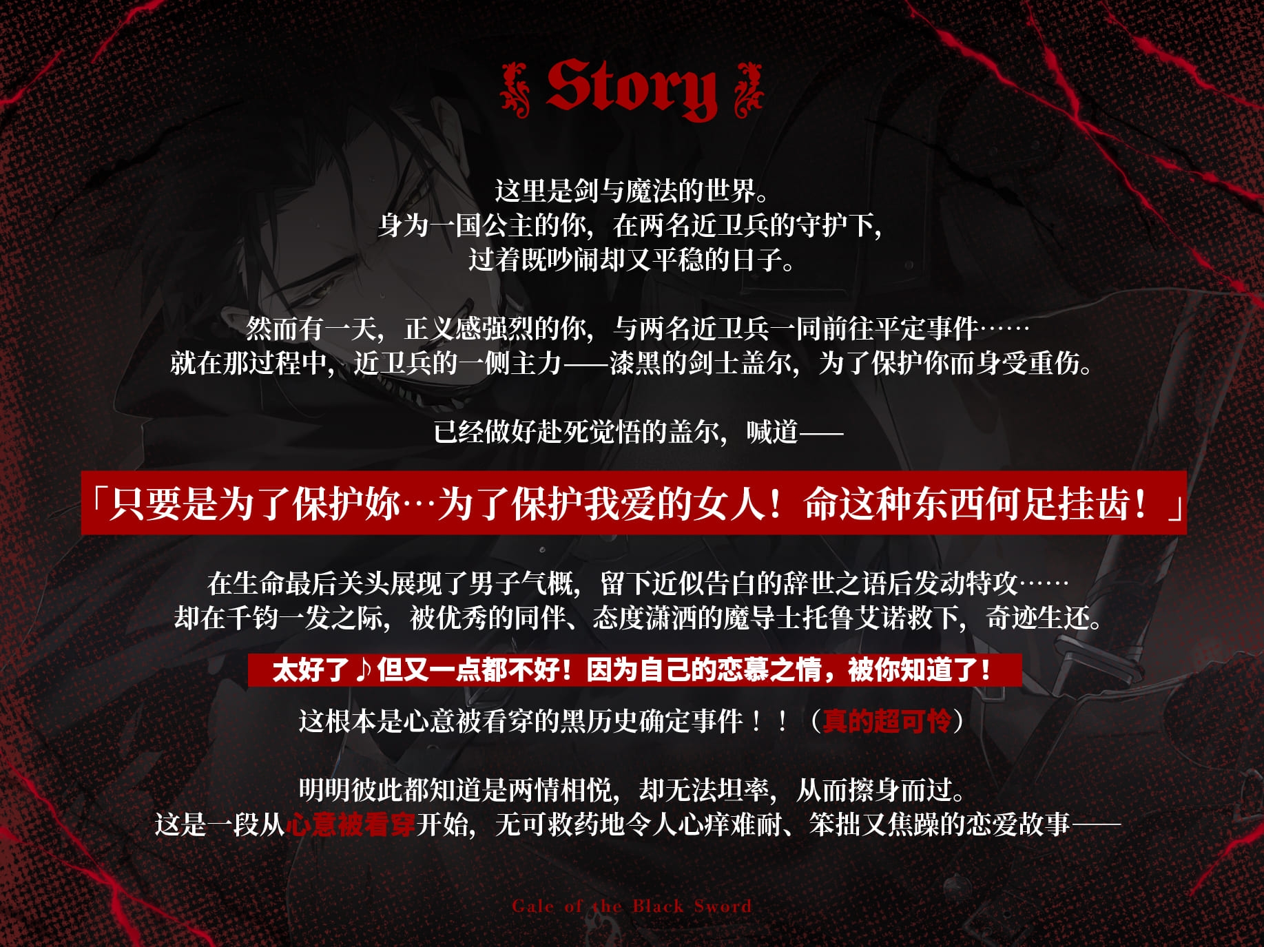 【CV深川绿】「只要是为了保护你⋯为了保护我爱的女人!命这种东西何足挂齿!」粗暴又爱使坏的你的近卫队长在濒死之际所喊出的,竟然是热烈的爱之告白?!在同伴的帮助下捡回一命的他,即使一路与你冲突不断,最后等待着你们的还是幸福圆满的结局!