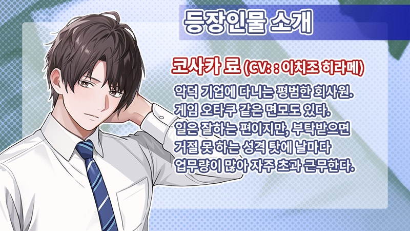 초절정 악덕 기업에 다니는 코사카(CV: 이치조 히라메)는 오늘도 불합리한 초과 근무로 녹초가 된 상태였다.