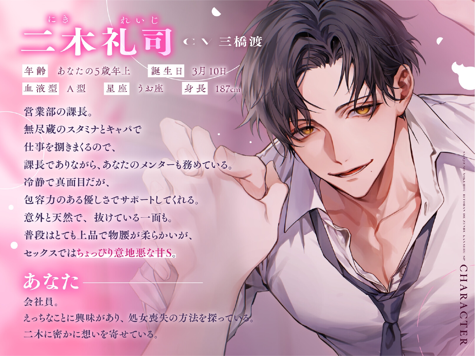 【処女の欲望一晩で全部叶えるSP♡】「僕は今から、あなたの上司ではなく、あなたのことが好きな男です。」 いつでも冷静なあなたの先輩、二木礼司。 密かに想いを寄せていたあなただったが……『処女喪失 方法』『処女喪失 どうすれば』 パソコンの検索履歴を見られてしまう。「ちょっと、今だけ…、『上司の二木』の役を降りてお話するんですが。……僕とか、どうですか?」初体験の夢ぜ〜んぶ叶えてくれる、しあわせ愛され処女喪失体験……♡