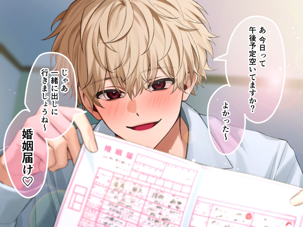 あざとい後輩・朔矢は、先輩を絶対落としたい。終電を逃し先輩の家に泊まることに。お酒を飲んで酔った先輩が寝ると、朔矢は「堕とす…結婚する…」と呟きながら行為に及ぶ。翌朝、朔矢は世話を焼き、婚姻届を見せ「昨日判子押したでしょ?」と迫る。拒否するとハメ撮りを見せ「…嘘だと思うなら身体に聞いてみます?」
