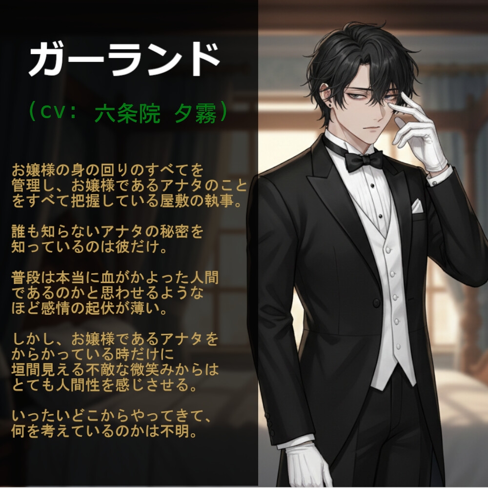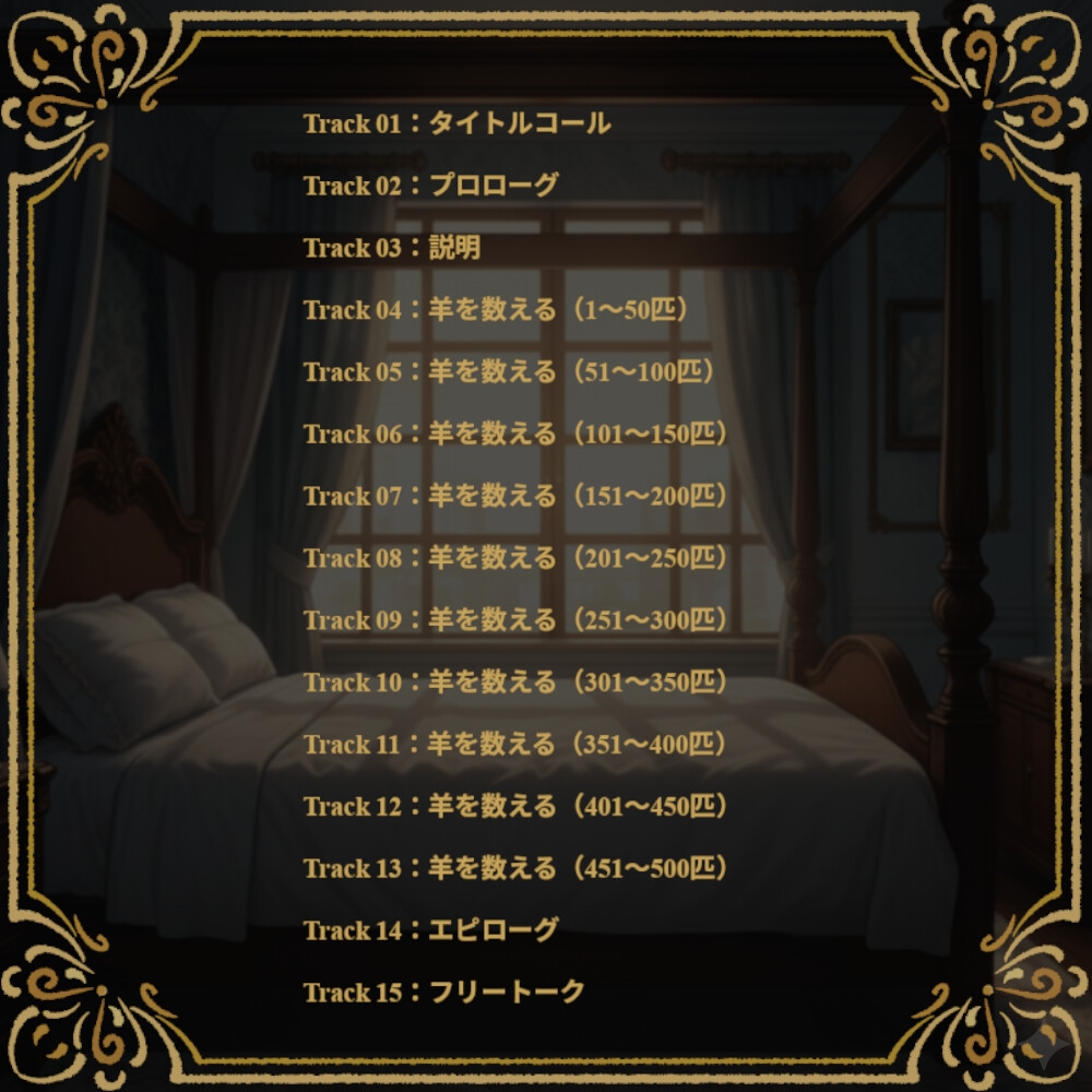 【初作品リリース記念・30%OFF】執事とアナタの夜を、ぜひこの機会にご体験ください【70分超/500匹】お疲れのお嬢様へ、事務的執事から“添い寝付き”の羊数えを。夜中に漏れ聞こえるお嬢様の“秘密”をたしなめつつも、献身的に(?)奉仕いたします。事務的な彼の本心が零れるエピローグまで、一晩中お側でお守りします。お淑やかさを忘れて乱れるお嬢様を、安らかな夢へと誘う特別な一夜。