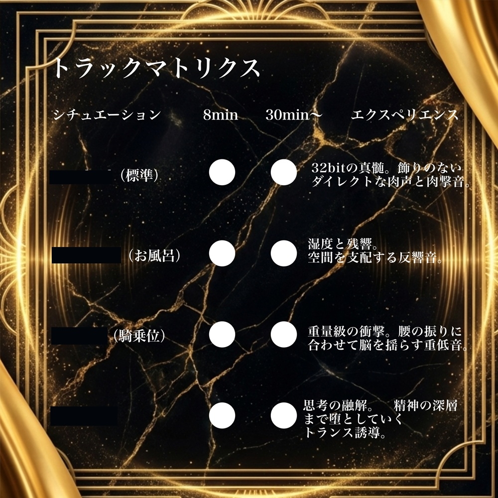 本作的核心在于48kHz/32bit Float超高解析度所描绘出的“绝对真实感”。 耳畔呢喃的体温、伴随律动的肉声、密室中弥漫的湿气——这一切都将令您的理性升华,将您引入无法抗拒的深渊。