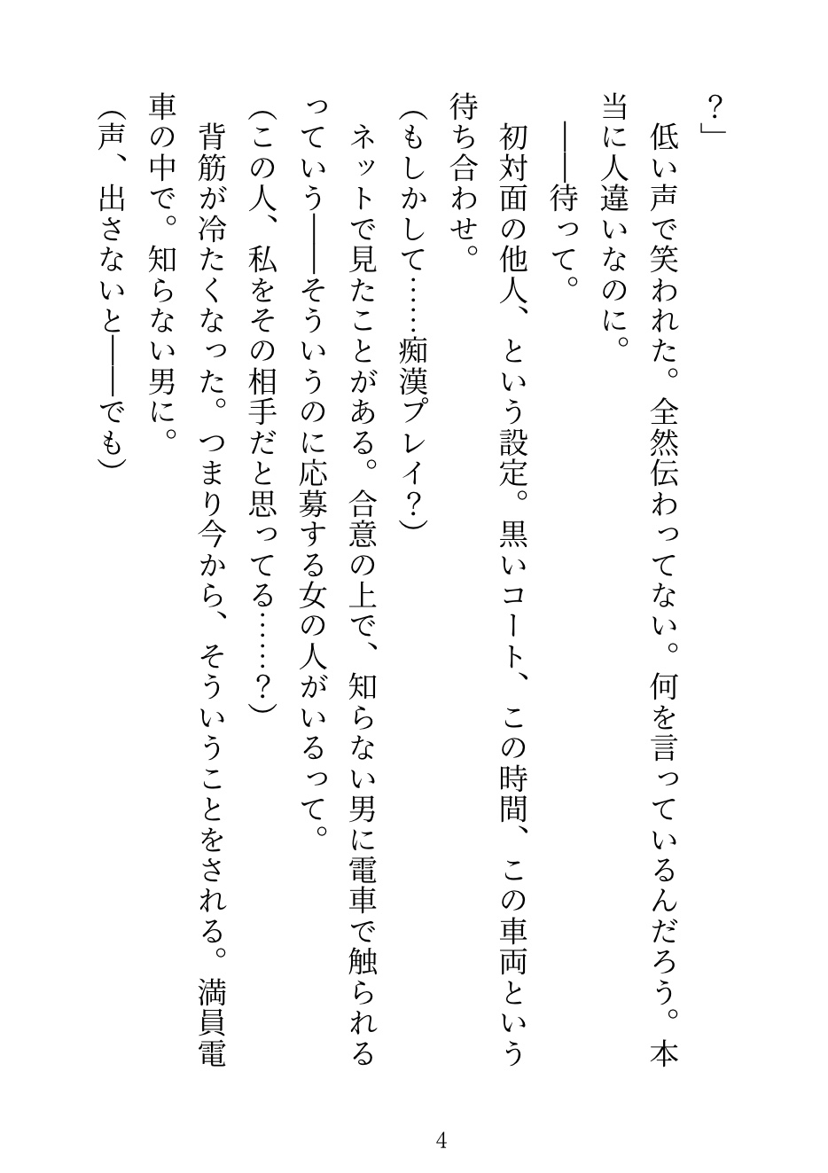 痴○プレイ/初対面/満員電車/声我慢/乳首責め/クンニ/クリ責め/指責め/寸止め/潮吹き/連続絶頂/挿入/外出し