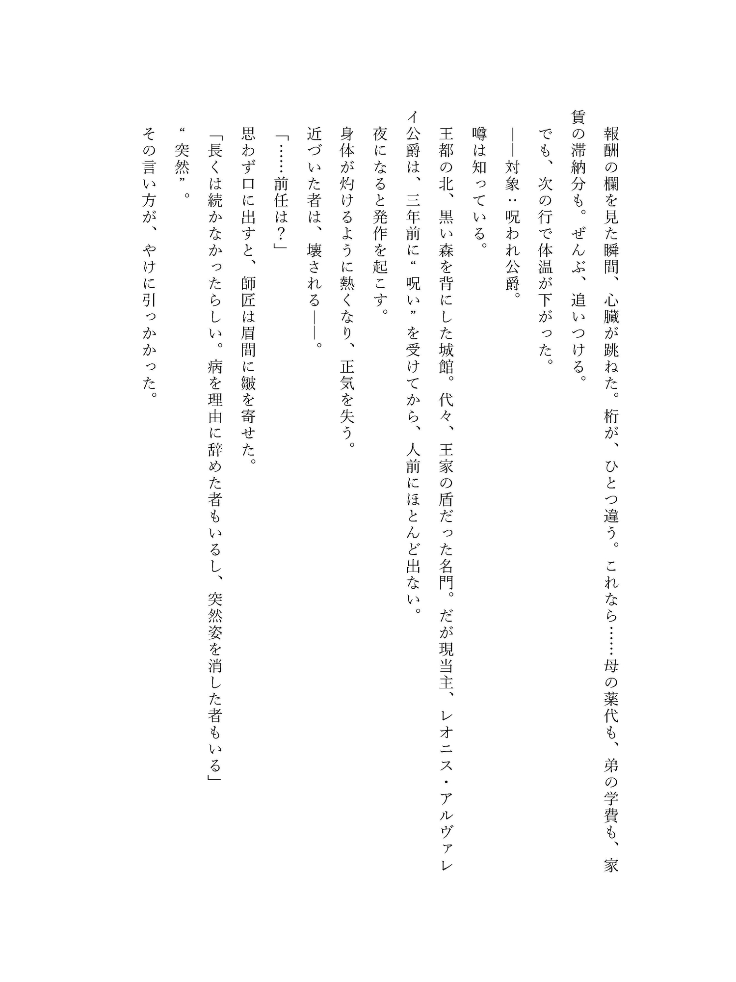 リリアは貧しい薬師見習い。ある日、呪いに蝕まれた公爵レオニスの屋敷で「発作時の看病係」を任される。