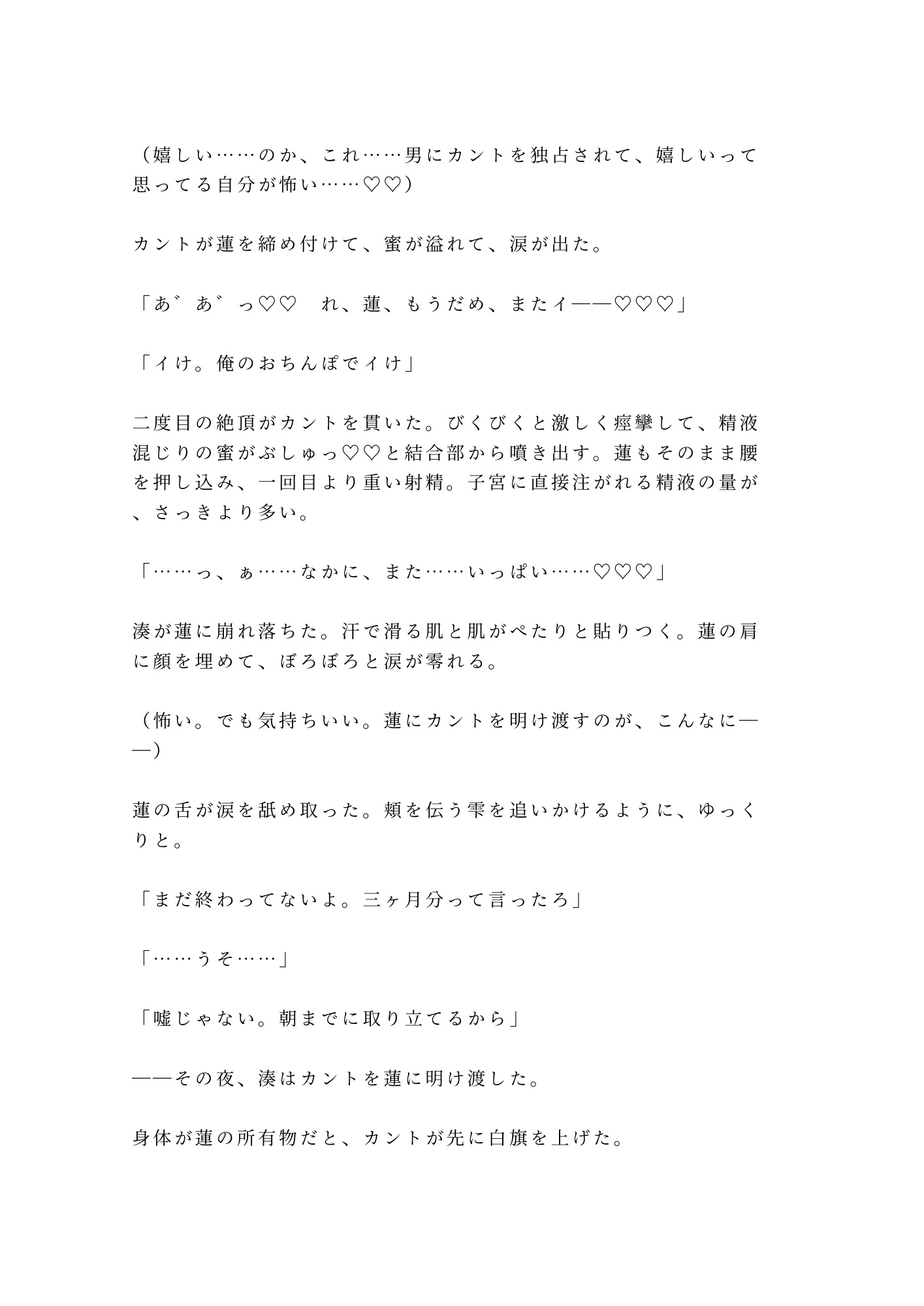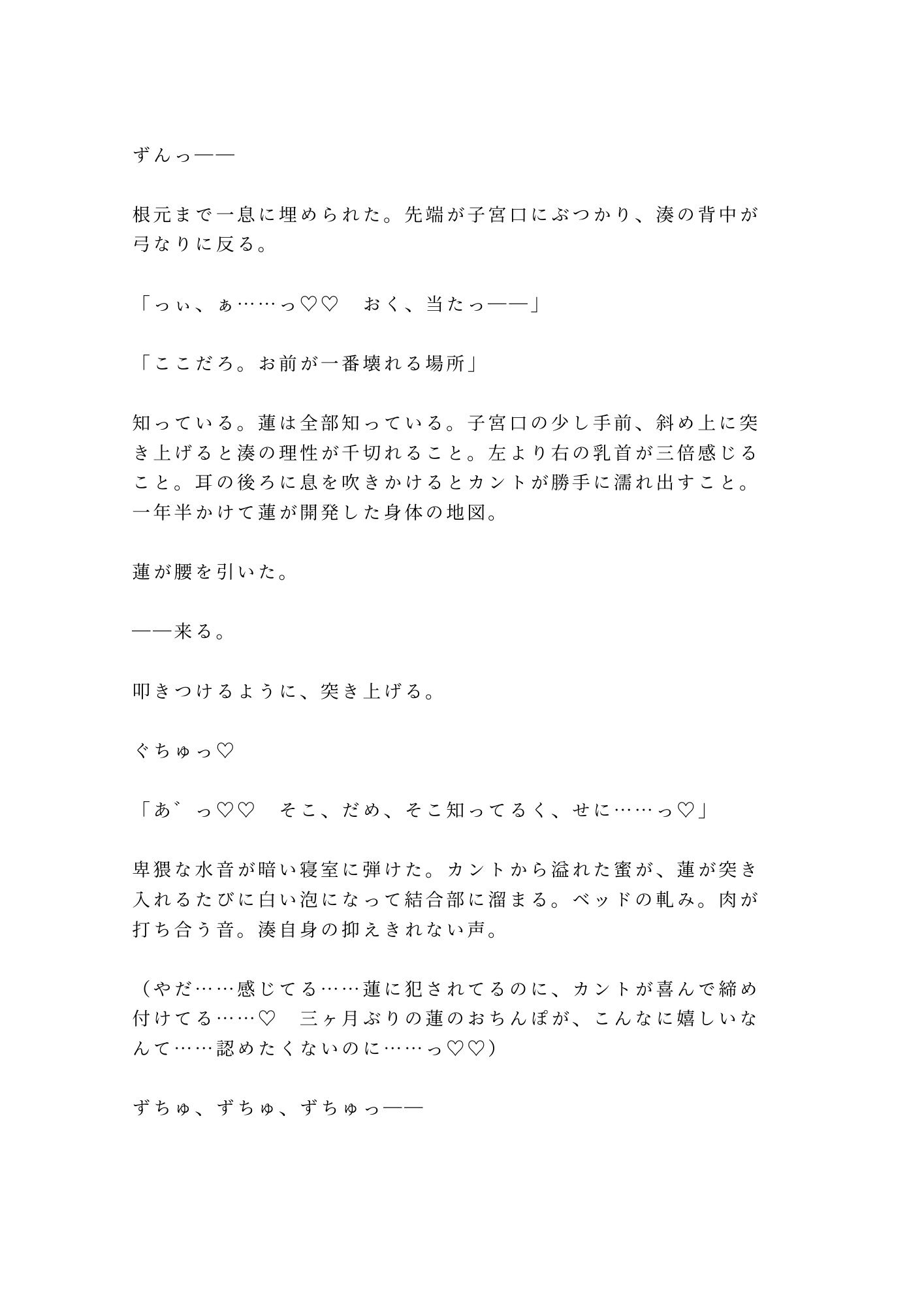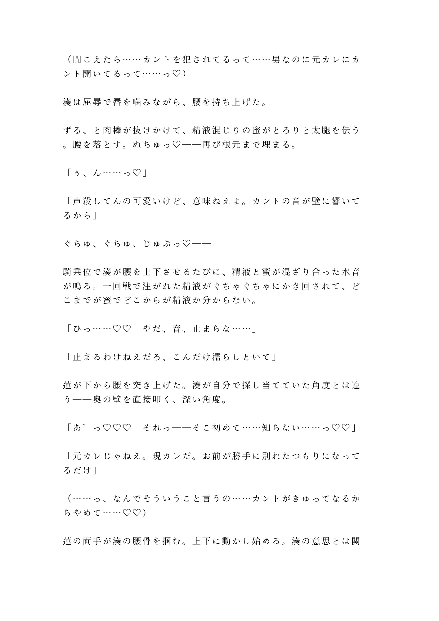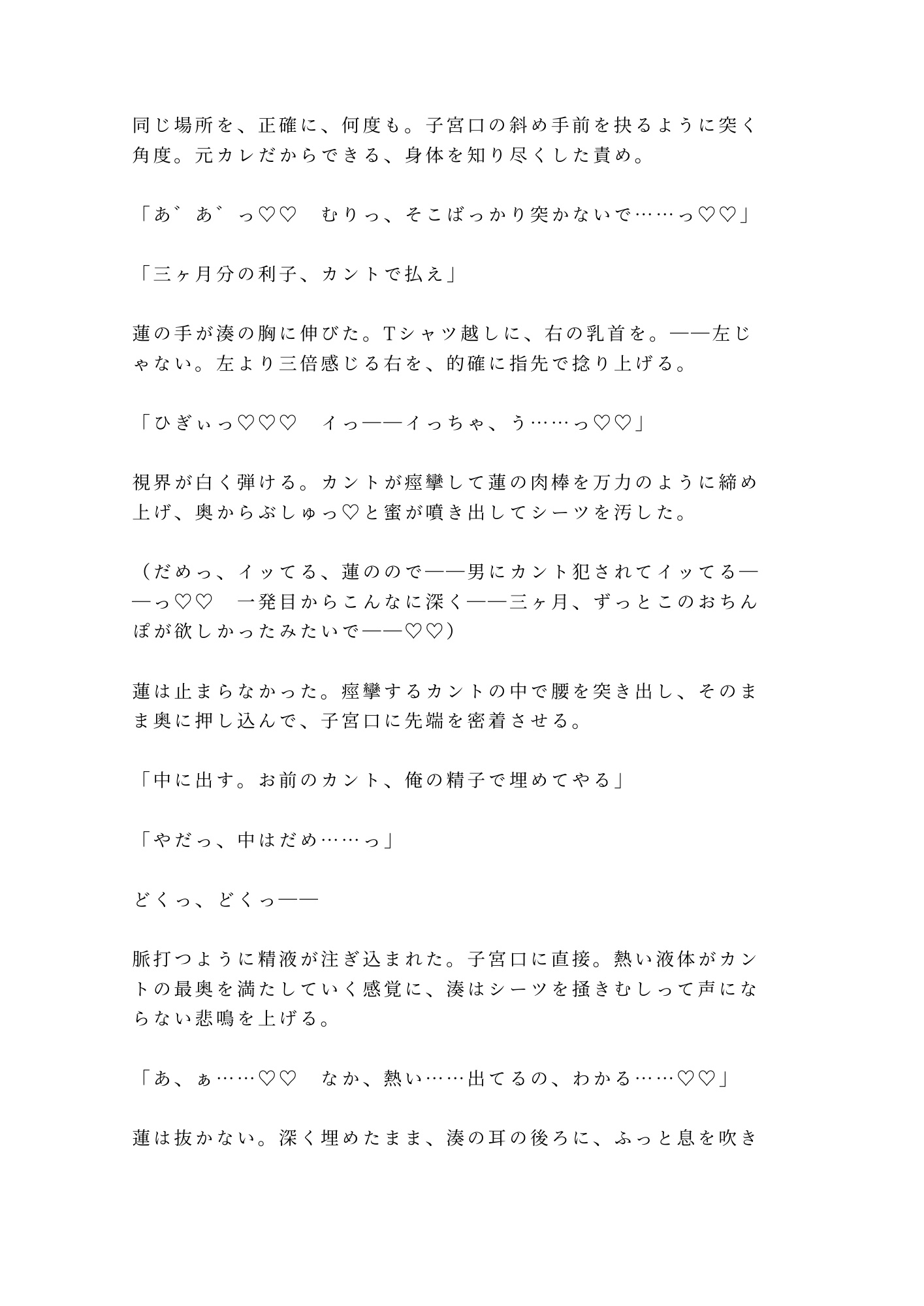 抵抗する頭と、元カレを招き入れる身体。嫌だと叫ぶ唇と、締め付けて離さないカント。毎晩繰り返される五回の中出しで、湊の理性は一枚ずつ剥がされていく。