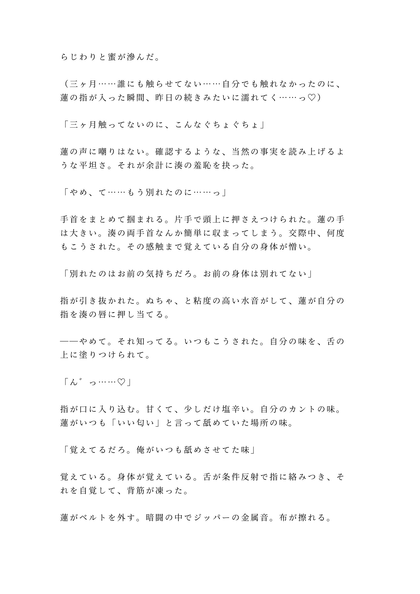 引っ越したばかりの深夜、合鍵で侵入してきた元カレ・氷室蓮。三ヶ月間、誰にも触らせなかった身体は、蓮の指が触れた瞬間、昨日の続きみたいに濡れ出した。