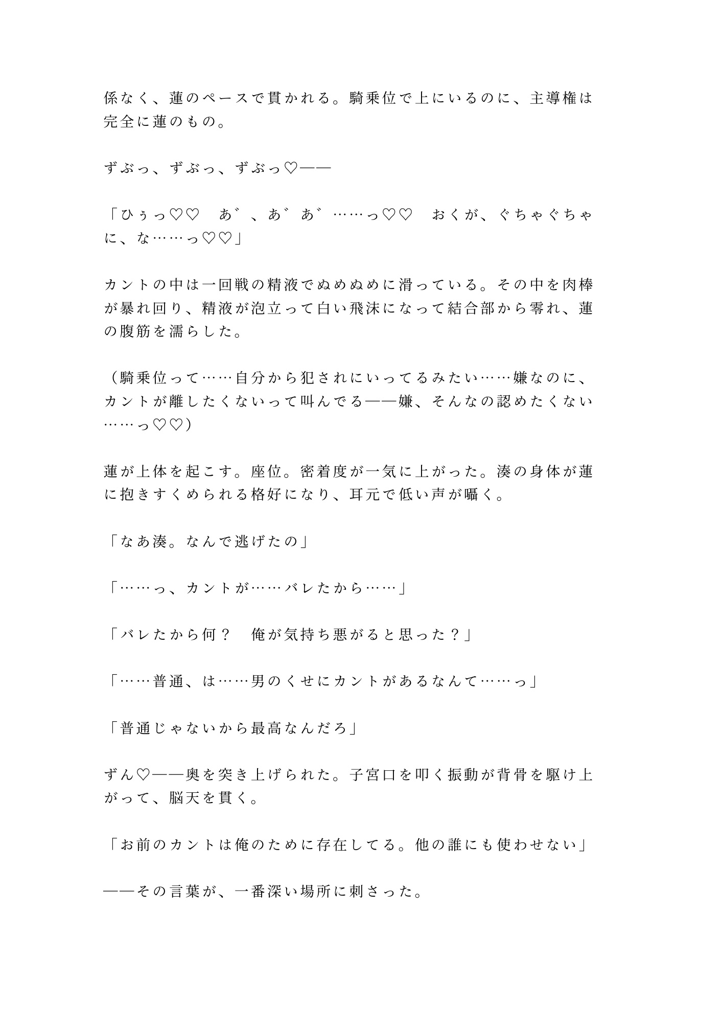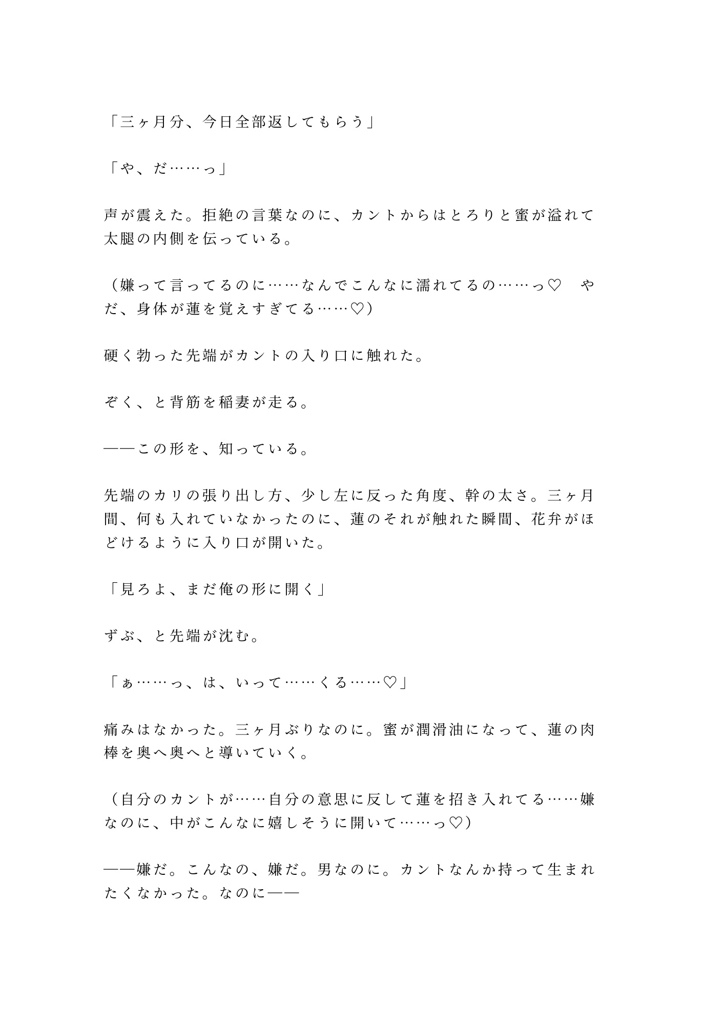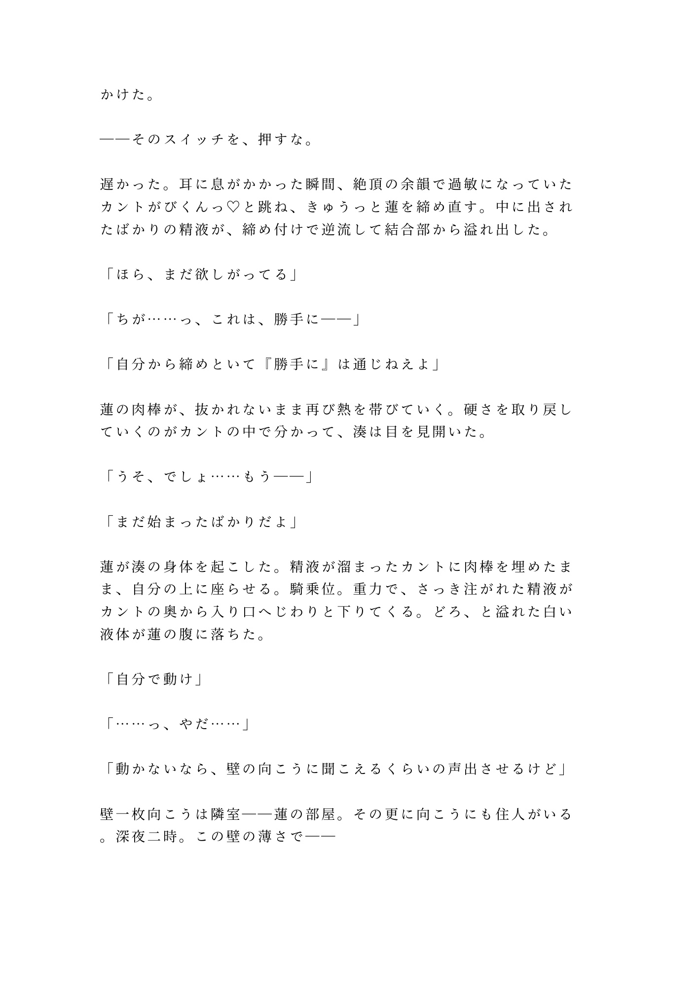 身体を知り尽くした執着攻め×カント持ちの抵抗できない受け。声だけで濡れる身体、壁越しの支配、逃げ場のない隣室という檻。「もう戻れない」と分かっていながら、自分から腰を振ってしまうまでの転落を、圧倒的な熱量と密度で描き切った一作。読み終わる頃には、あなたも湊と一緒に堕ちている。