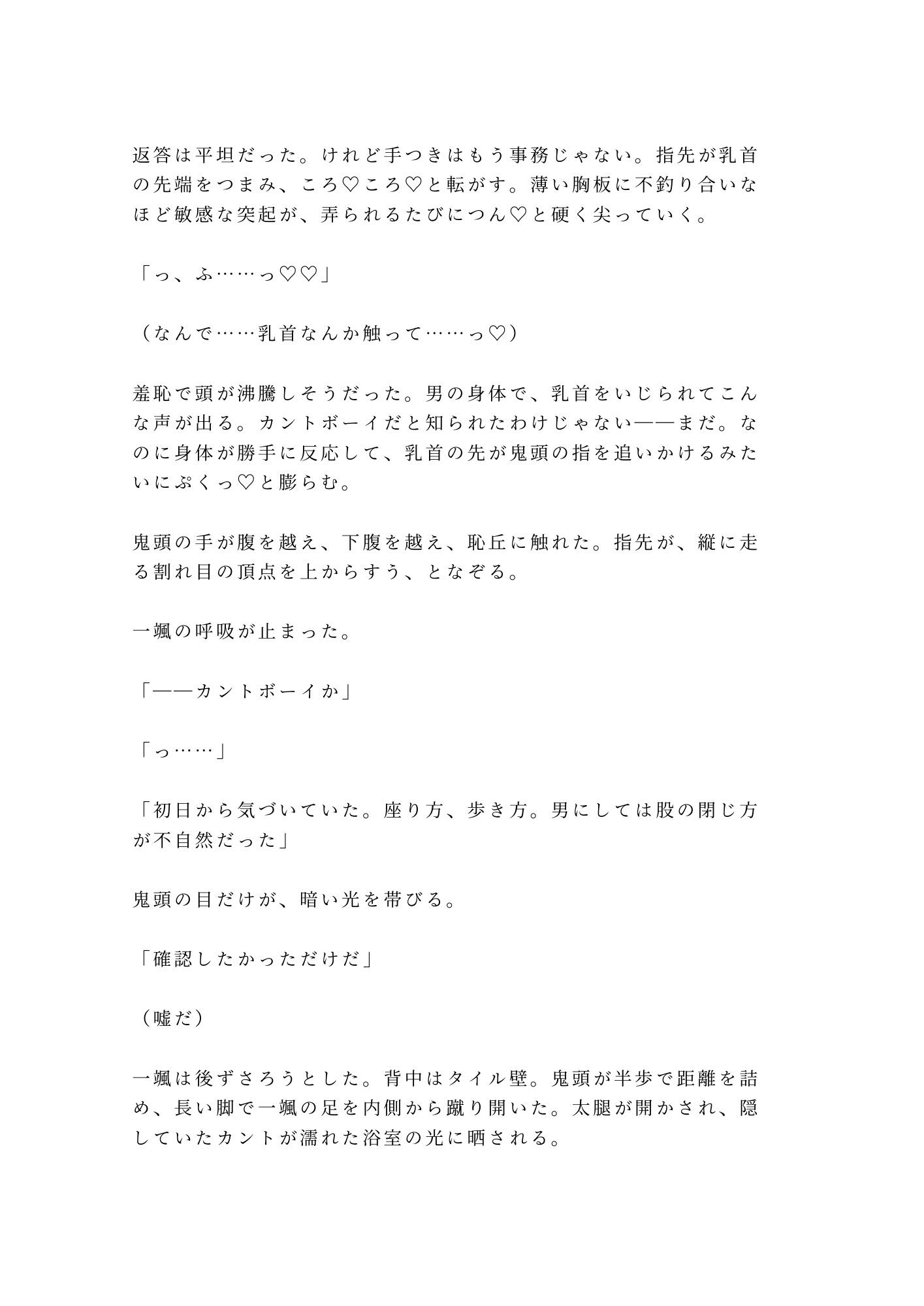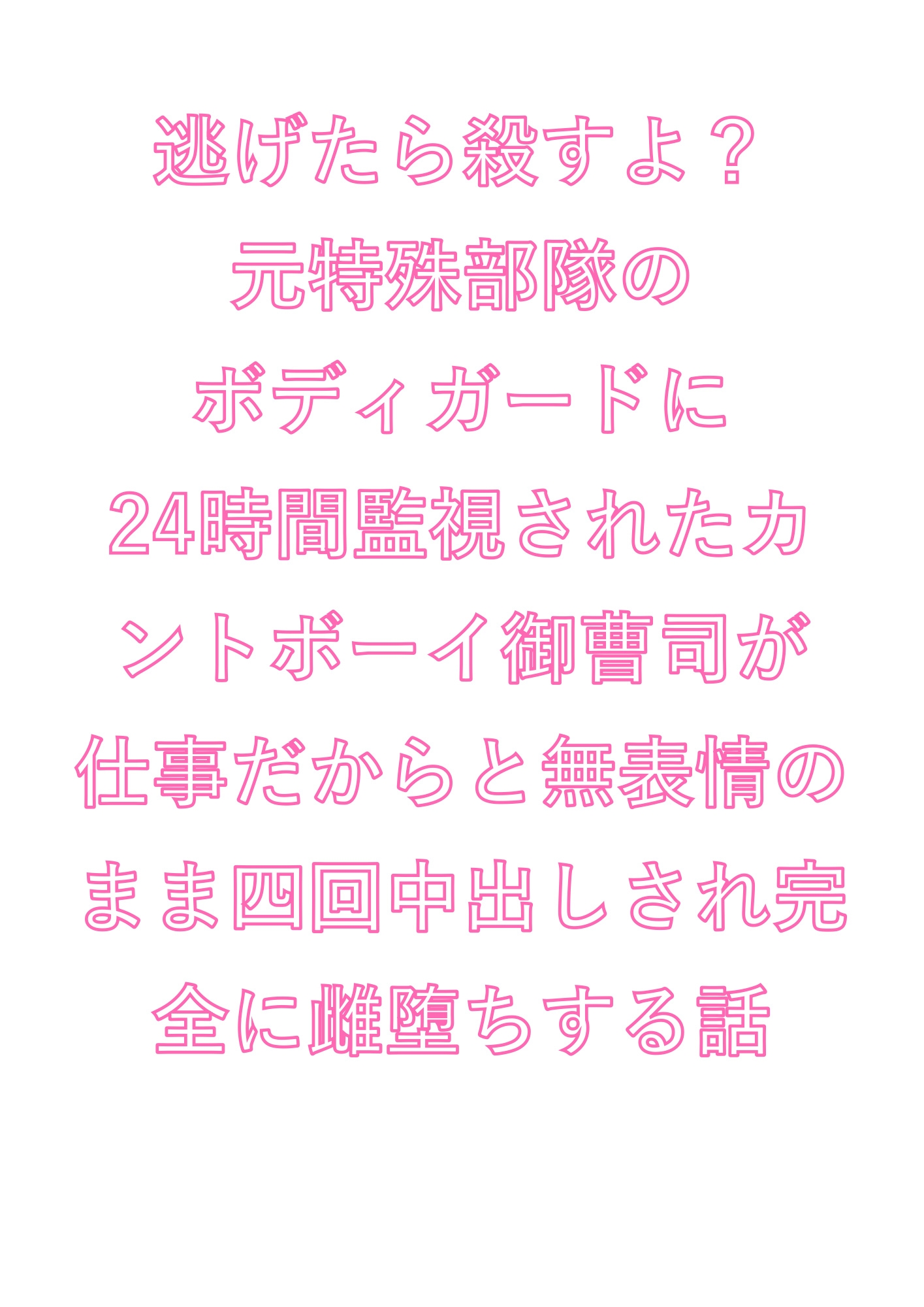 財閥の御曹司・一颯には誰にも言えない秘密がある——股の間に”カント”を持つ身体。脅迫事件を機に付いたボディガード・鬼頭は元特殊部隊の無表情な男。「仕事だから」の一言で浴室に踏み込まれ、秘密を暴かれた瞬間から、24時間の監視は身体の奥まで及ぶ。逃げ場なし、拒否権なし。事務的な手つきが快楽に変わるとき、御曹司のプライドは四回の中出しで完全に砕け散る。