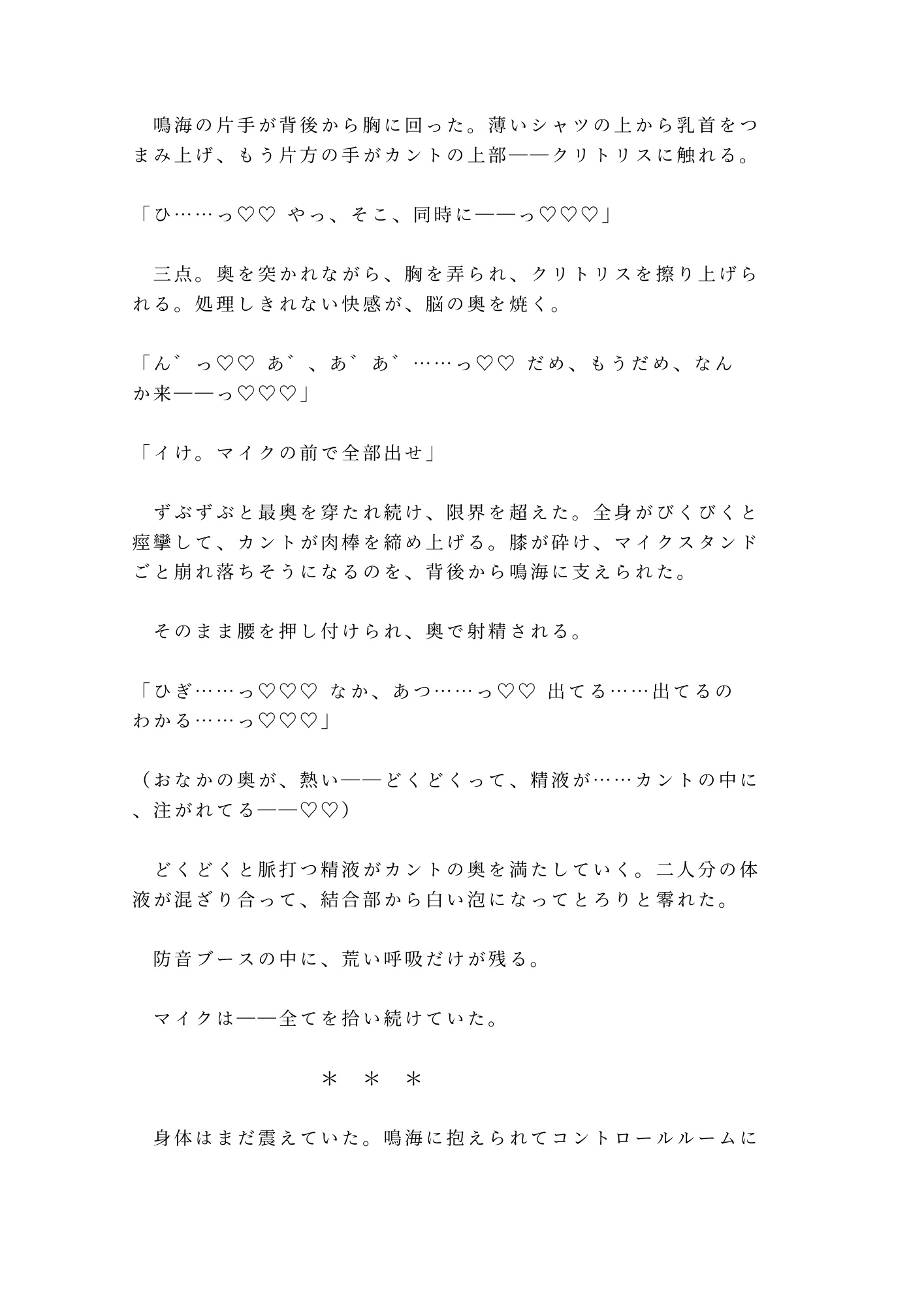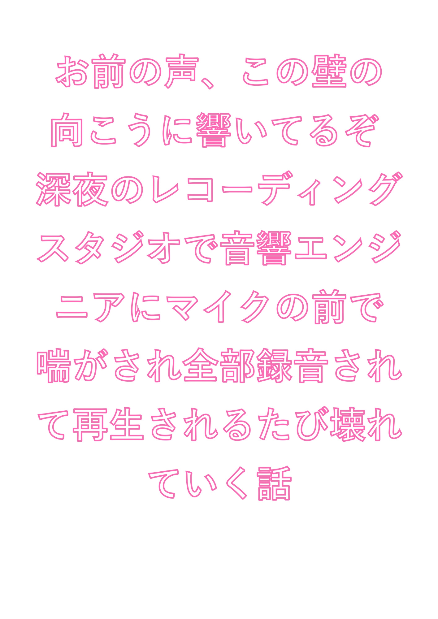 三テイク目のNGを告げた男が防音ブースに入ってきた瞬間から、深夜のスタジオは録音現場から調教部屋へと変貌する。呼吸指導と称して背後から身体に触れる大きな手。意図せず漏れた吐息をマイクが拾った瞬間、鳴海の目の色が変わった。「今の、もう一回」——そこから始まる、声と身体の完全支配。