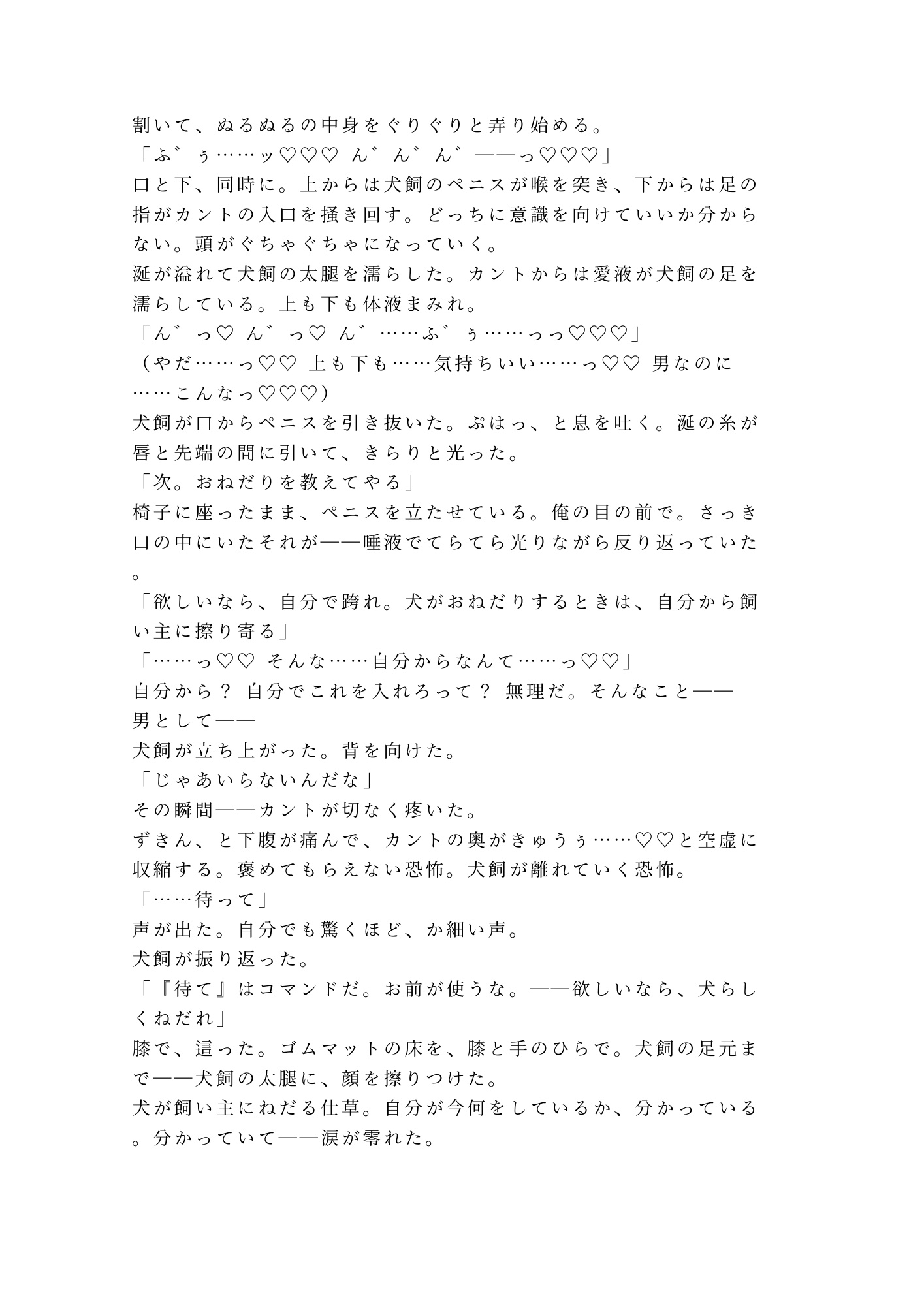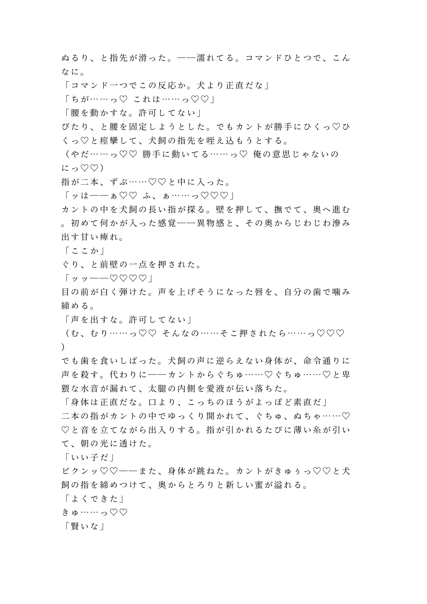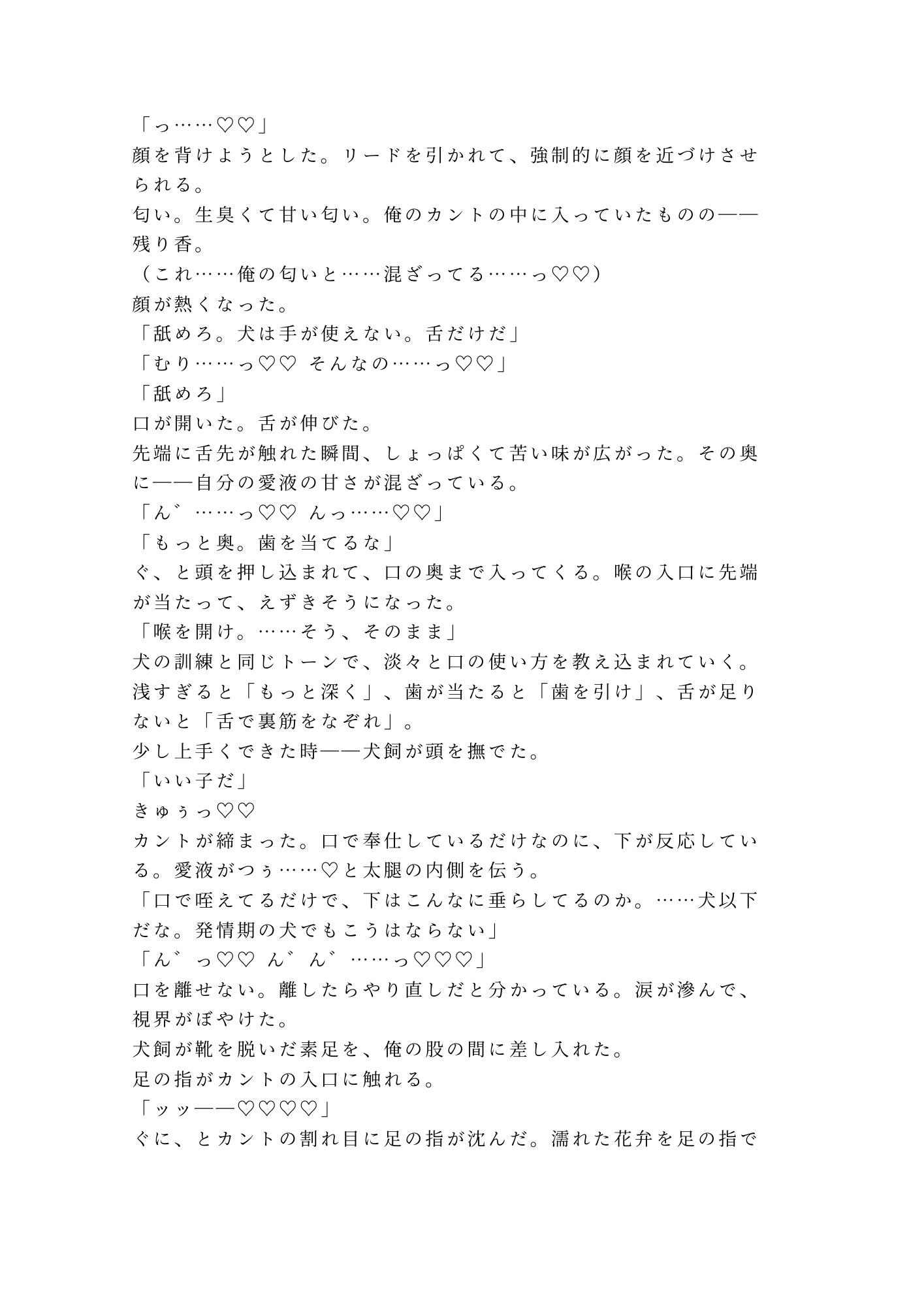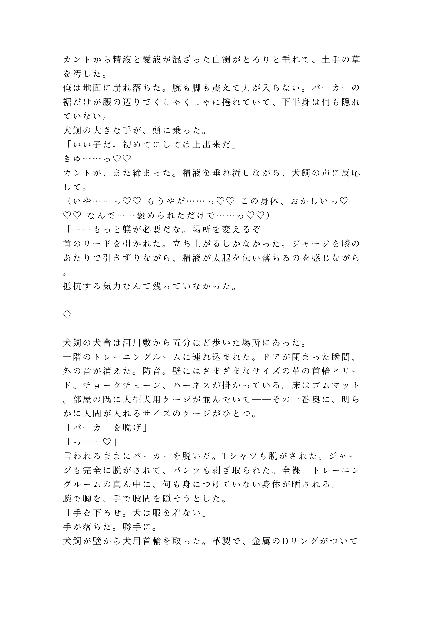 早朝の河川敷で逃げた犬を追いかけただけだった。なのに——「お座り」の一言で膝が折れた。ドッグトレーナー・犬飼礼司。その声に逆らえない身体が暴かれていく。首輪を嵌められ、四つん這いで犬の交尾体位を強いられ、「いい子だ」と褒められるたびにカントが勝手に蕩けていく。散歩代行バイトの青年が、四回の中出しで完全に雌犬へと堕とされる、過激カントボーイ調教譚