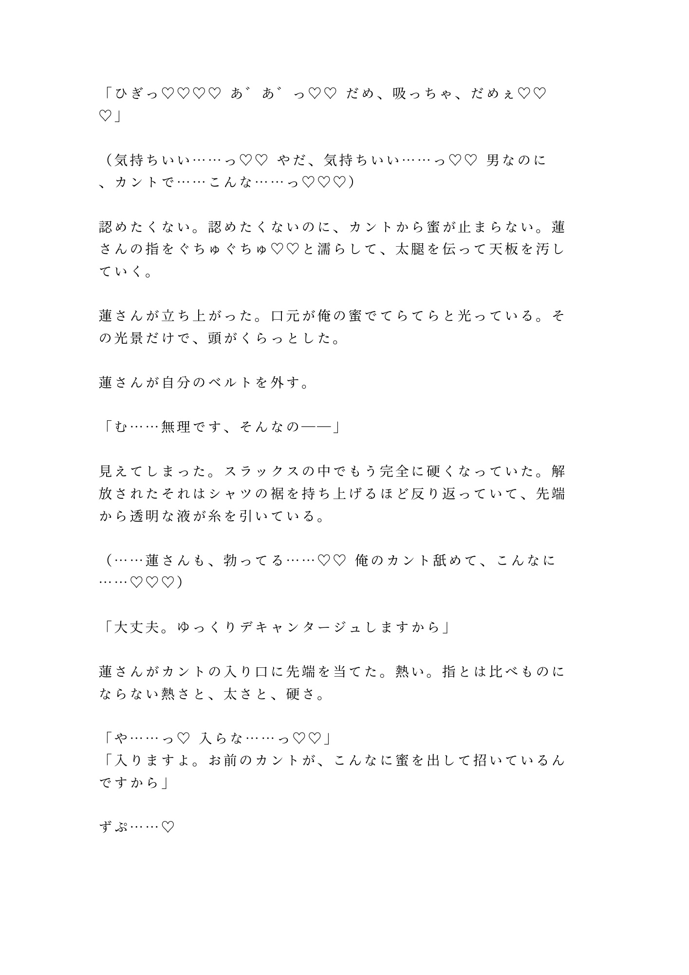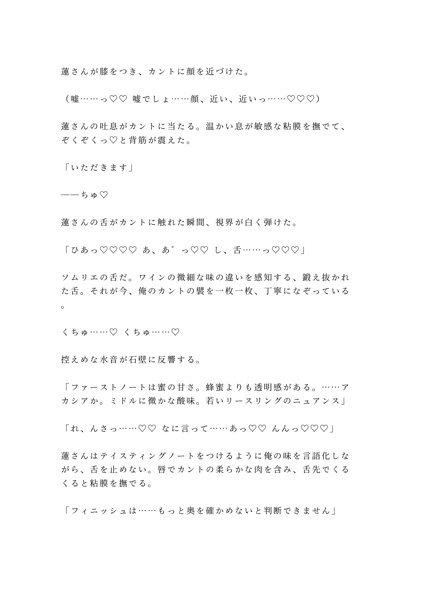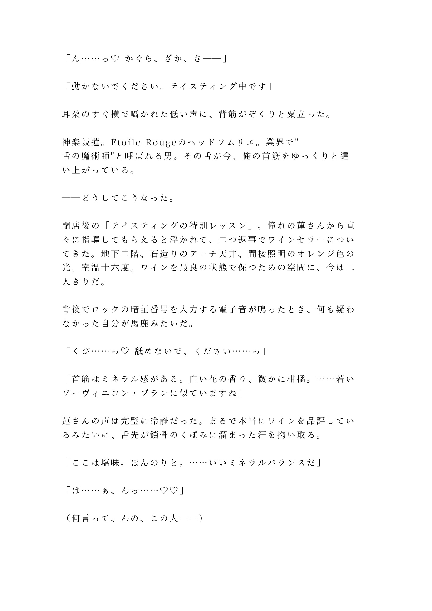 業界で"舌の魔術師"と呼ばれるソムリエの舌が、首筋から鎖骨、胸、そしてその先へ。ワインの品評と同じ精密さで全身を舐め尽くされ、触れたことすらなかったカントの味まで暴かれていく。テイスティングノートをつけるように湊の味を言語化しながら、蓮は一切の手加減をしない。